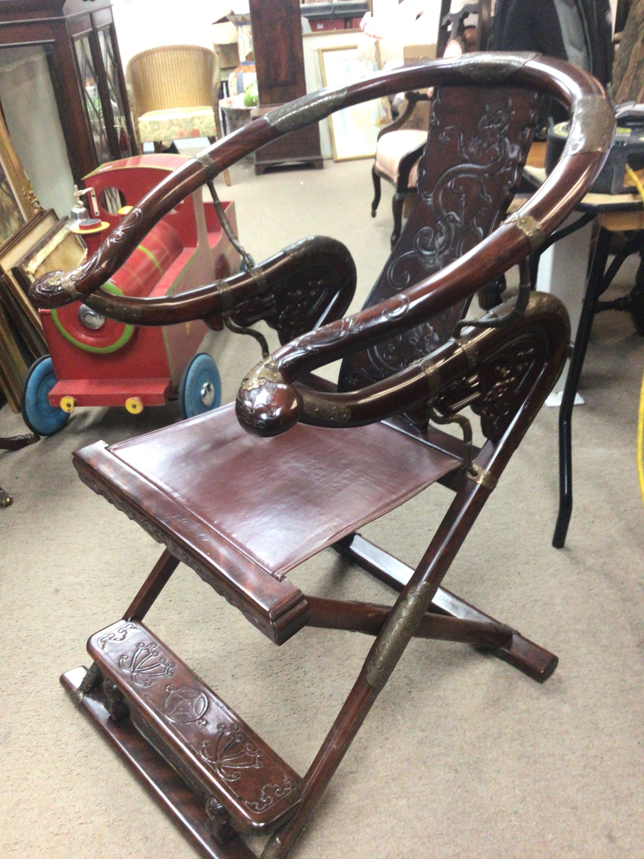 A quality Chinese folding hardwood and metal mounted chair with a leather seat. Height 97cm