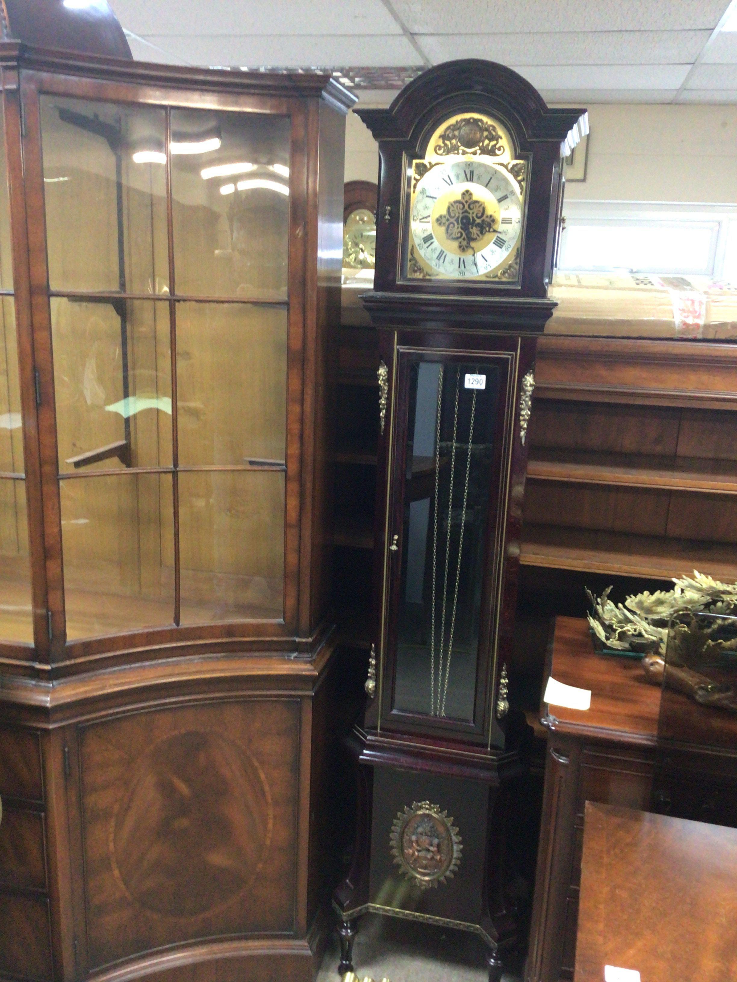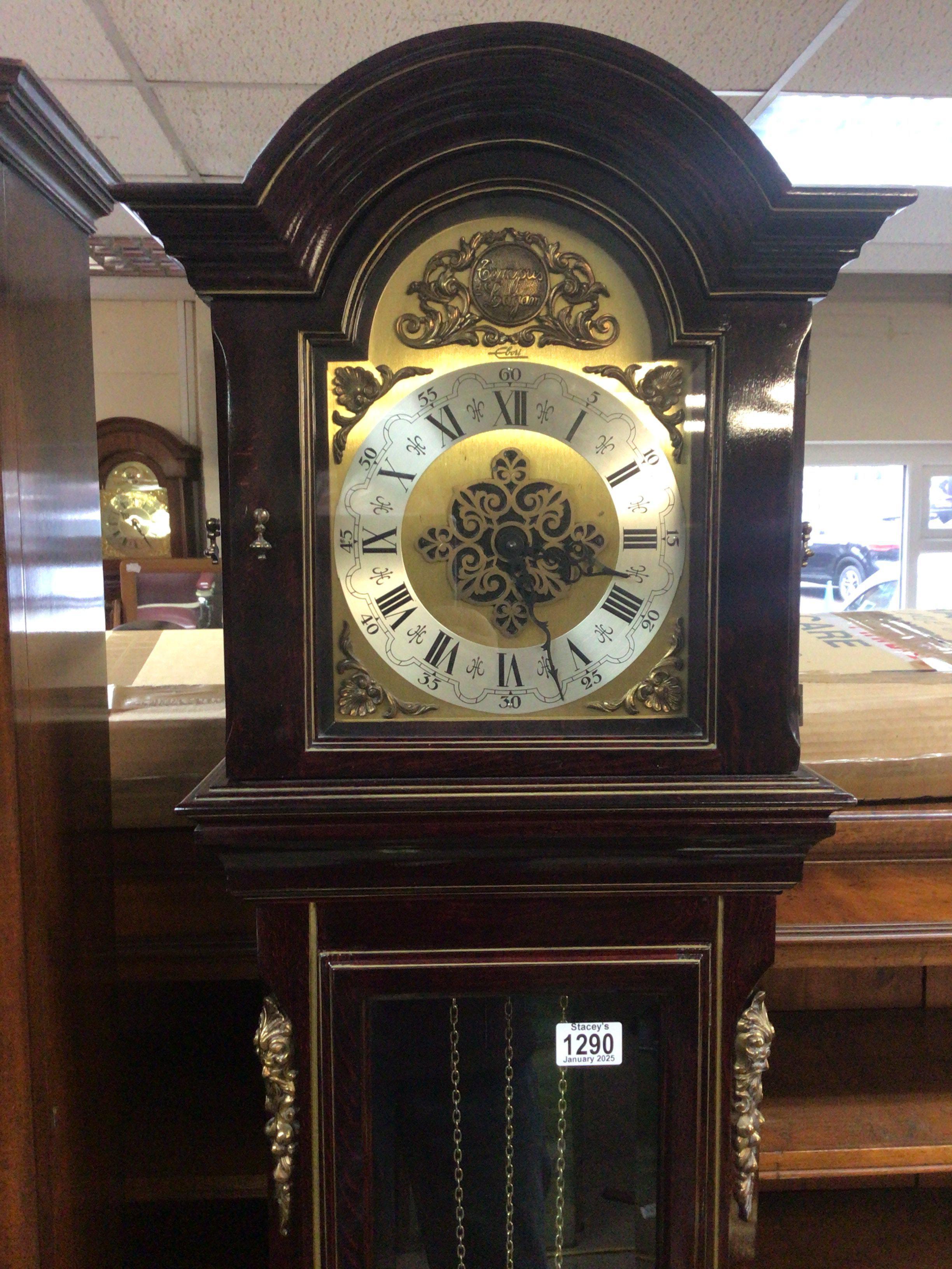 A Continental 20th century Mahogany longcase clock with gilt metal mounts pendulum and three weights.