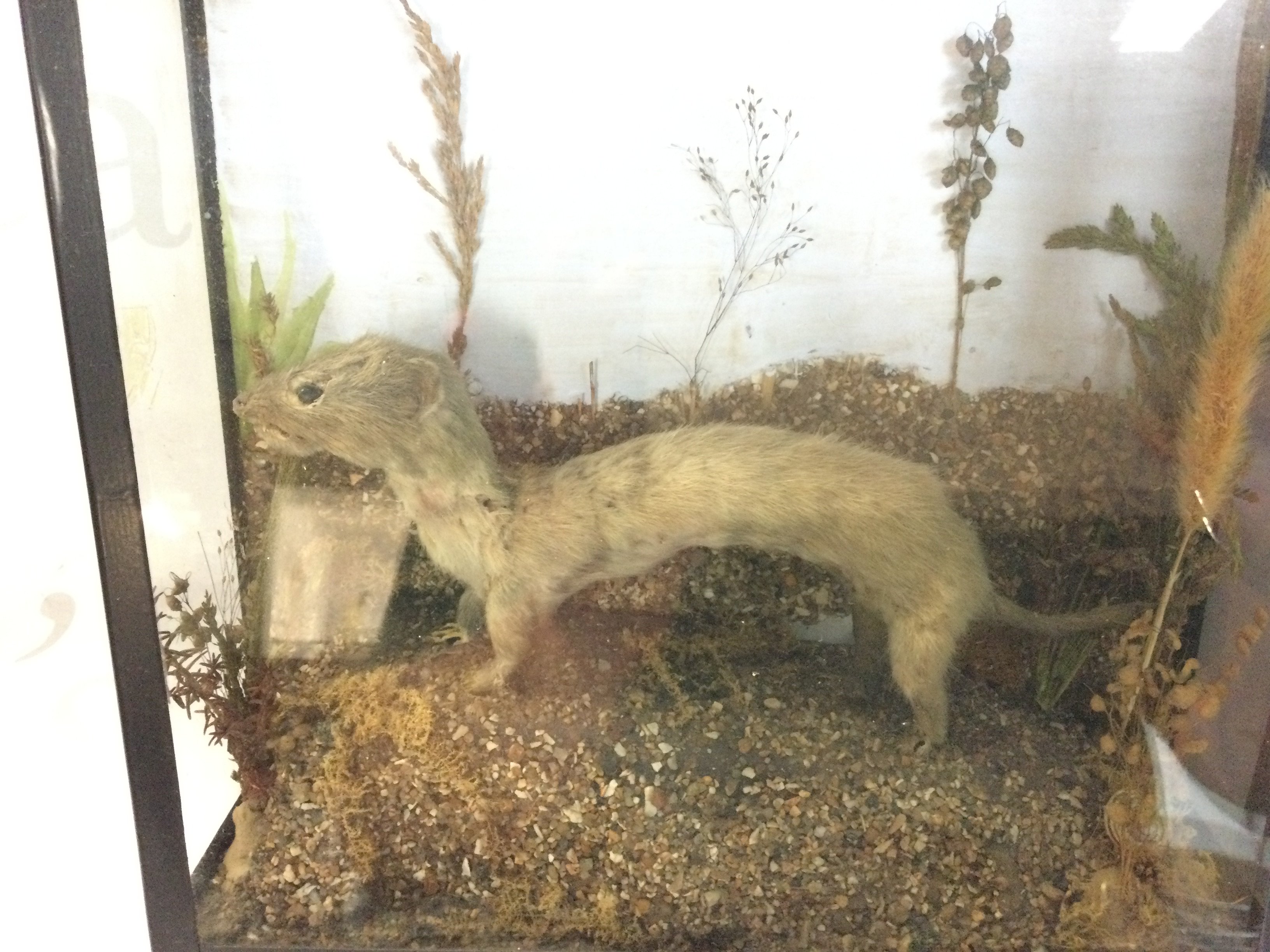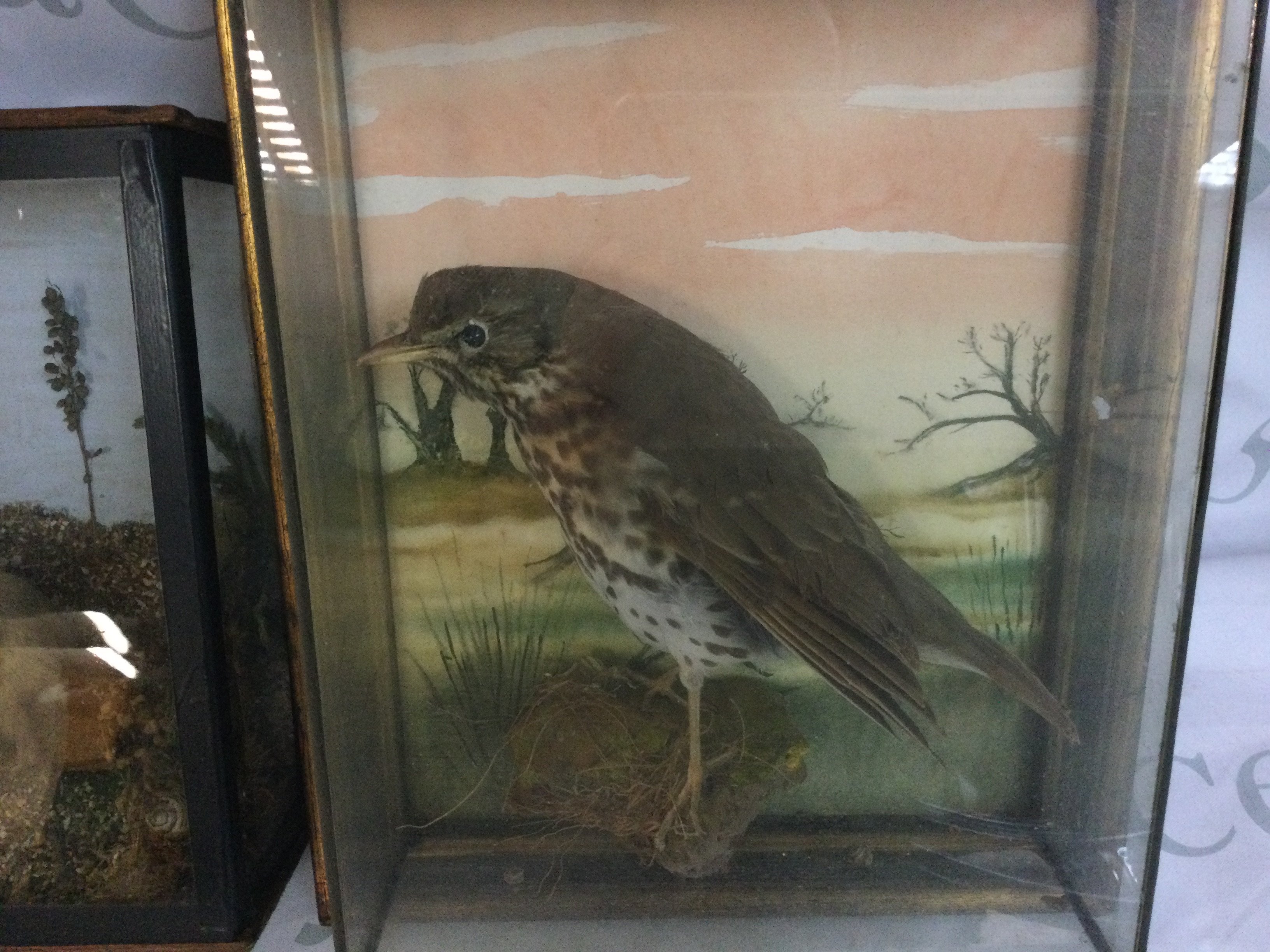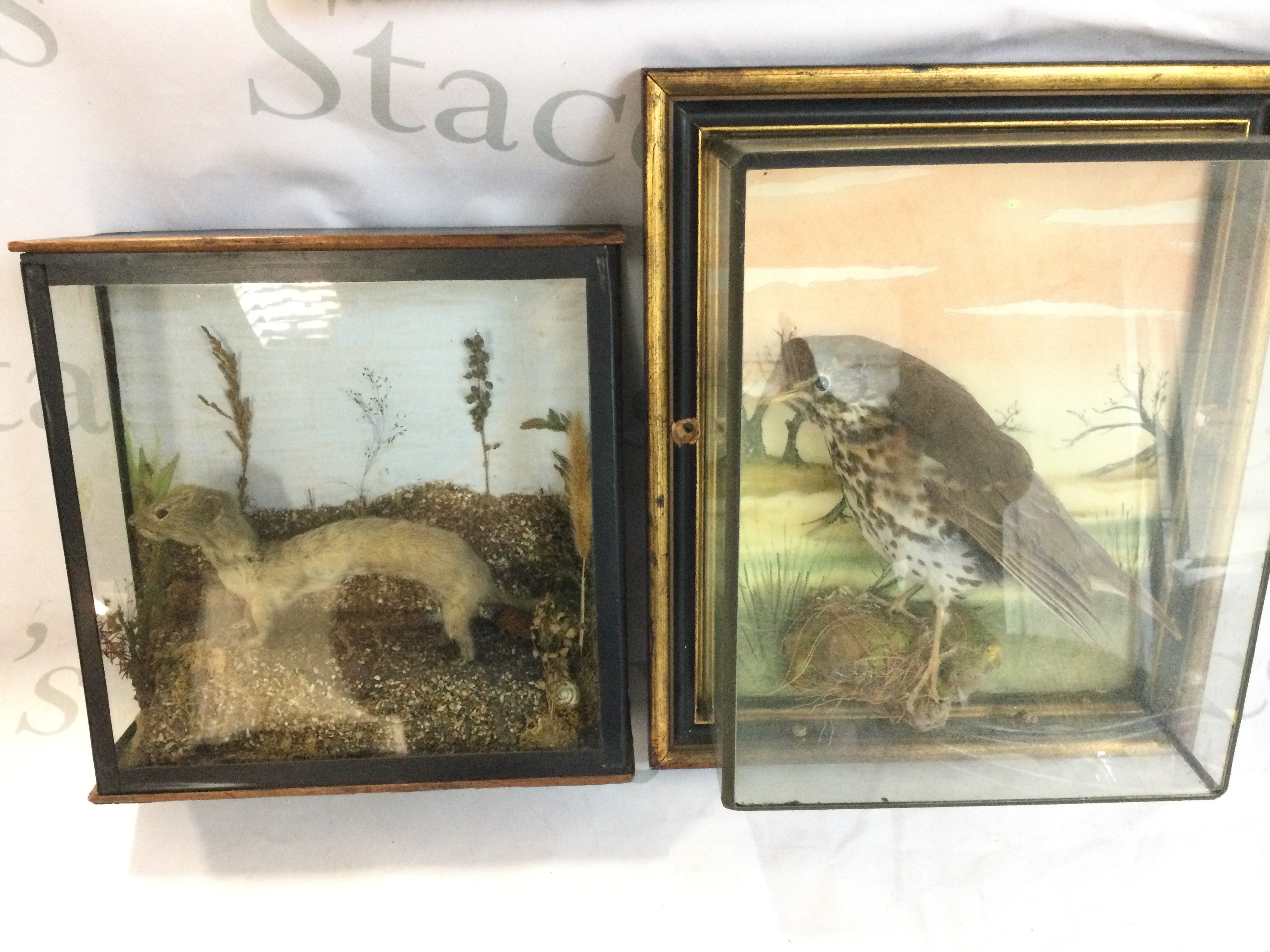 A framed taxidermy thrush and a framed stoat.