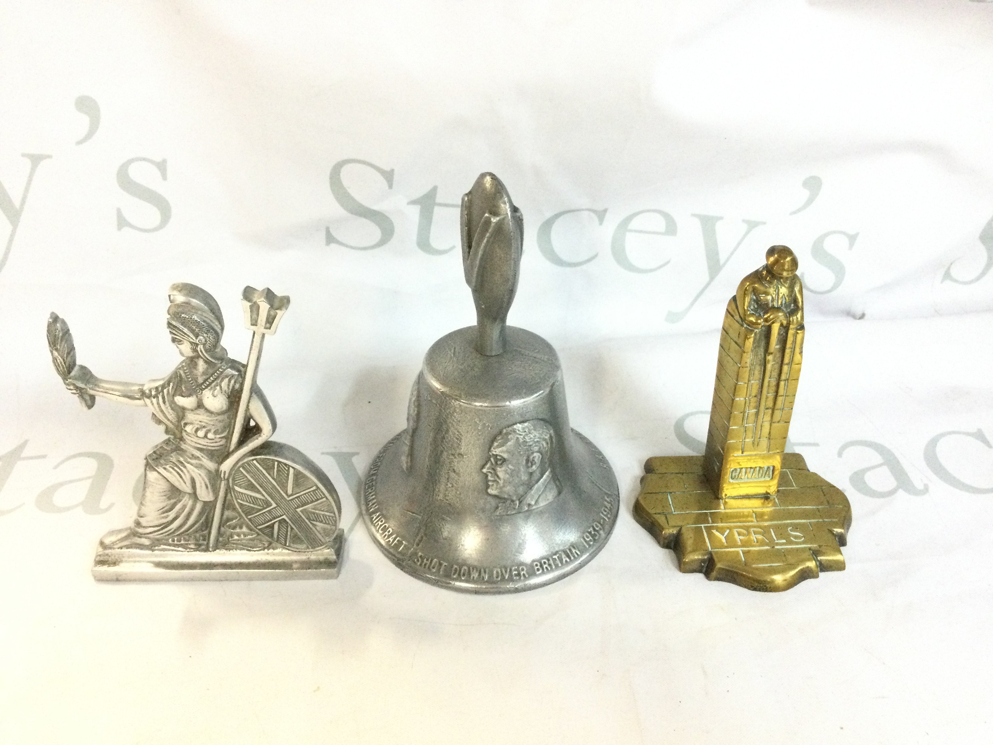 An aluminium Churchill Victory bell and a chrome Britannia along with a brass Canada trench art memorial cenotaph. Postage b