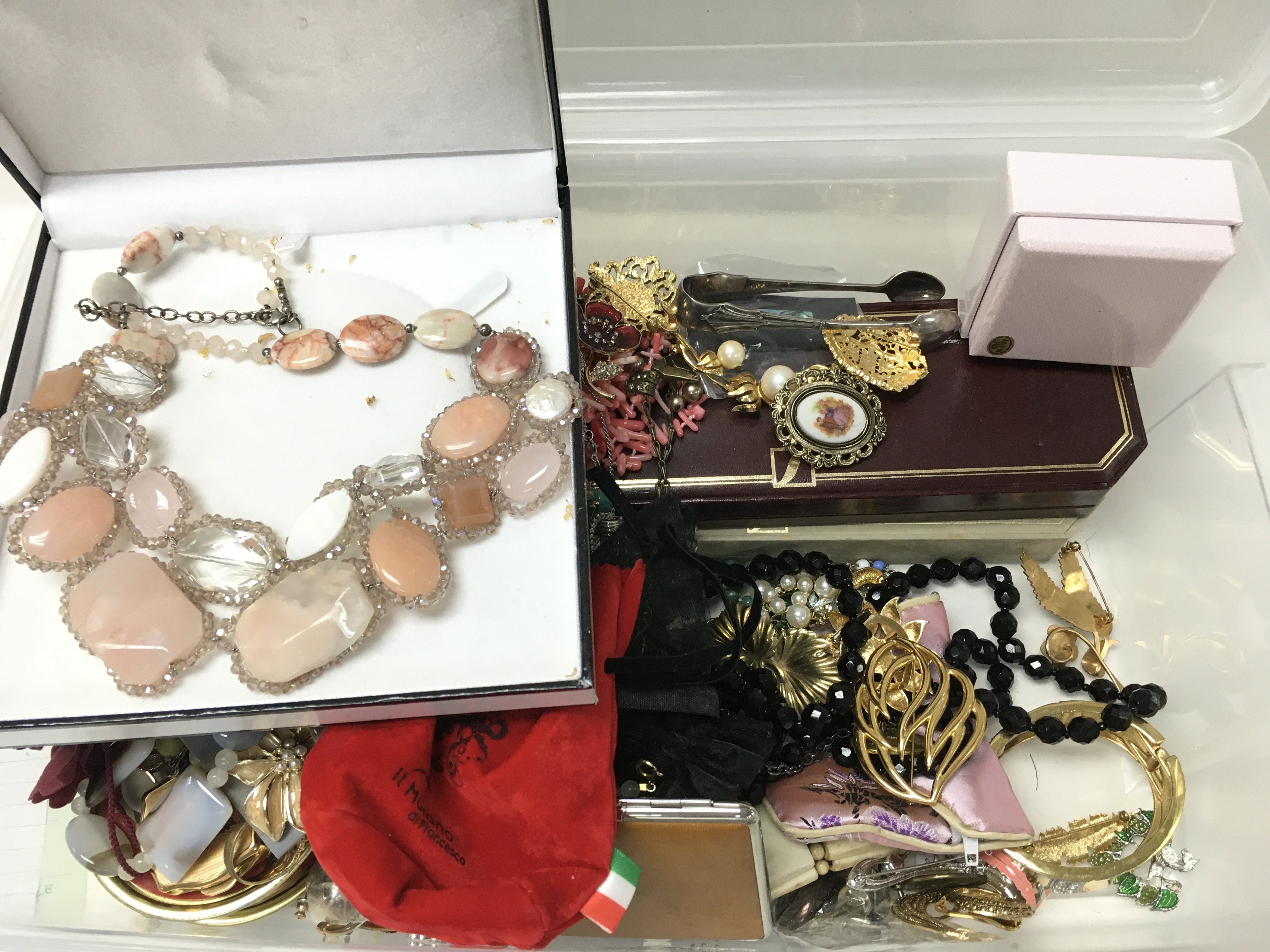 A box of costume jewellery including necklaces, brooches, pill boxes. Postage category C