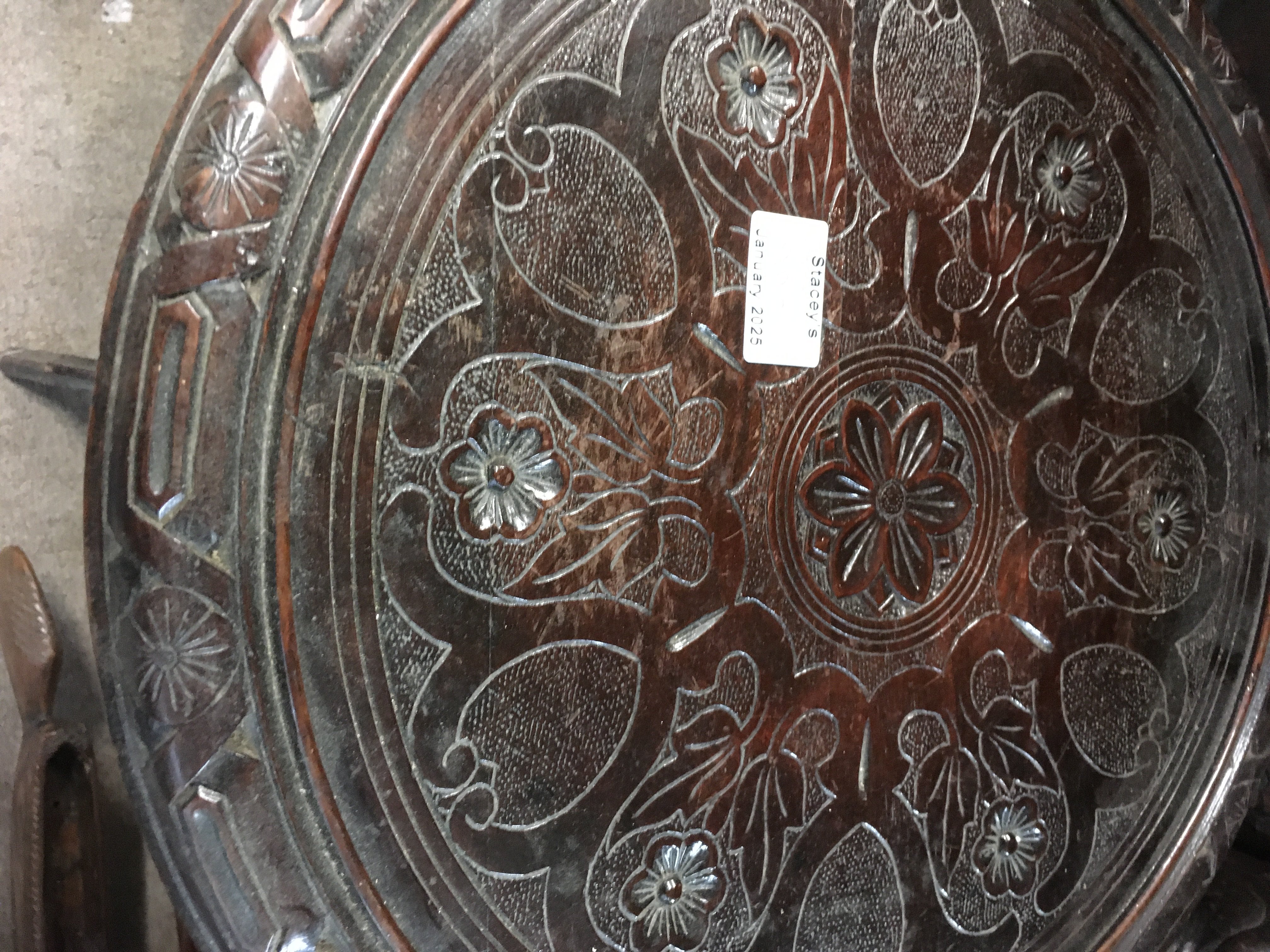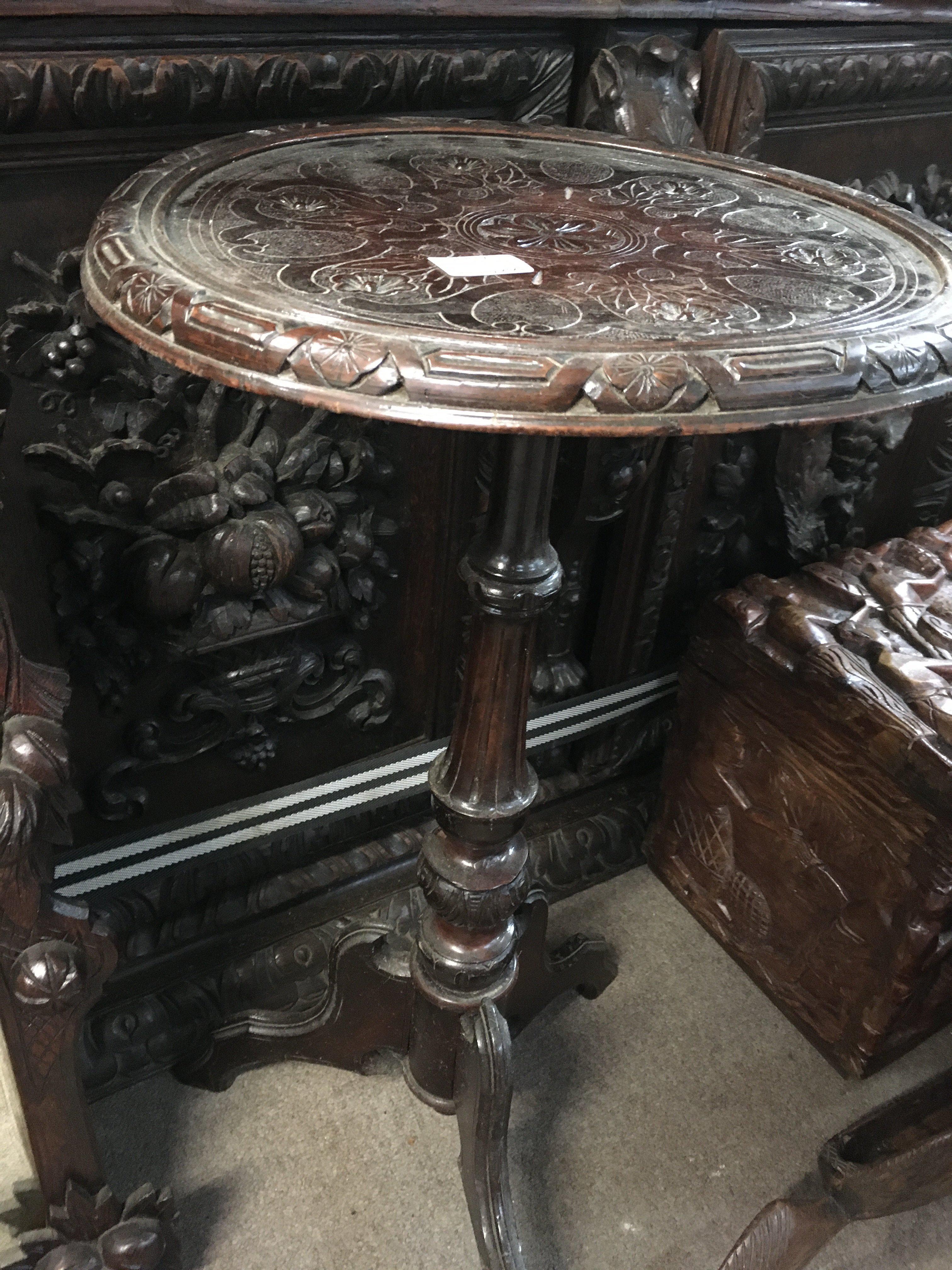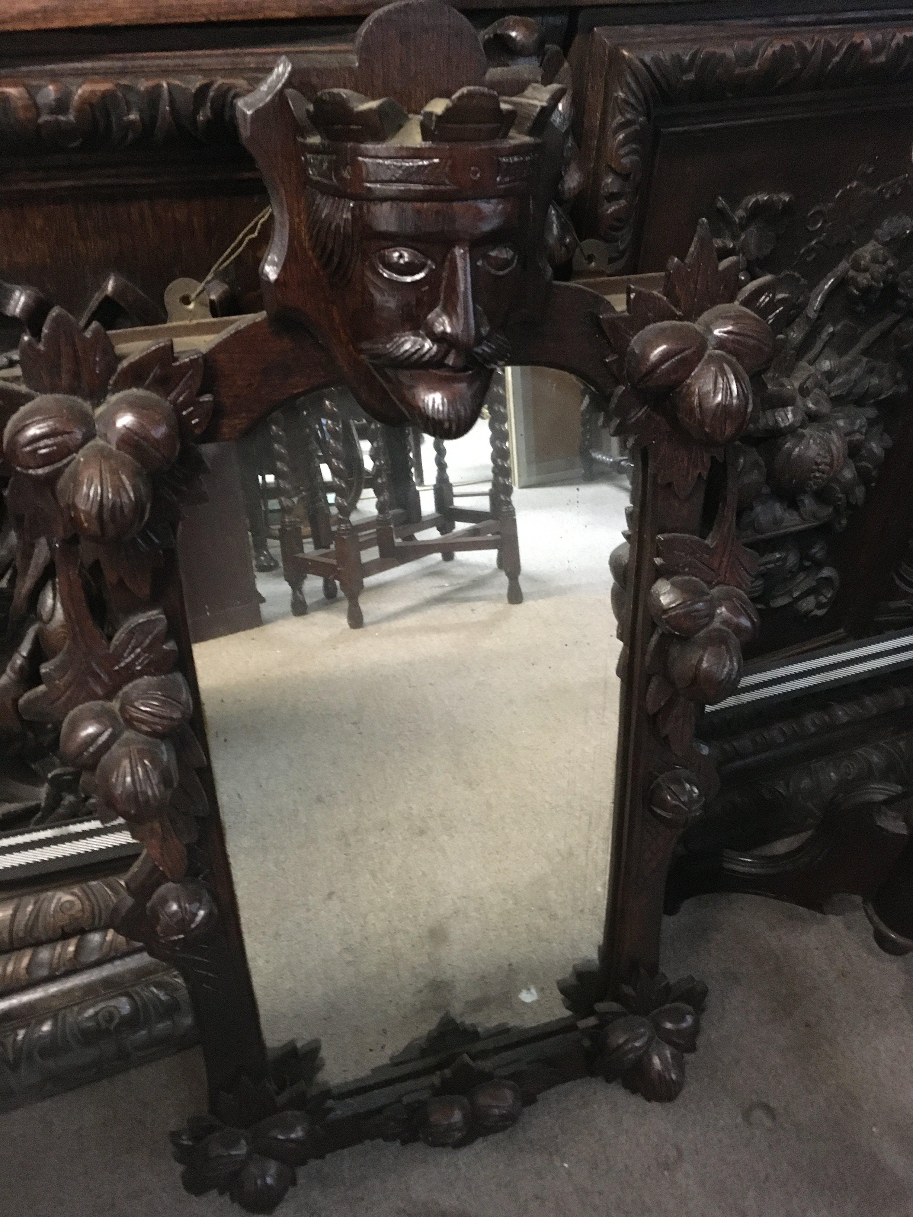 A small mirror carved with a figure head and a Victorian carved wine table .