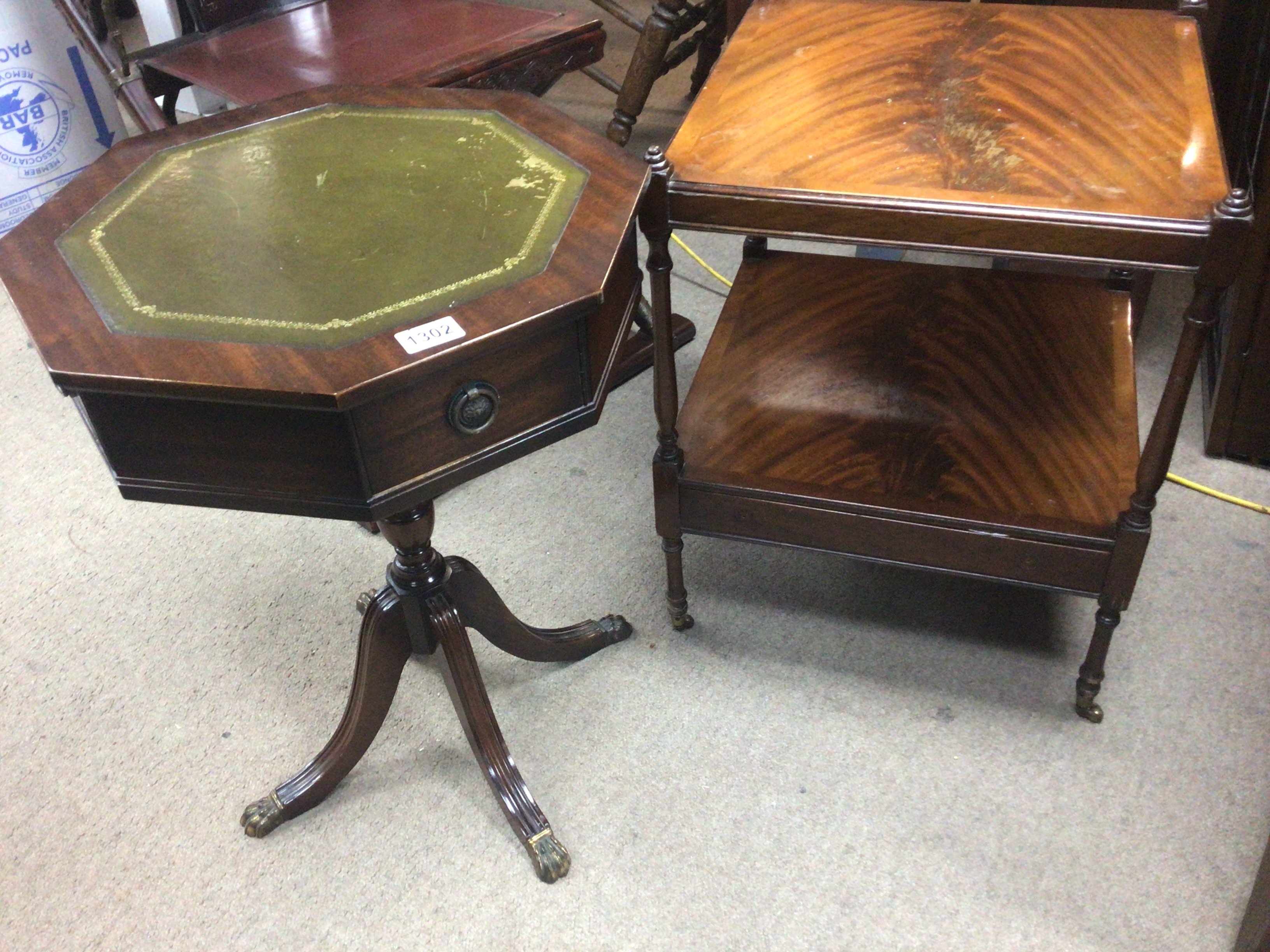 A Mahogany open display shelf and a mahogany occasional table with a leather top (2)