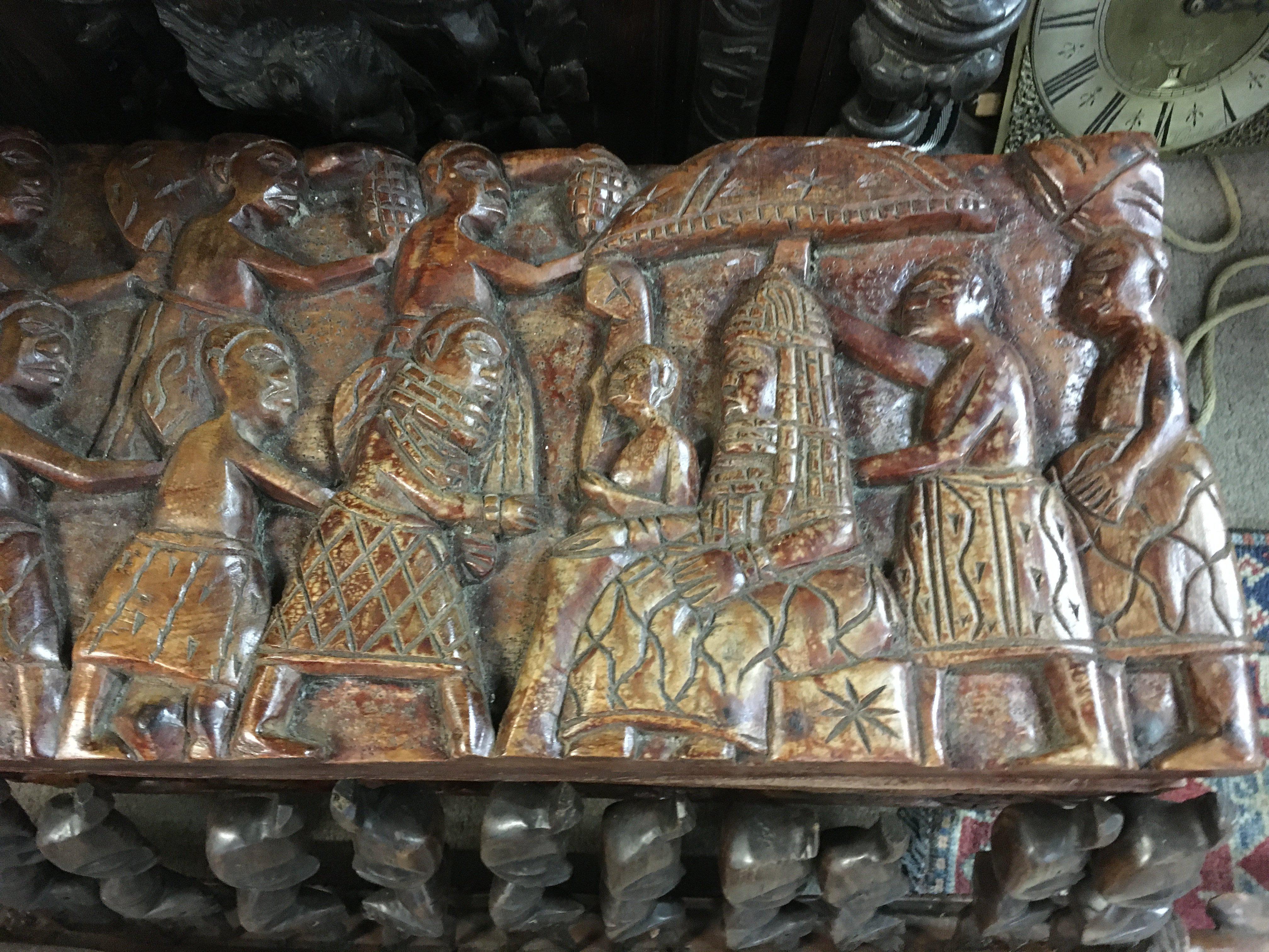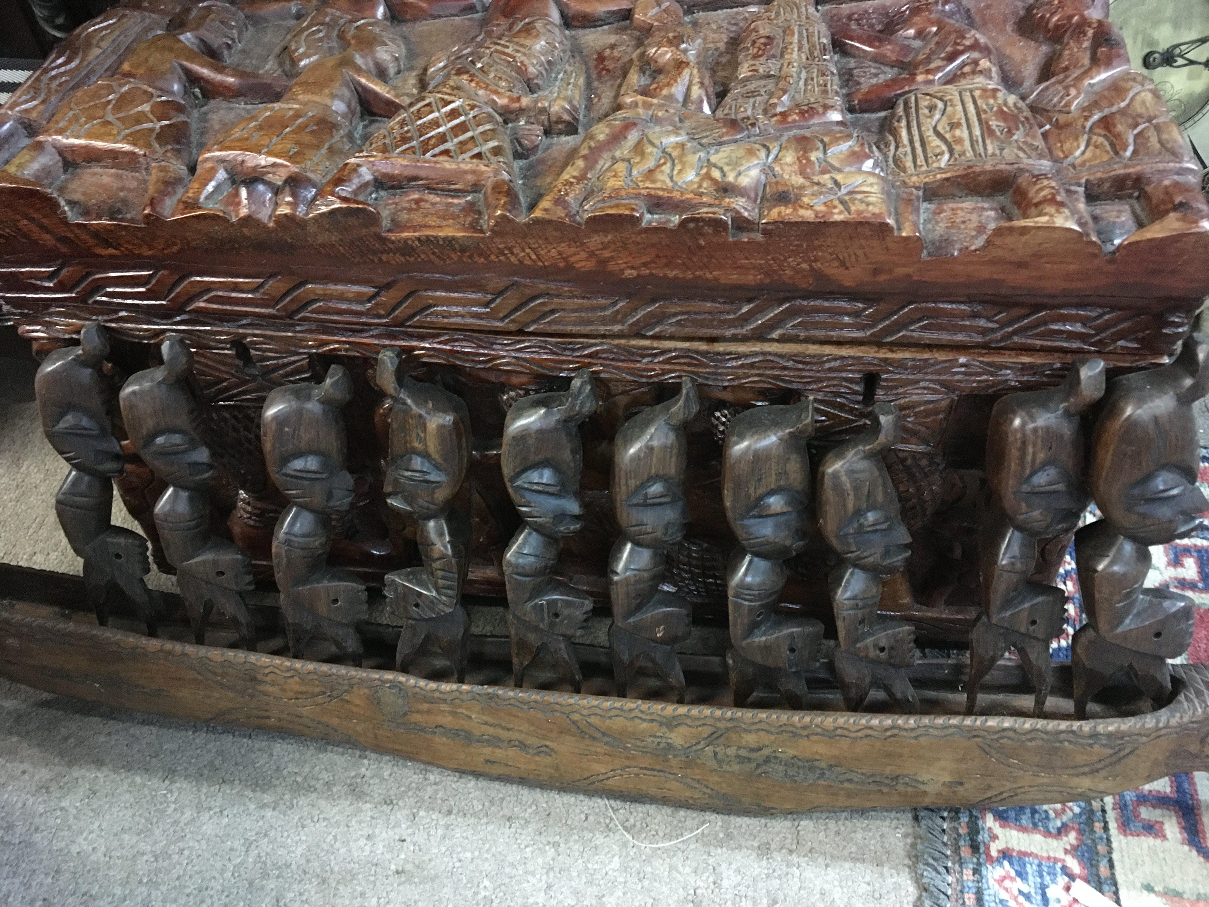 Two Small carved Boxes and a carving in the form of figures on a boat .