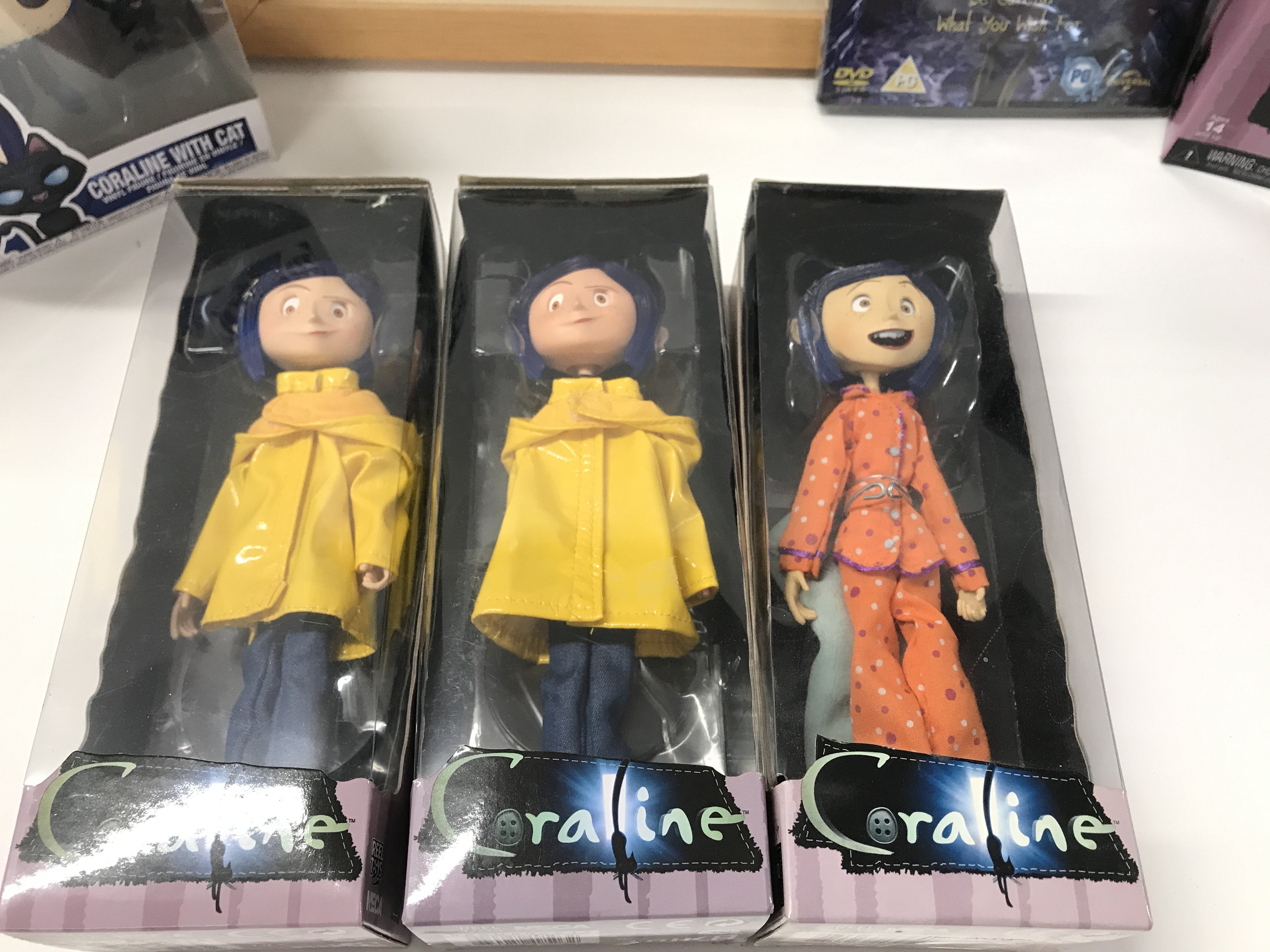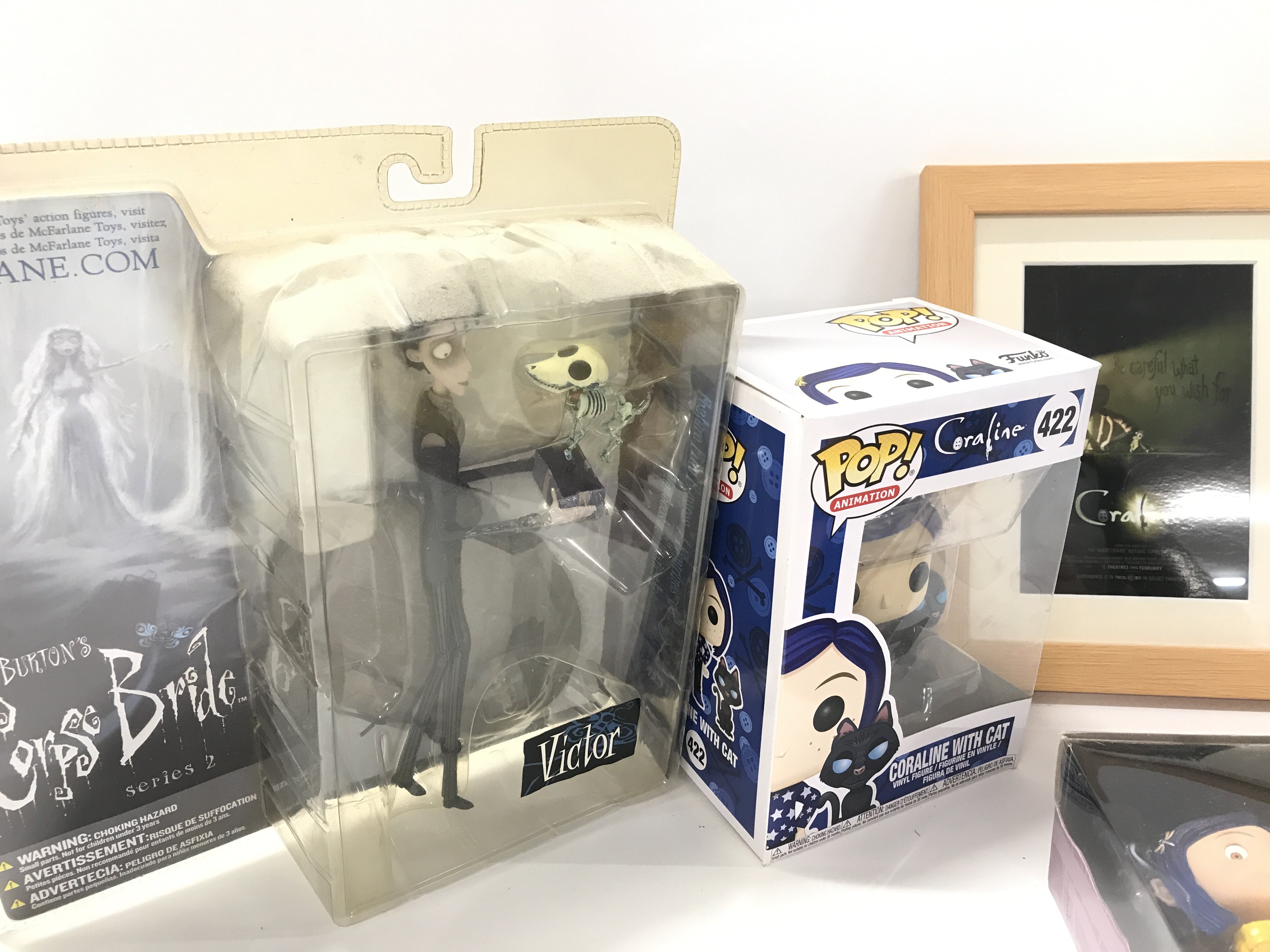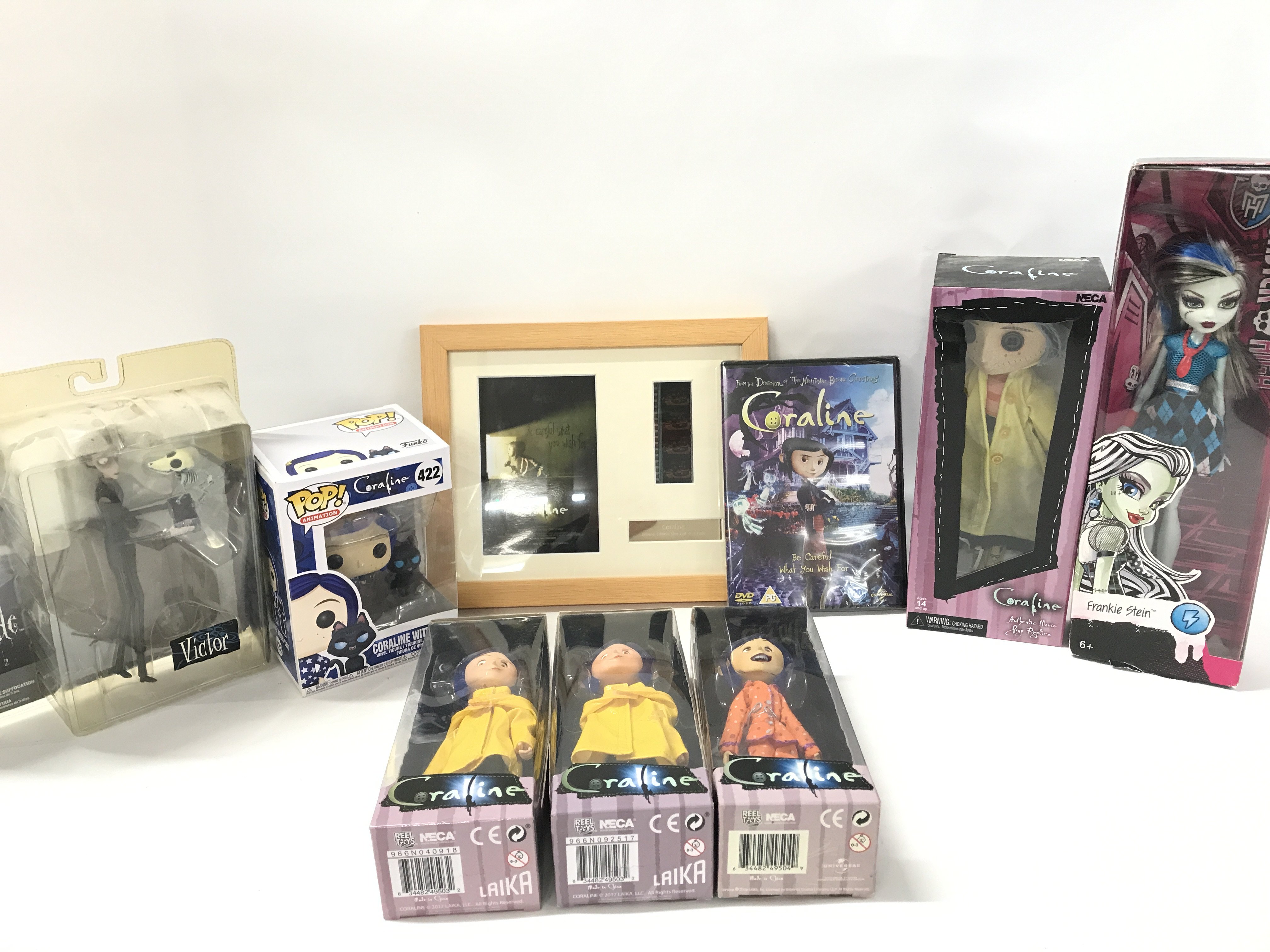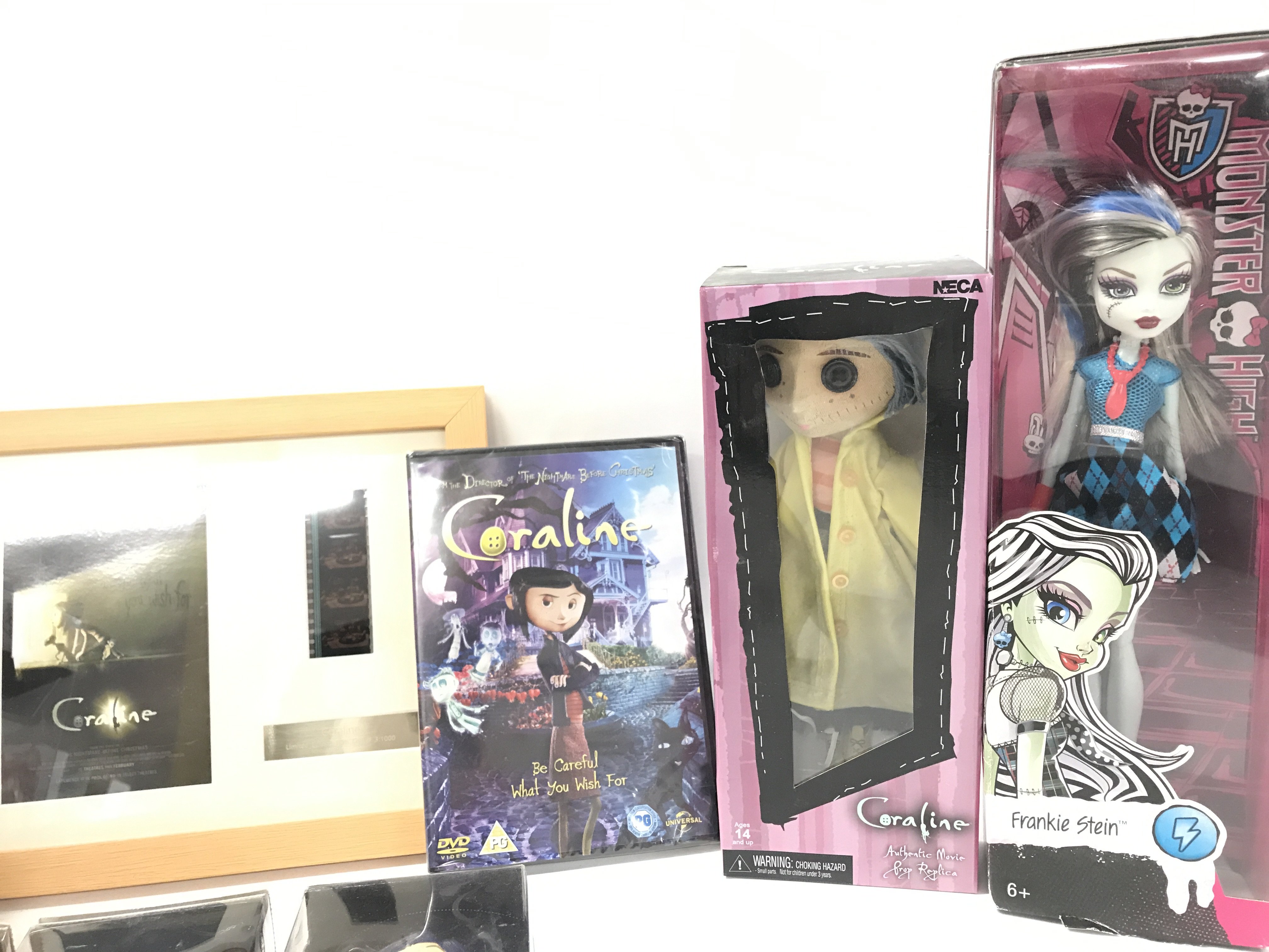 A Collection of Boxed Coraline Figures. A Coraline Framed Film Cell. A Monster High Frankie Stein Doll Etc.