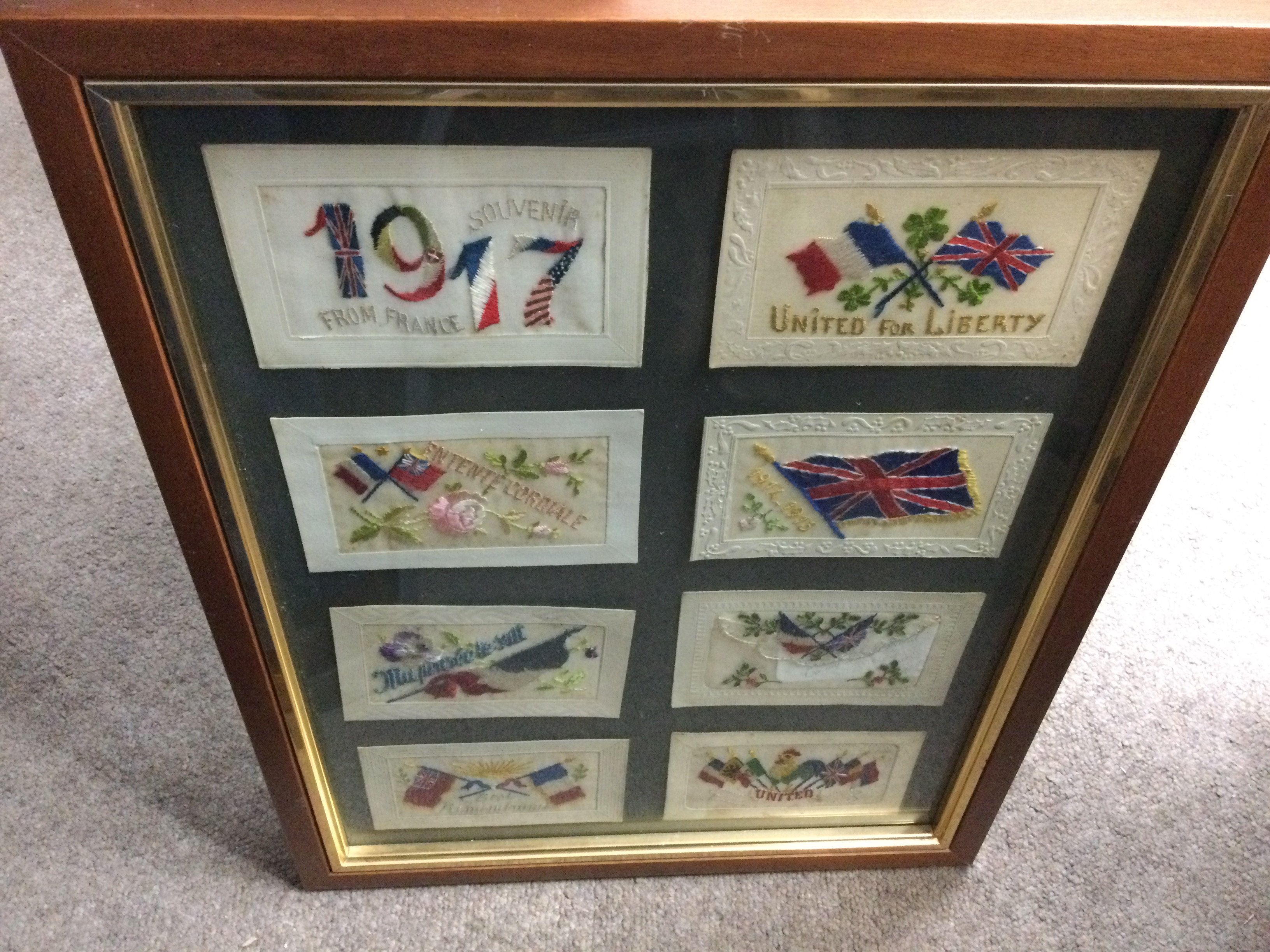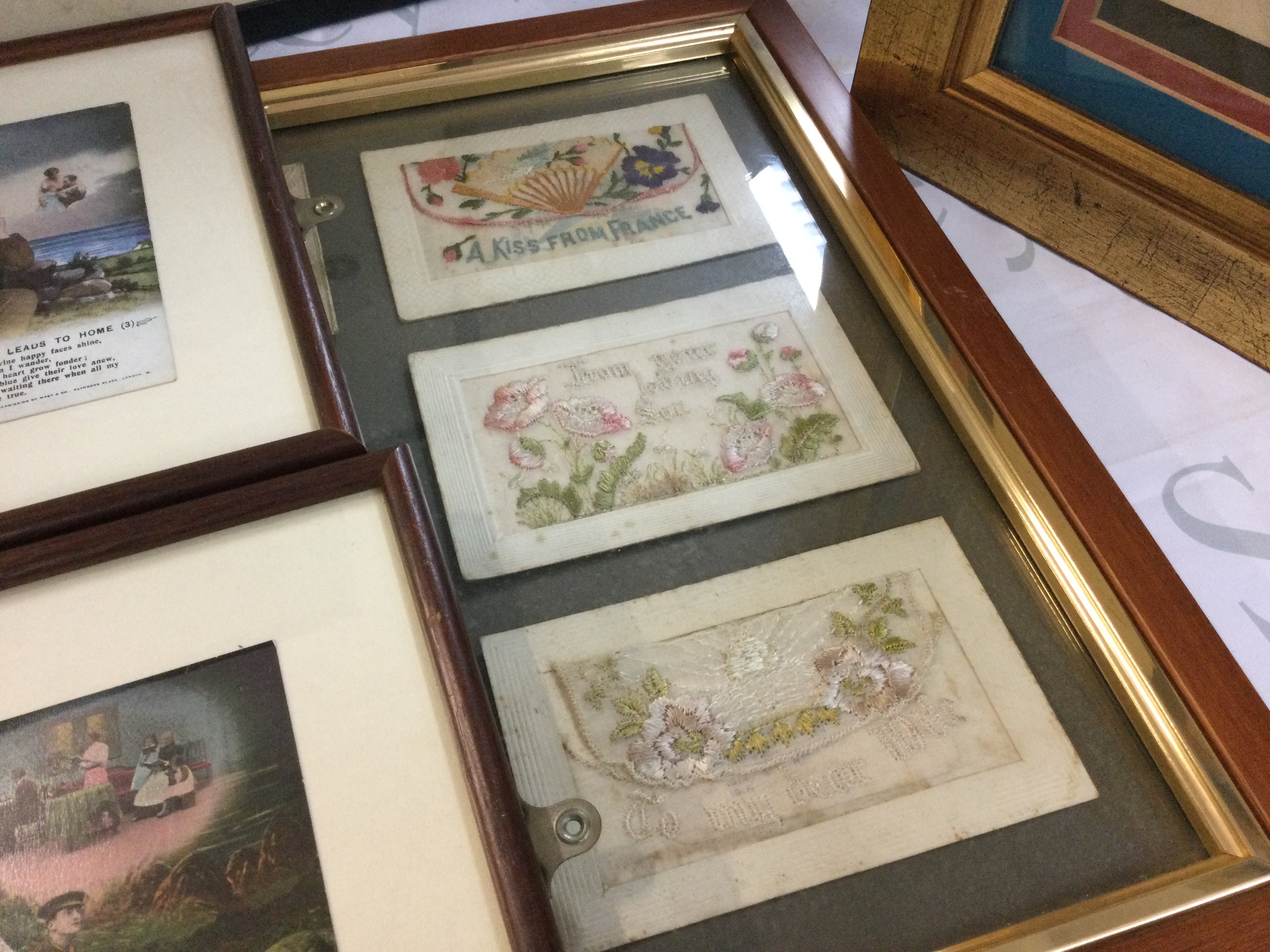 A collection of framed vintage silk postcards and roll or honour and world war 1 cards. Postage D