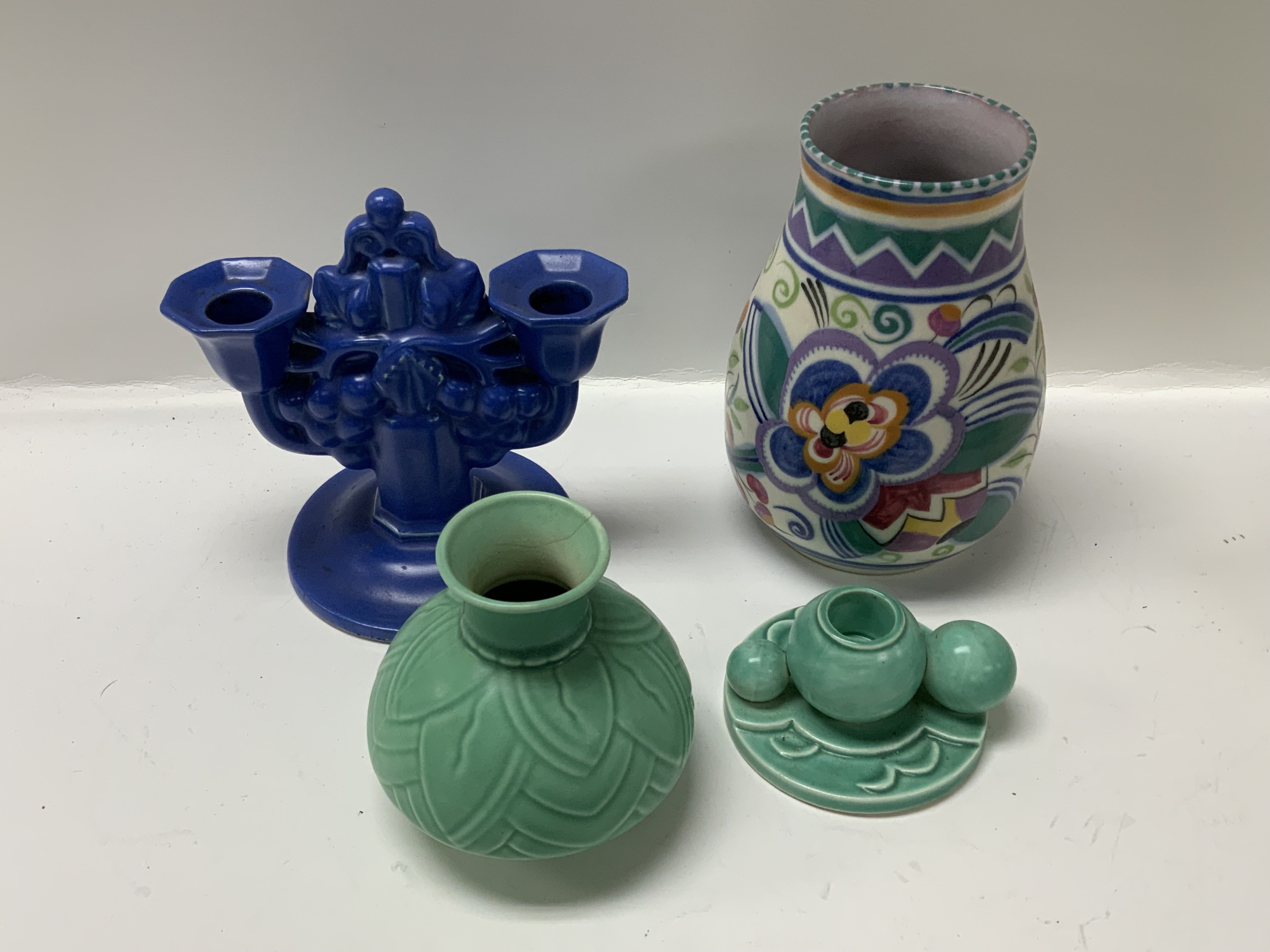 A John Adam’s Carter, Stabler and Adam’s double candlestick with blue glaze, Poole pottery vase together with 2 additional art deco ceramic items.
