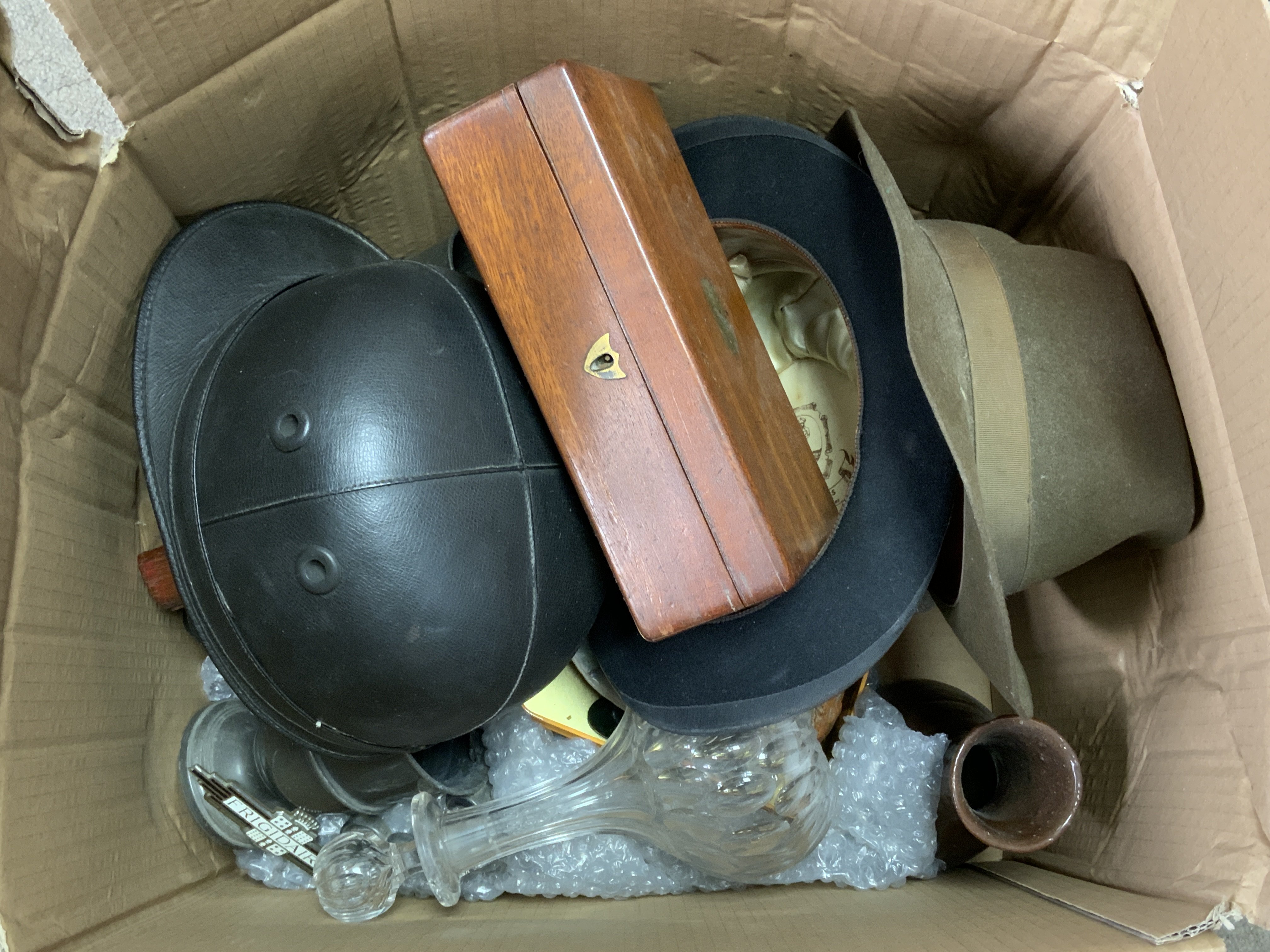 A box of various odds to include a driving helmet, ceramic, pewter etc.