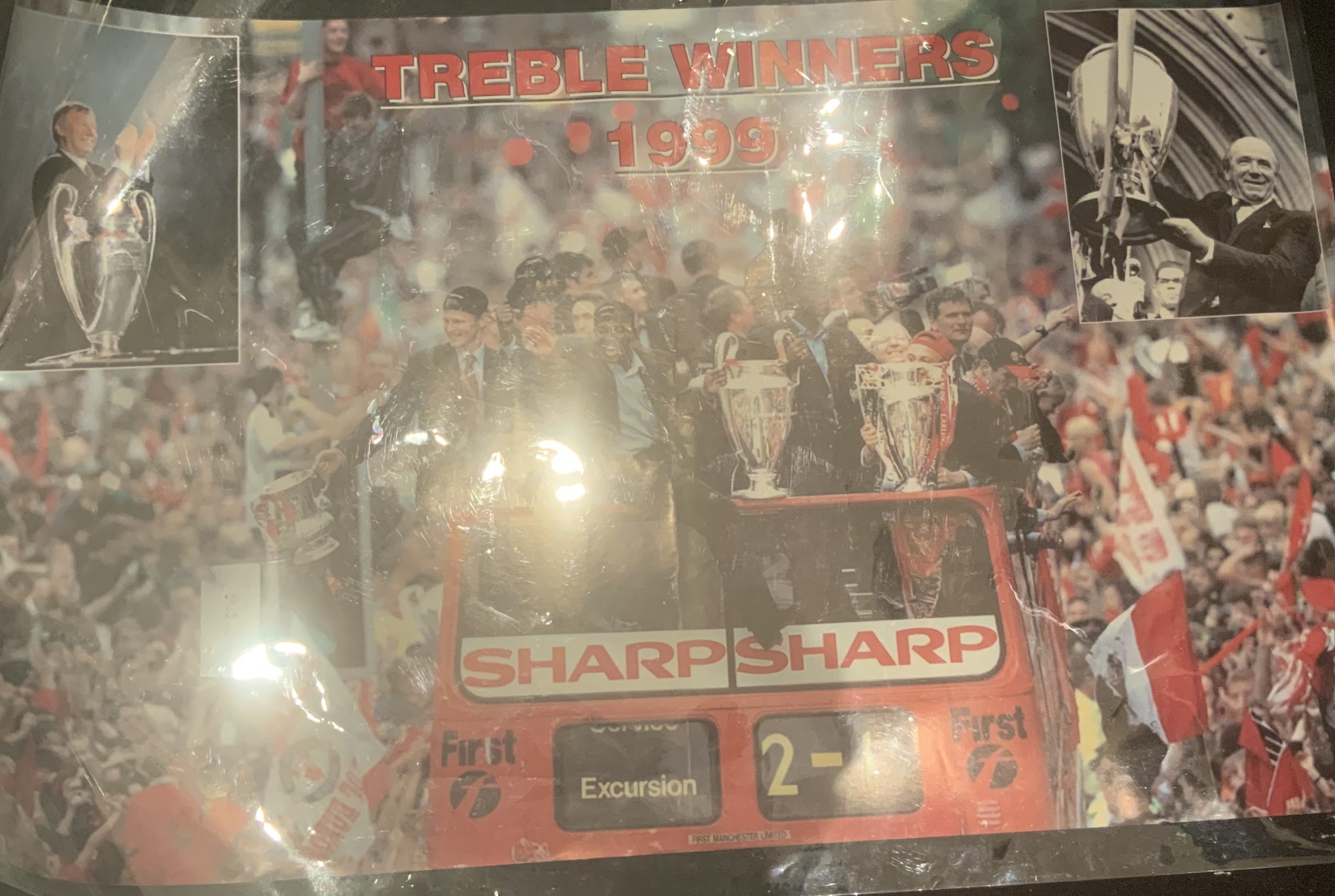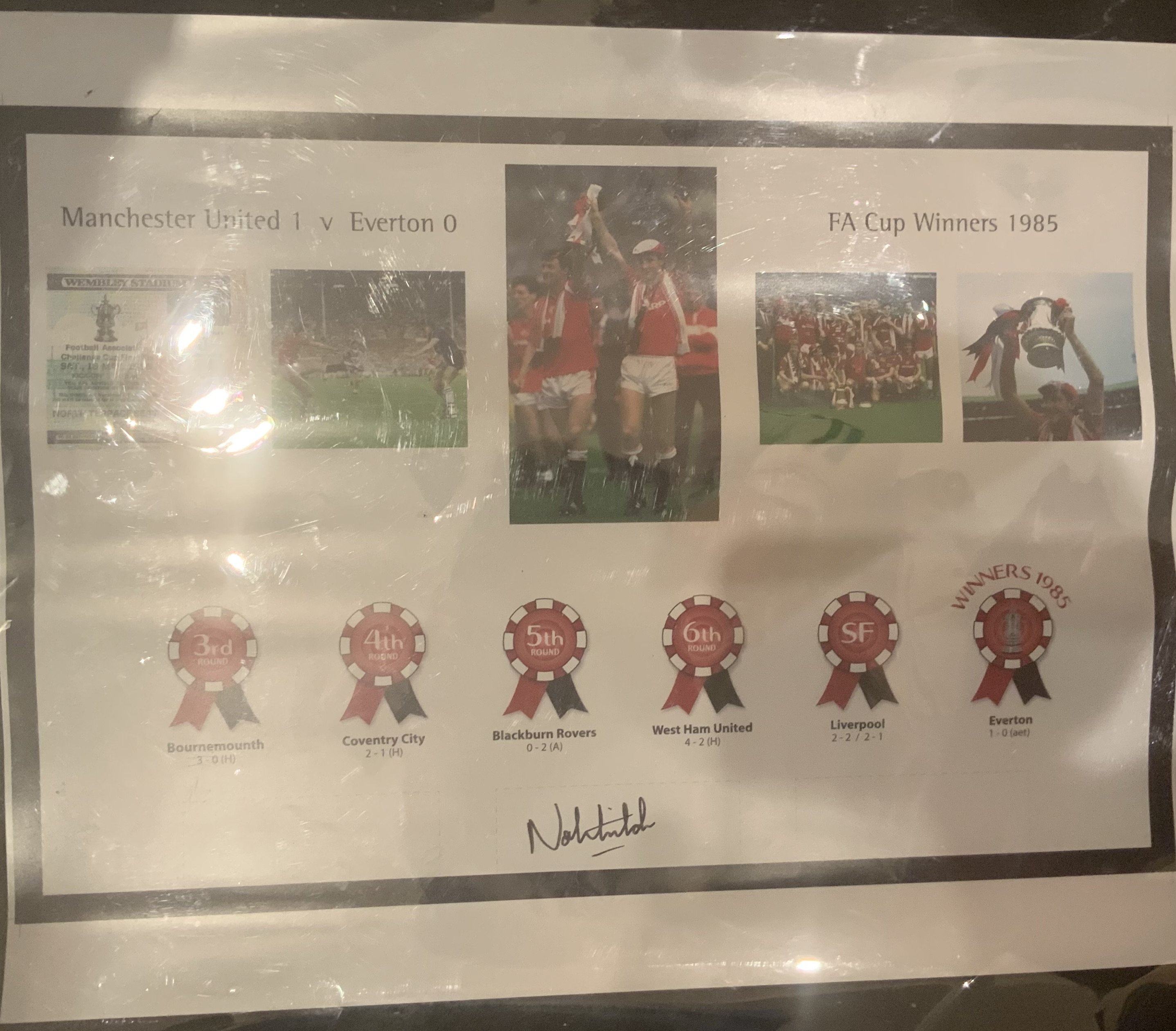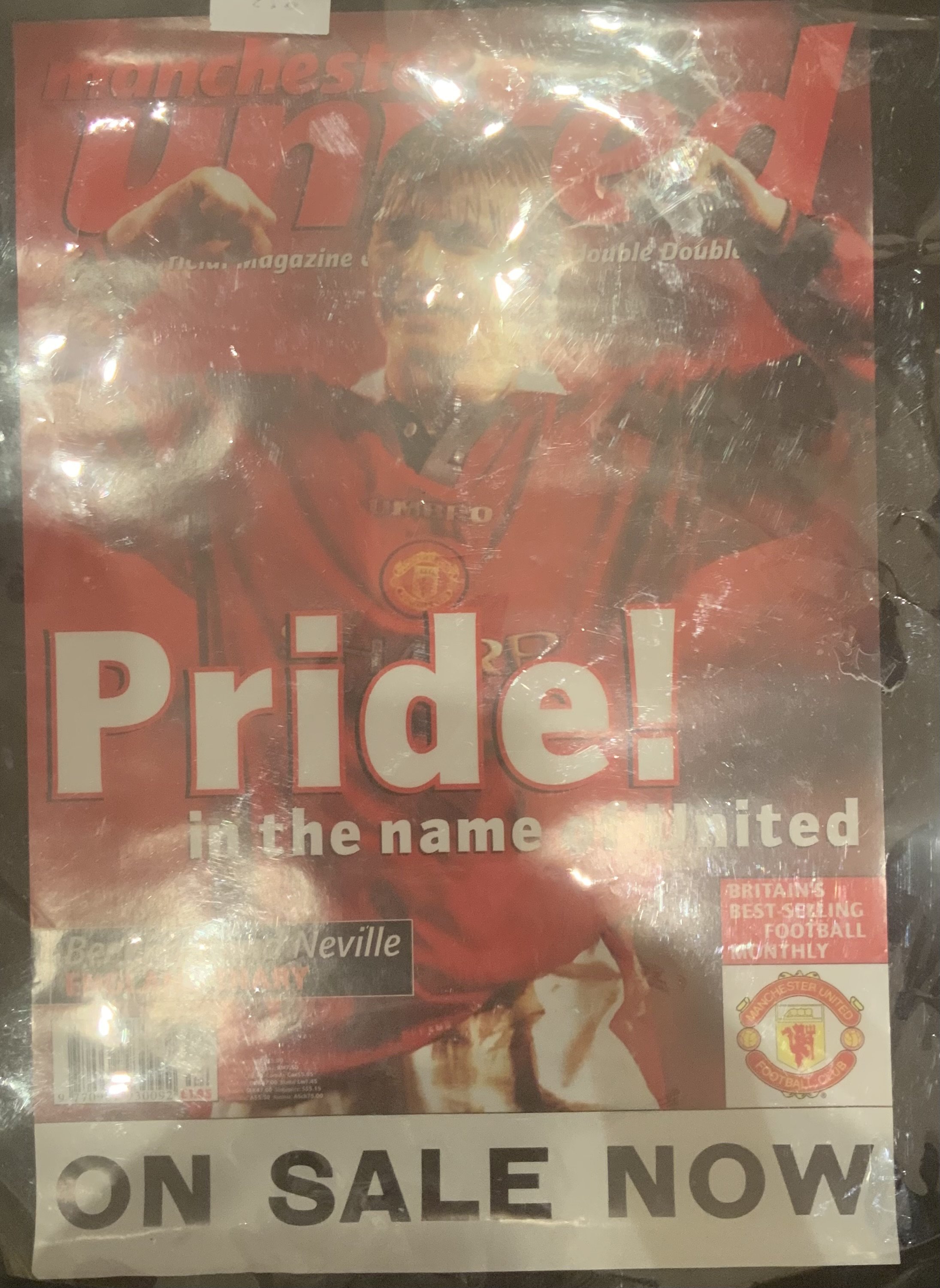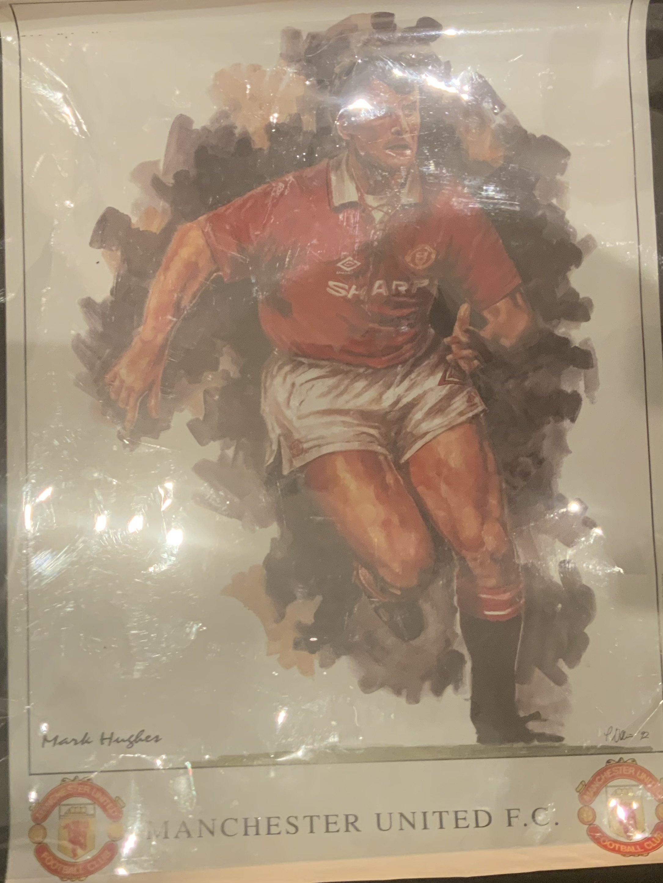 Manchester United Football Posters: All different sizes but all large. Range from the Manchester United Magazine advertising posters to individual players, team groups, caricatures and more. Spotted one signed by Norman Whiteside. Excellent condition with many from the 90s. Light duplication. (93)