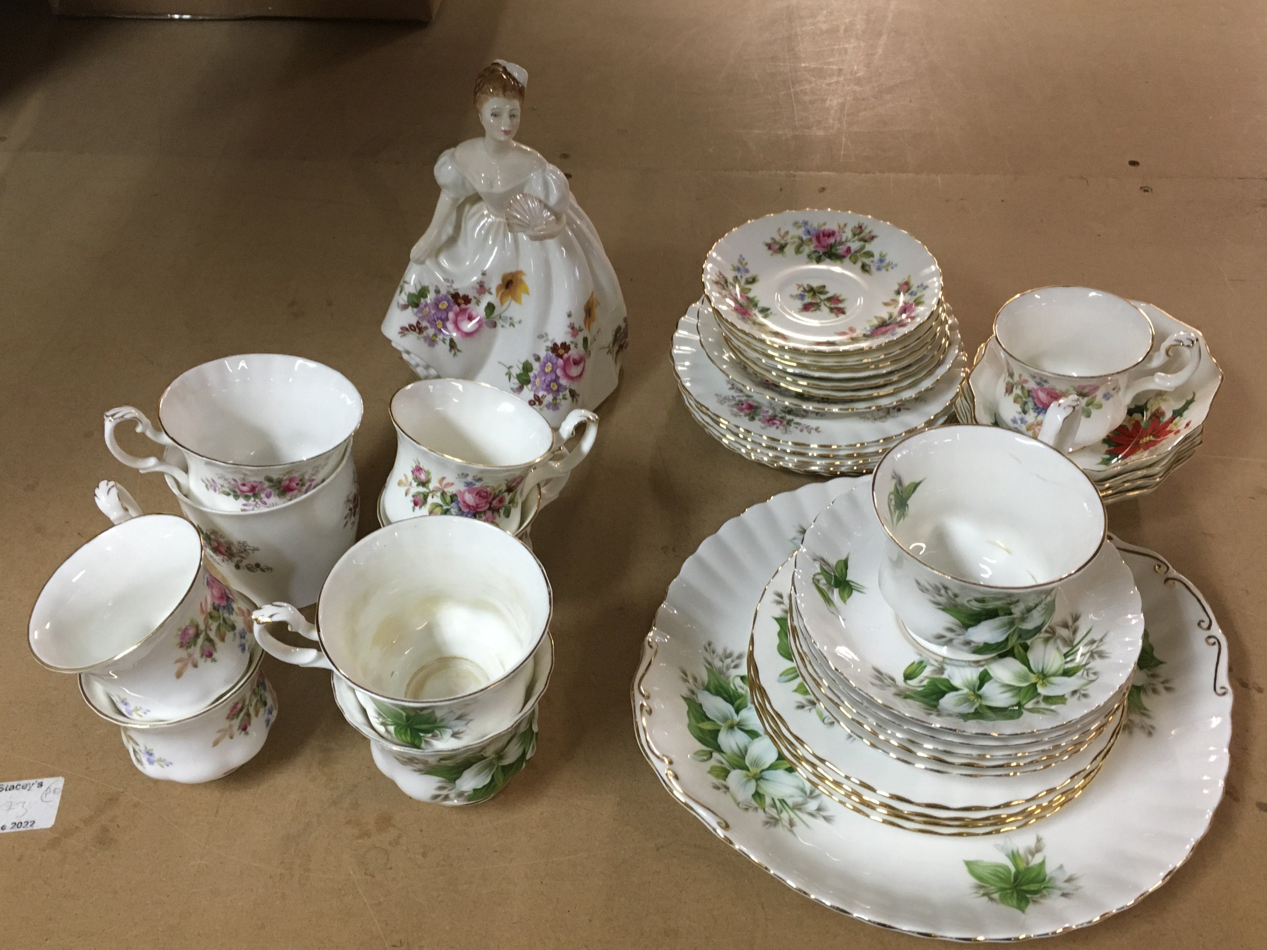 Royal Albert China saucers, cups and dishes including Trillium, Moss Rose and Poinsettia patterns. Royal Doulton figure Hn 3002 Marilyn. This lot cannot be posted