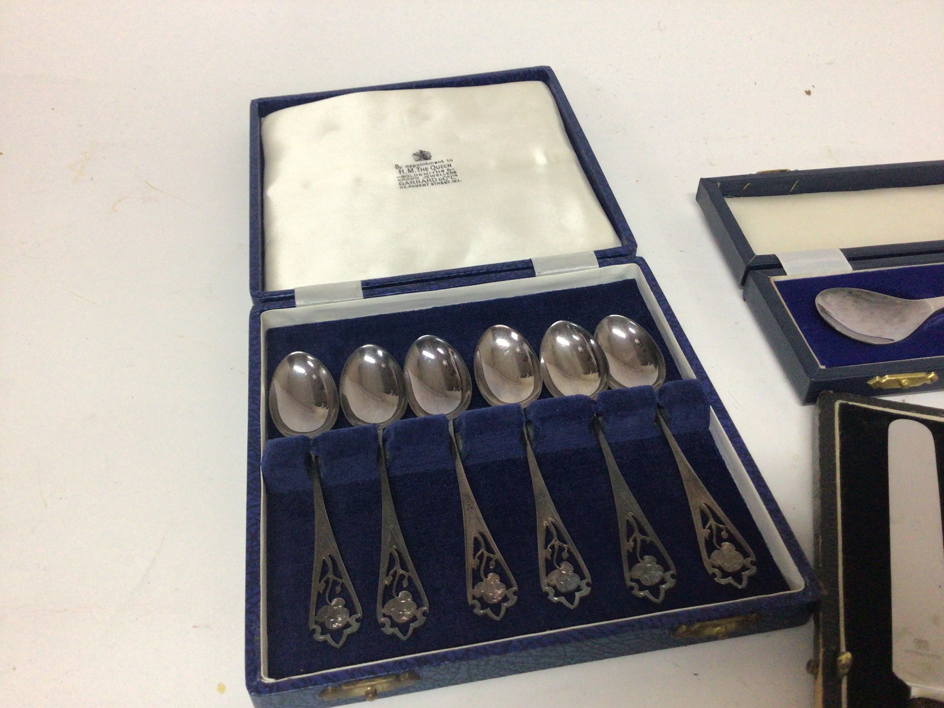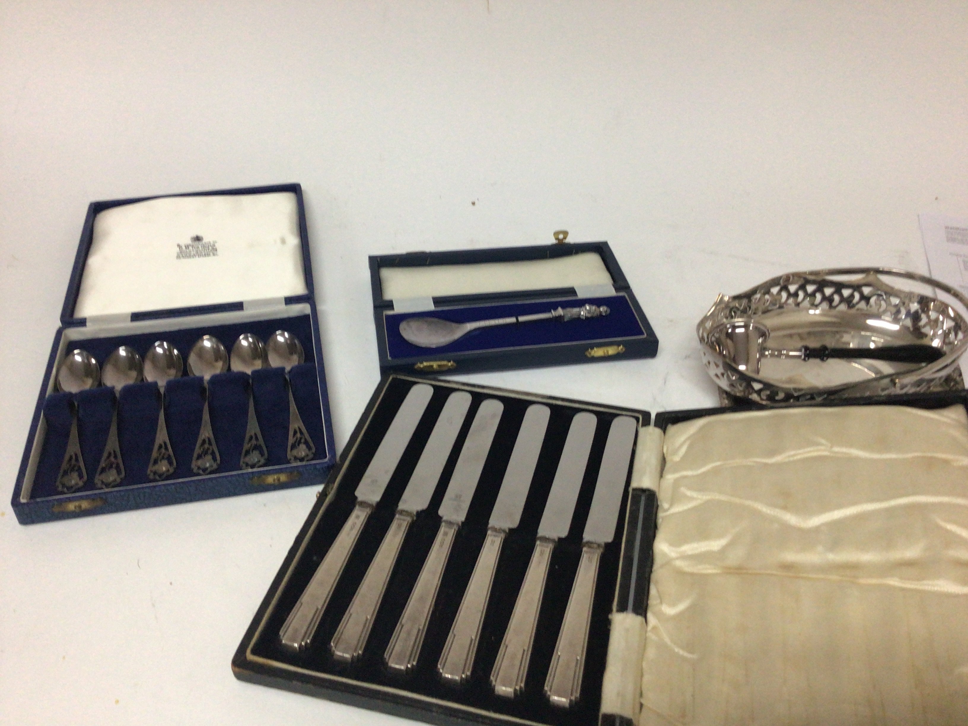 A cased set of ornate silver spoons a cased apostle spoon St Peter and other cutlery and oddments.