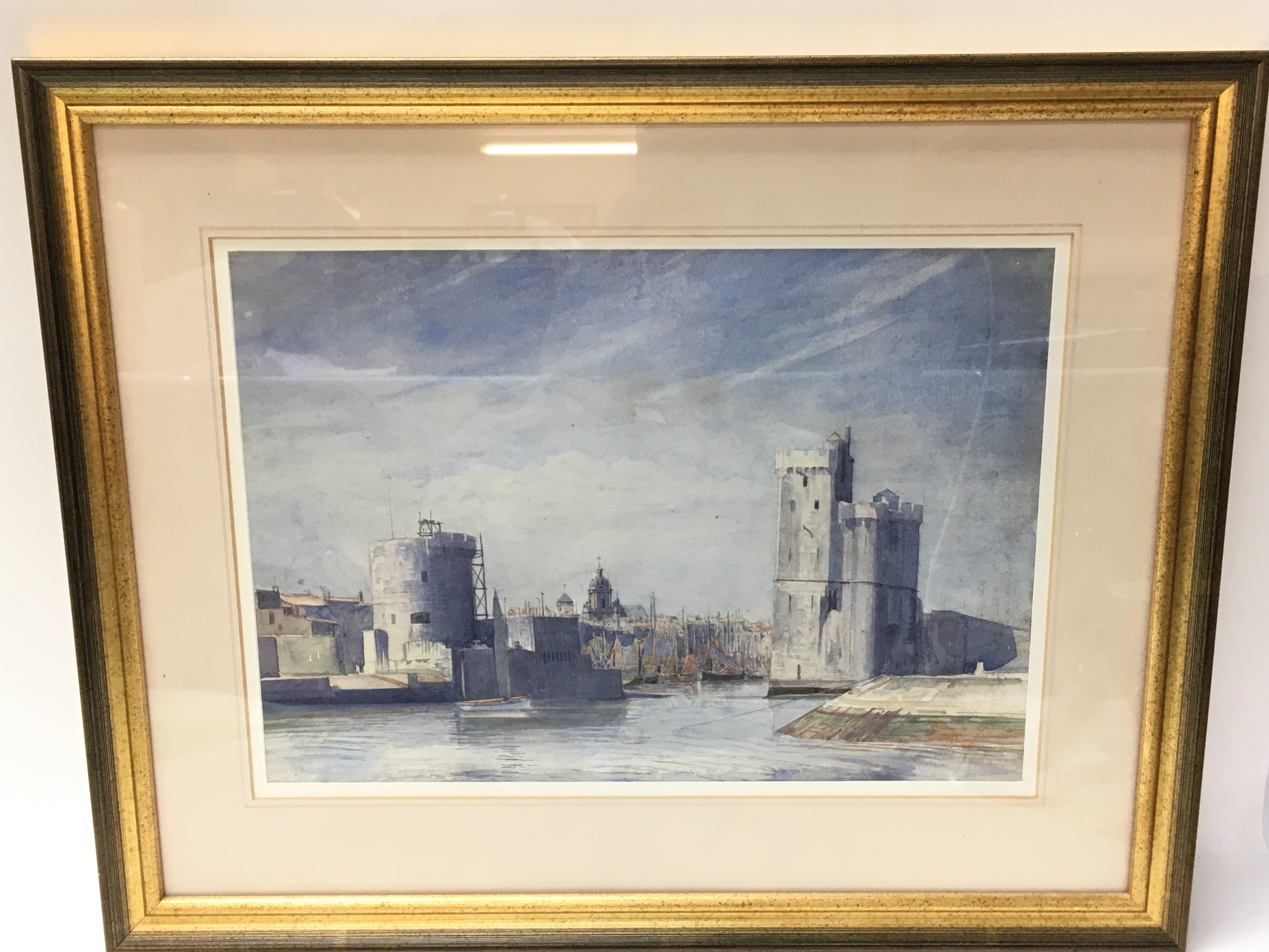 A framed watercolour of The Old Port by Marseille by William Edward Wiley (1880-1943) together with an etching by J M Bell . This lot cannot be posted