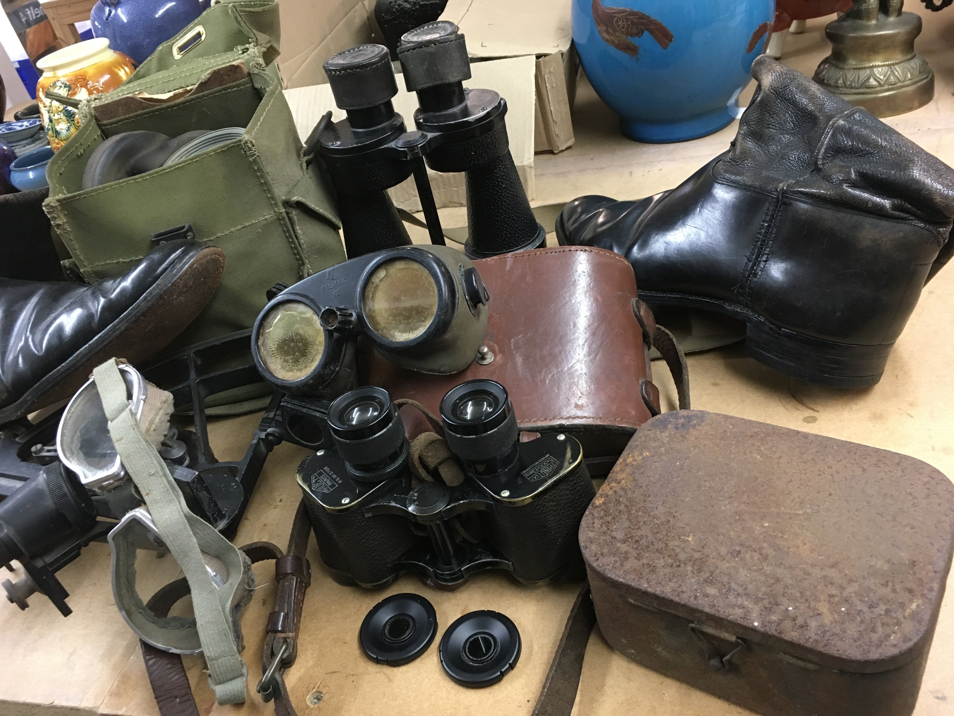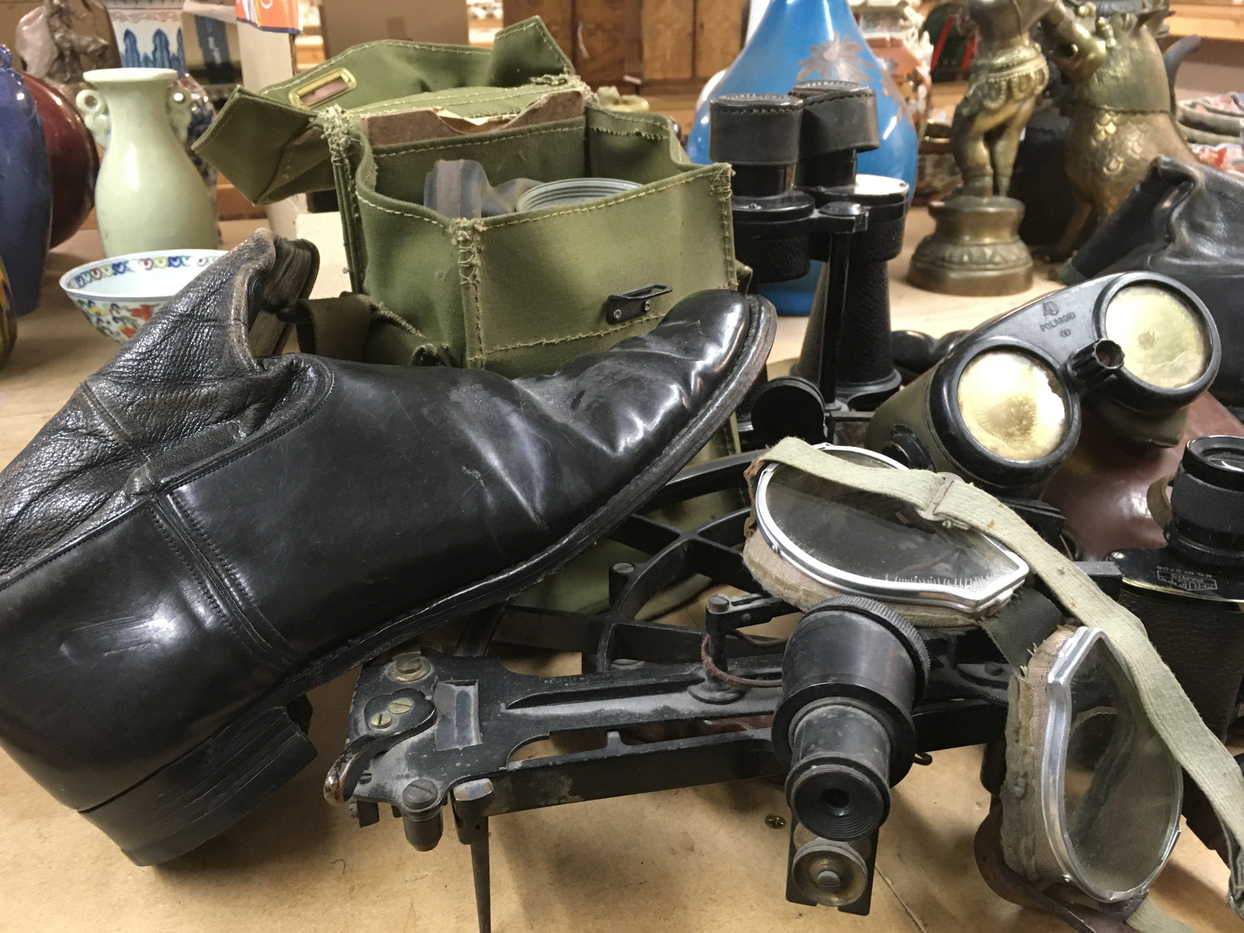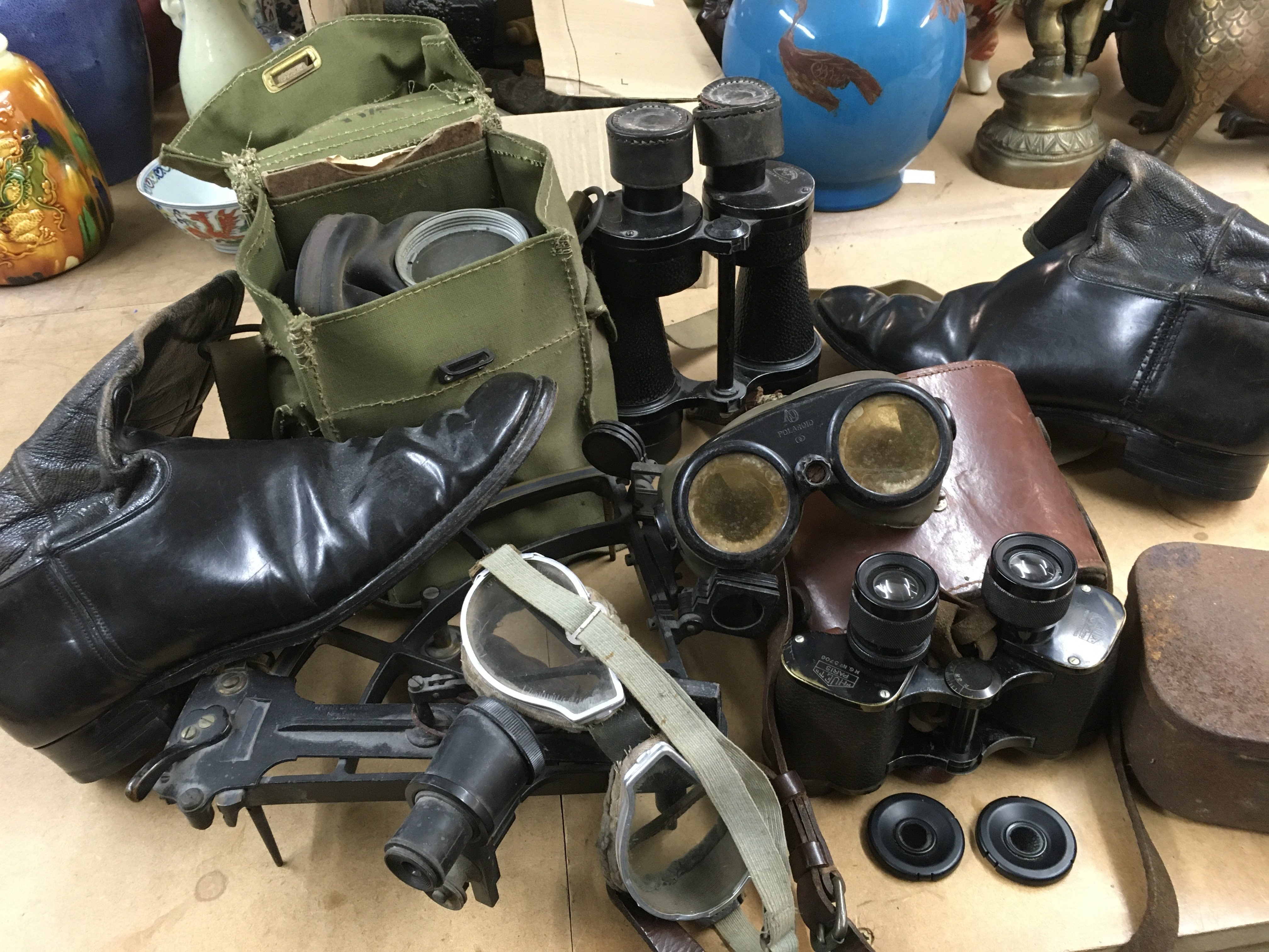 A box containing militarily items of interest including two pairs of binoculars, a sextant, gas mask, Google's etc