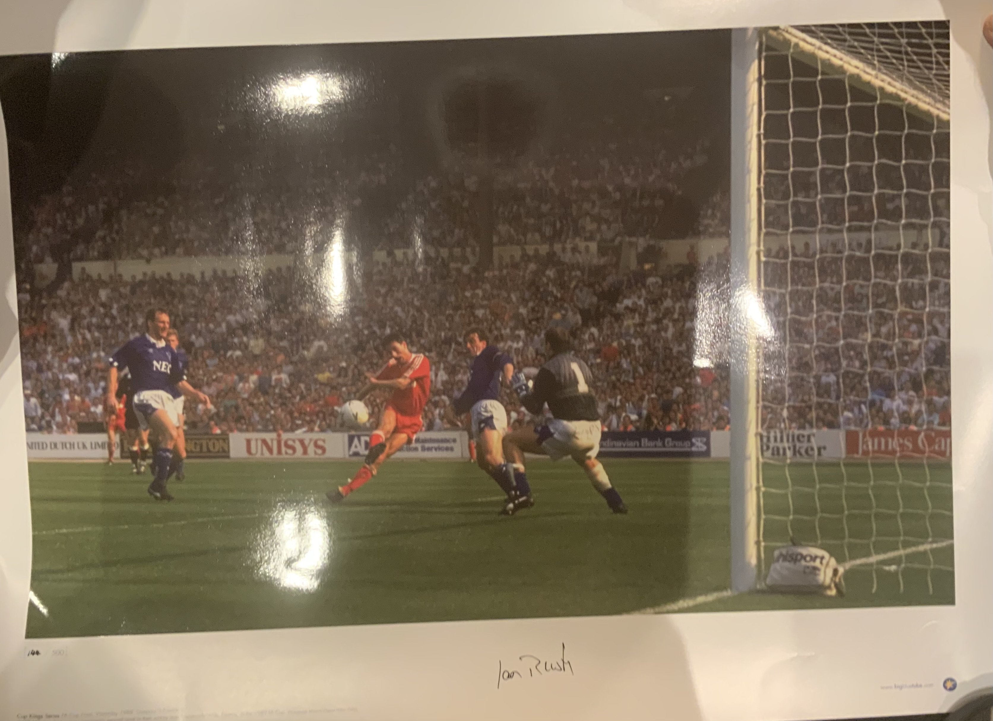 Liverpool Big Blue Tube Signed Football Prints: All measuring nearly 23 x 17 inches in excellent condition produced by the famous company with genuine autographs on prints of which there were print runs of only 500. Includes Rush Barnes Dalglish and McAllister. (4)