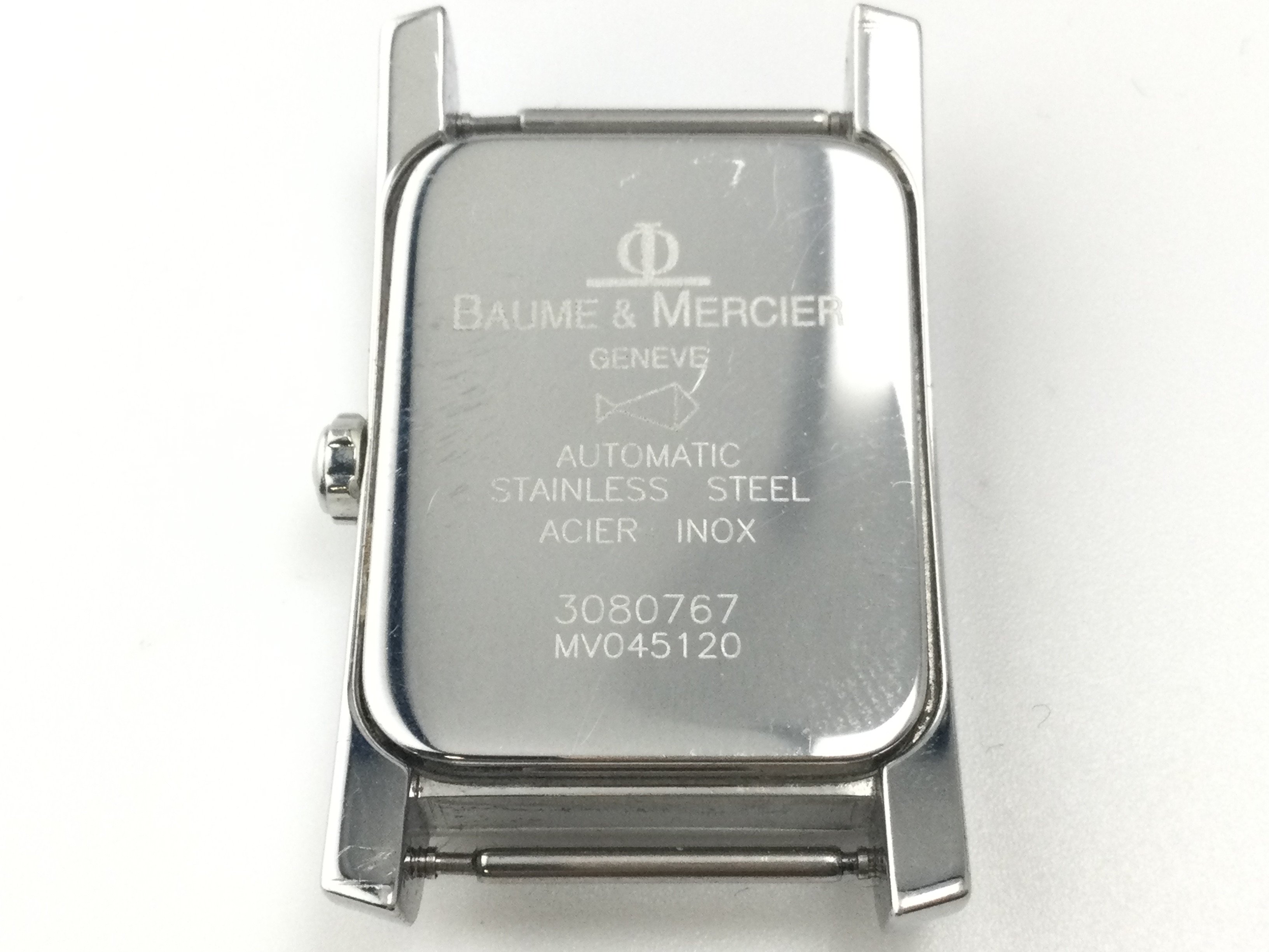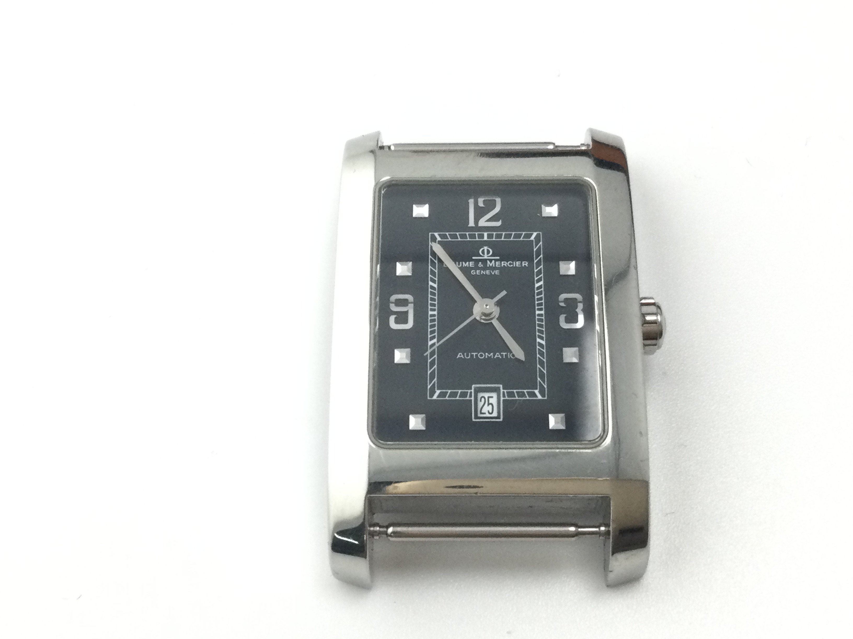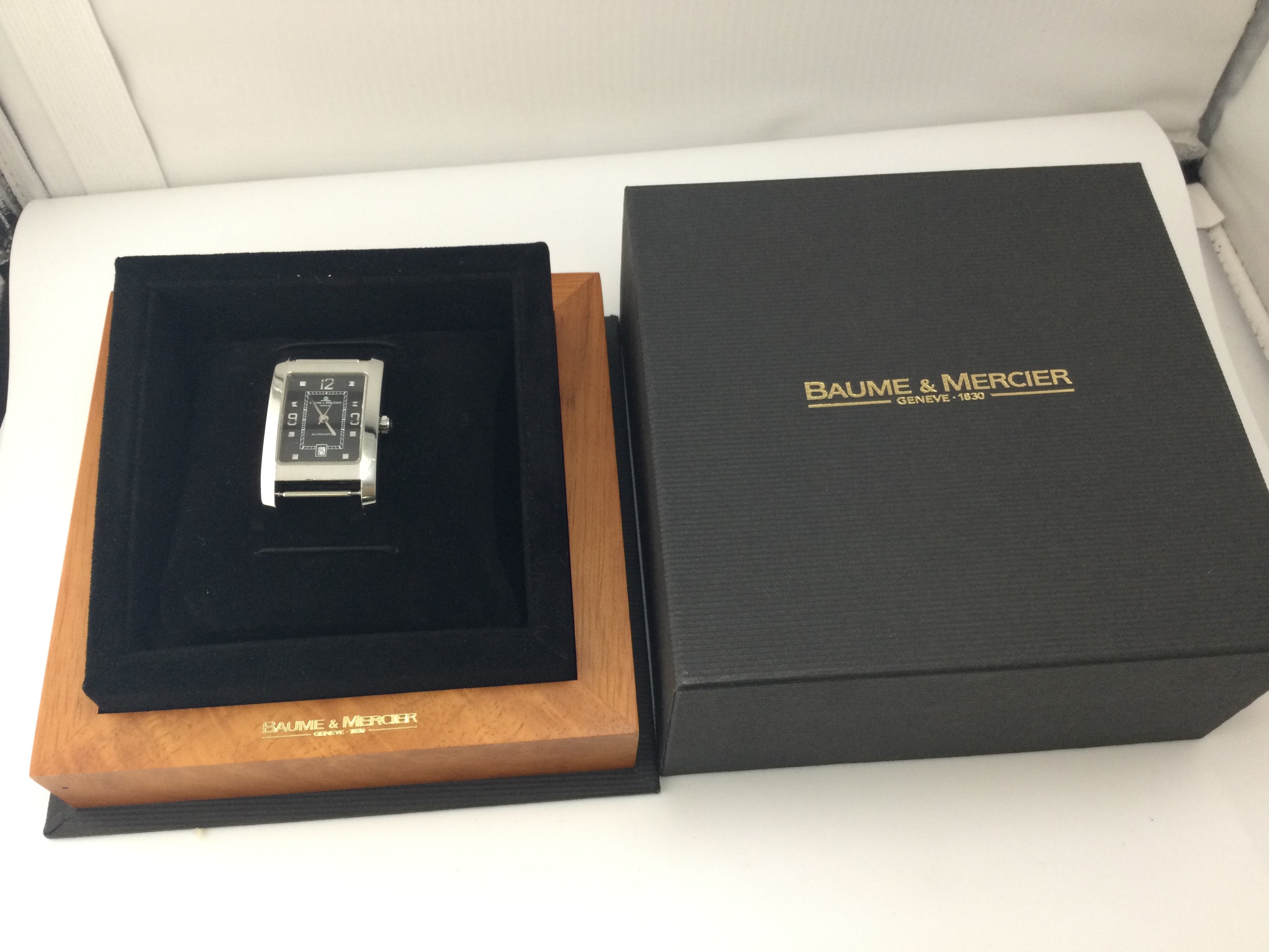 A Baume & Mercier Hampton automatic wrist watch. Black dial and steel case. No strap but comes with box. Winds and runs. Postage B