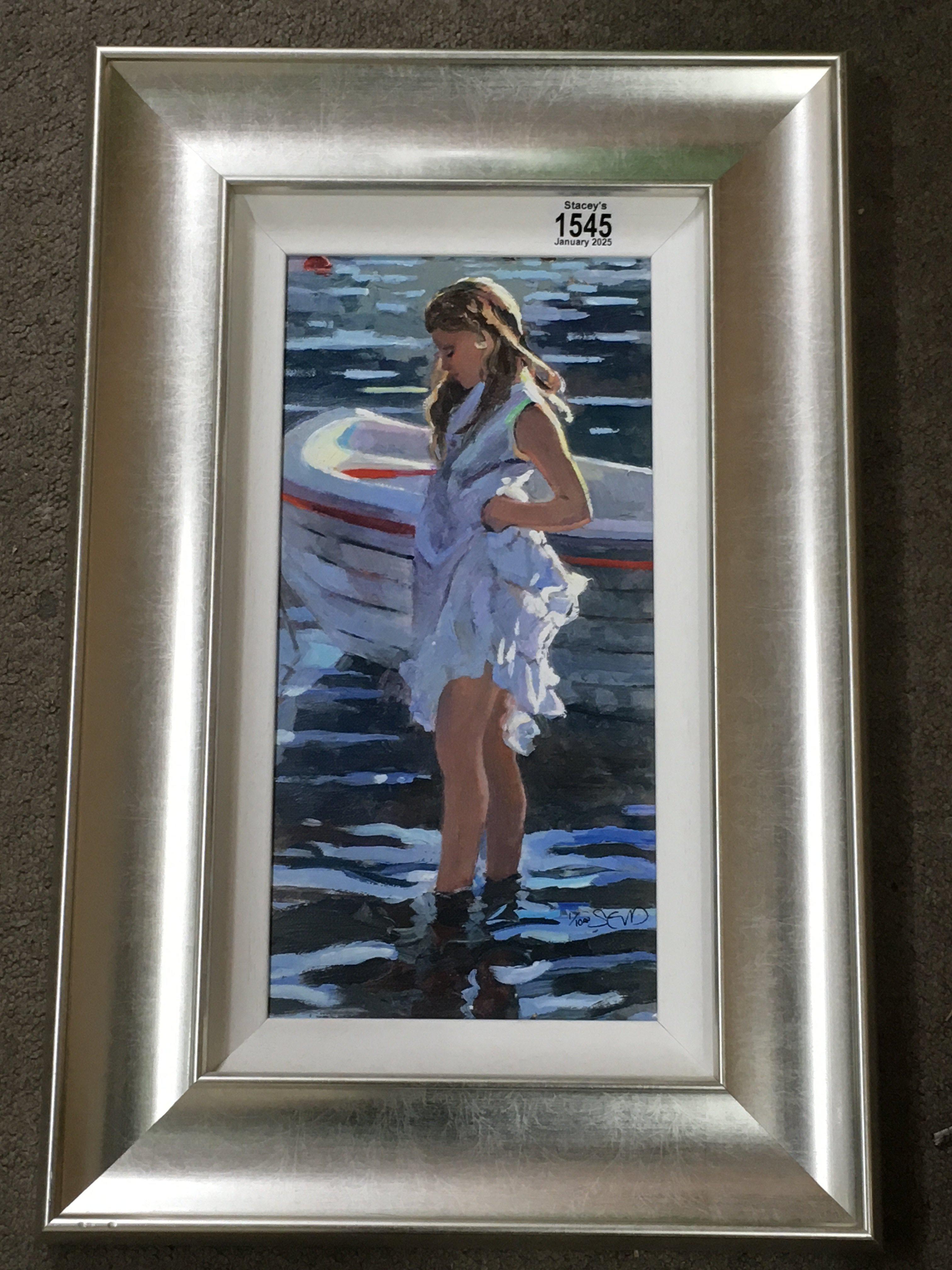 A Limited edition silver Framed print depicting a young girl paddling. By Sheree Valentine Daines