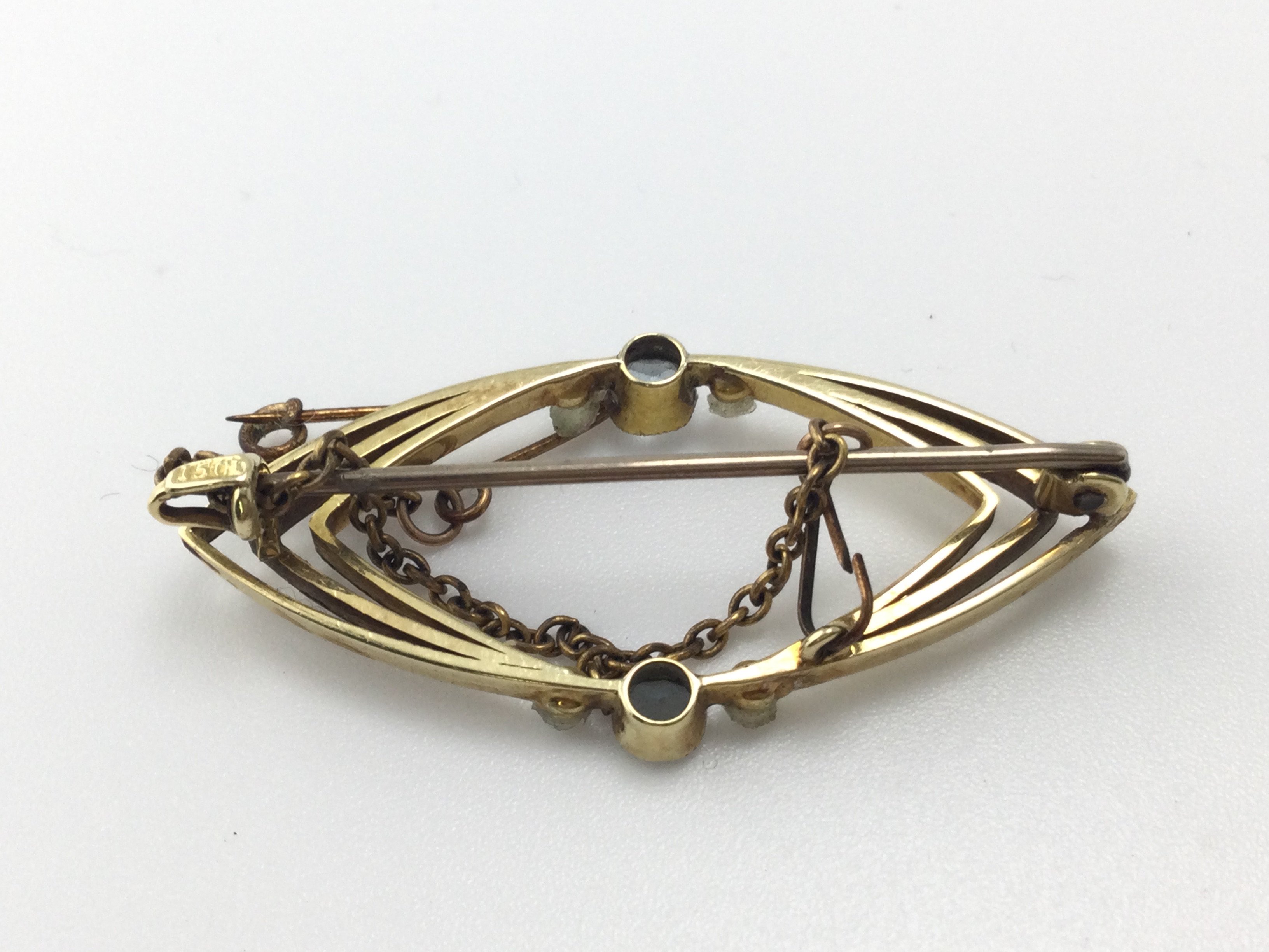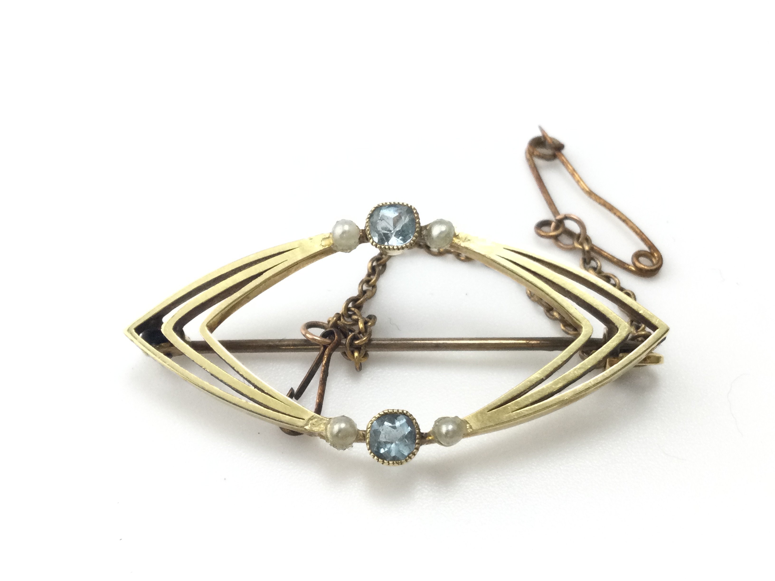 A 15ct Aqua and seed pearl brooch. 3.78g Postage B