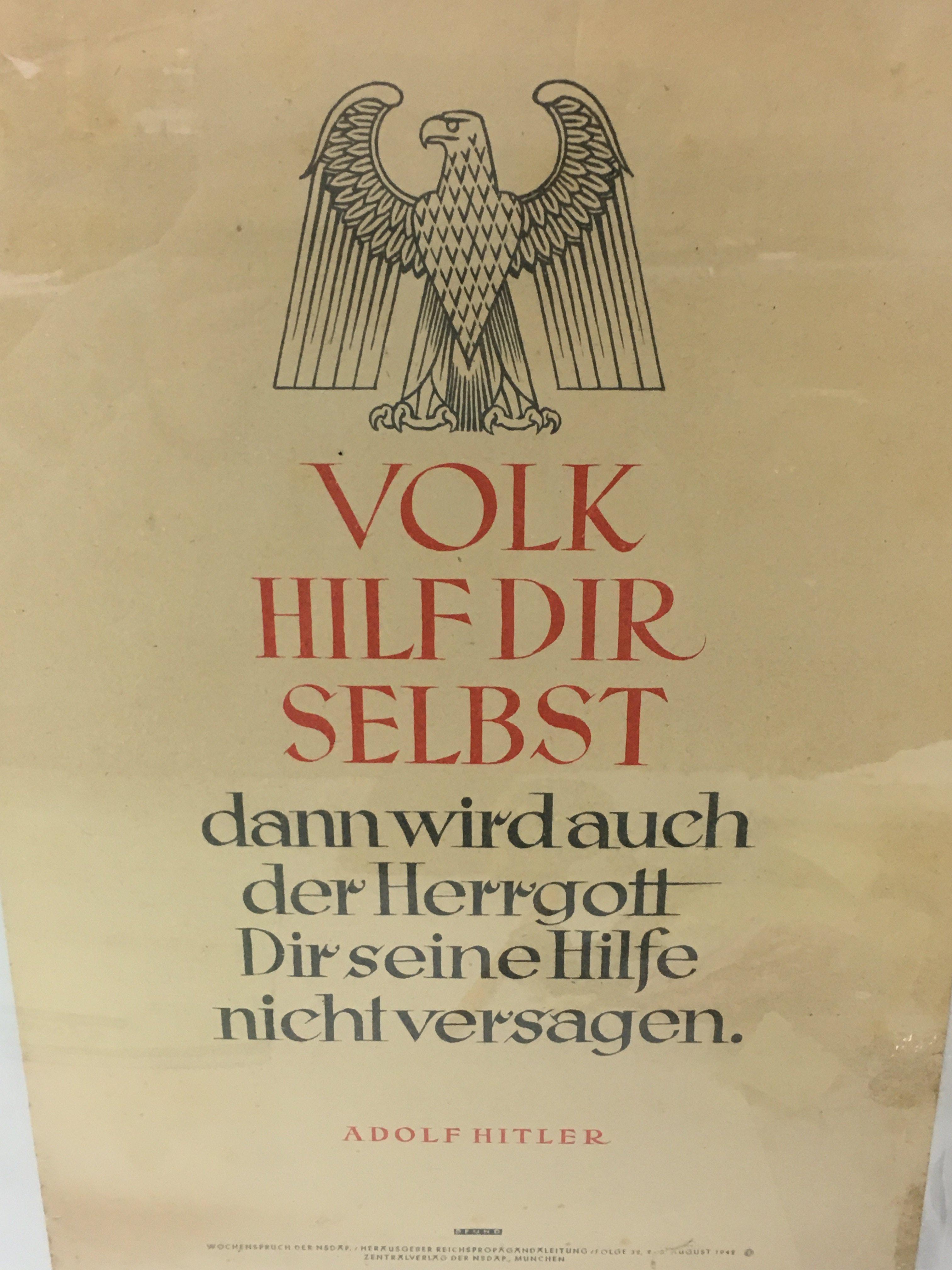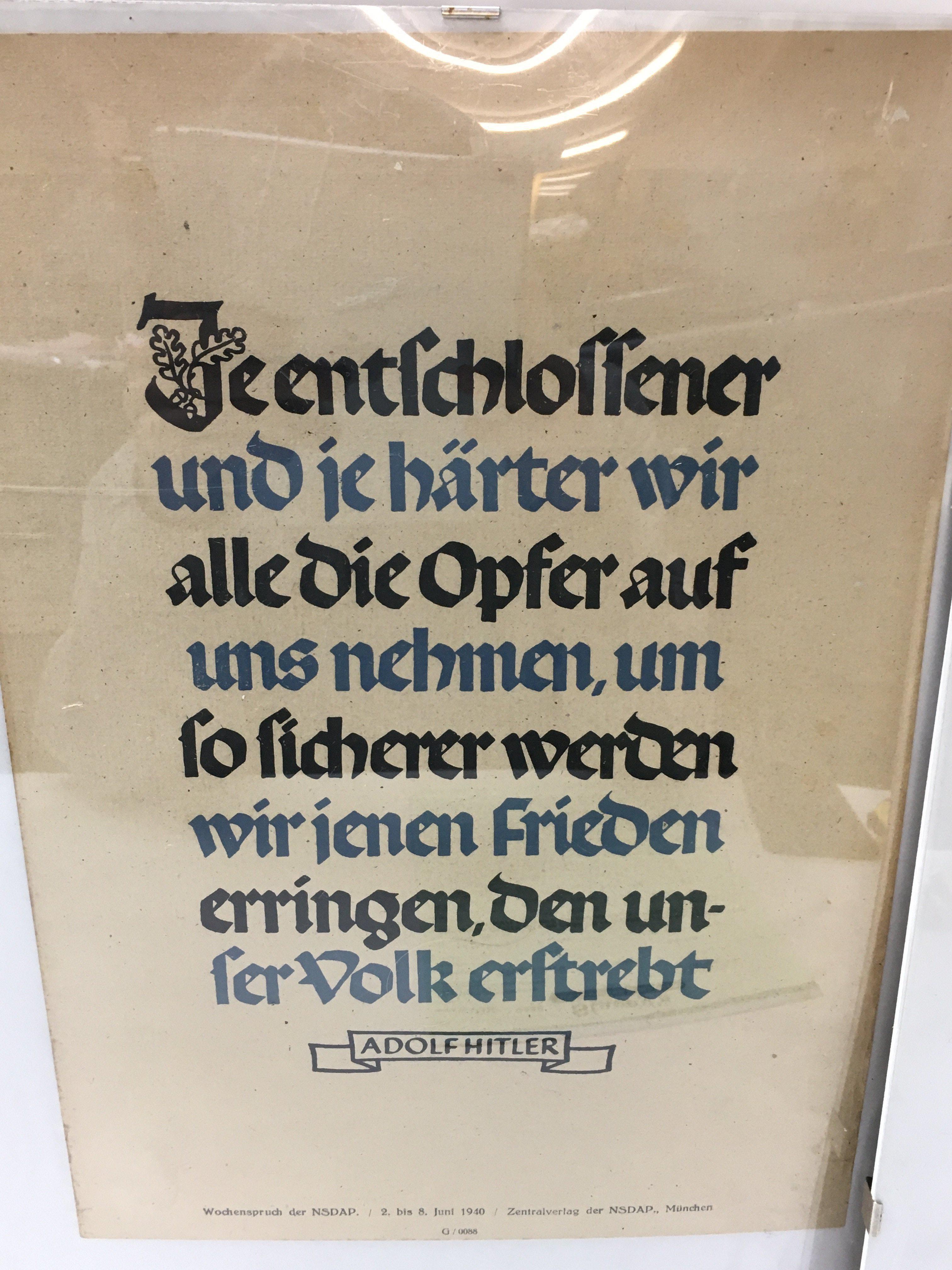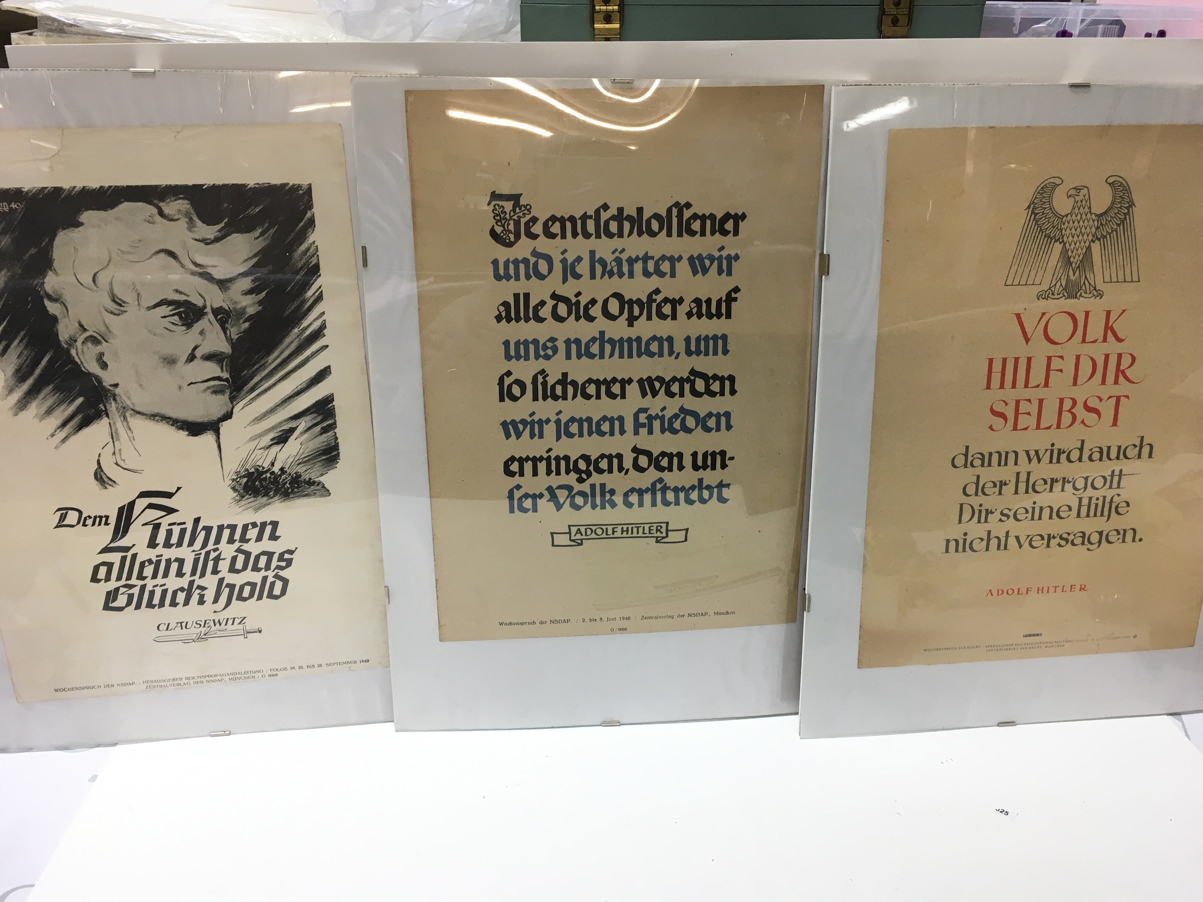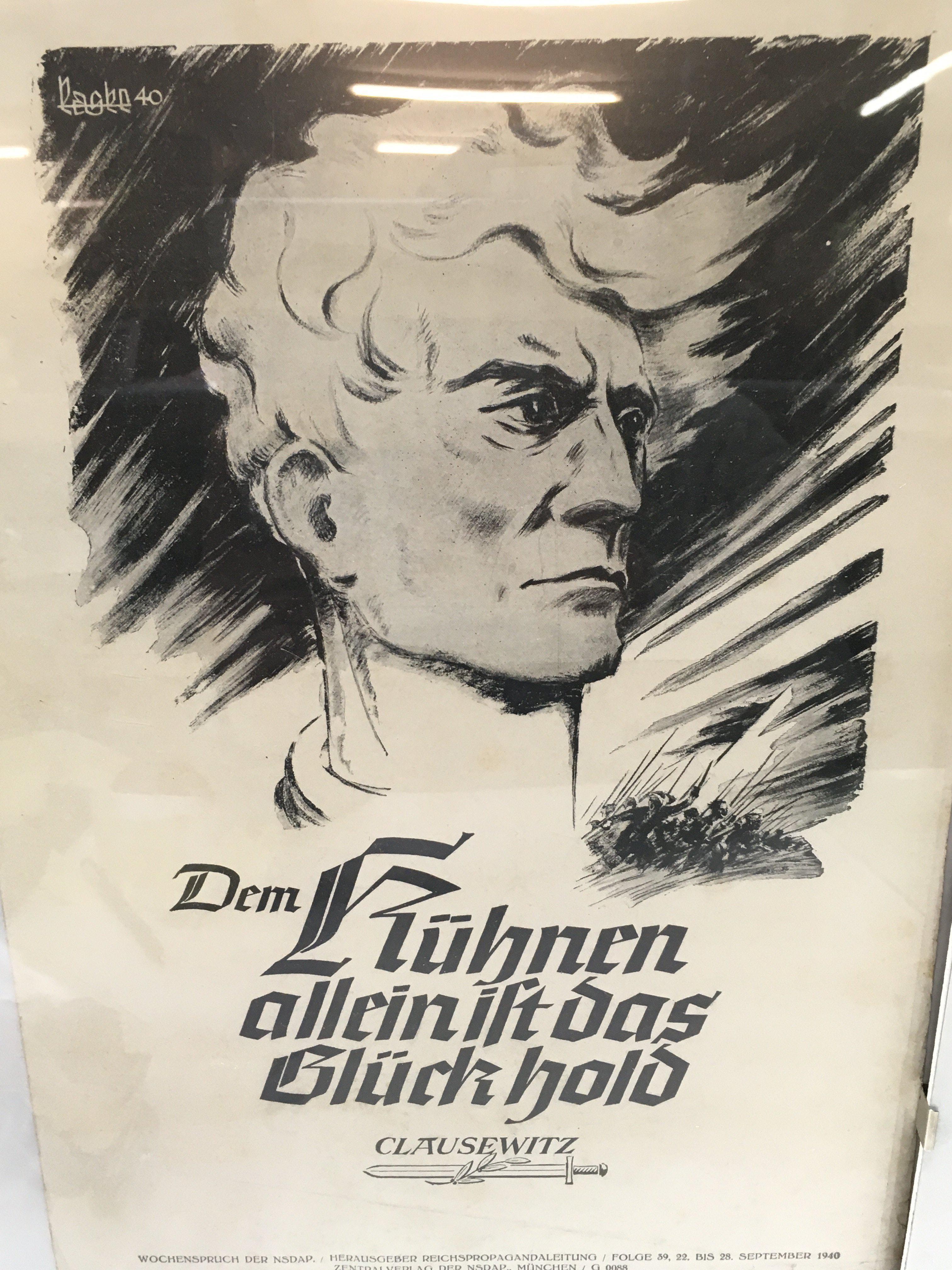 Three WW2 German NSDAP propaganda posters with quotes from Clausewitz and Hitler. This lot can be posted without their frames, postage category B