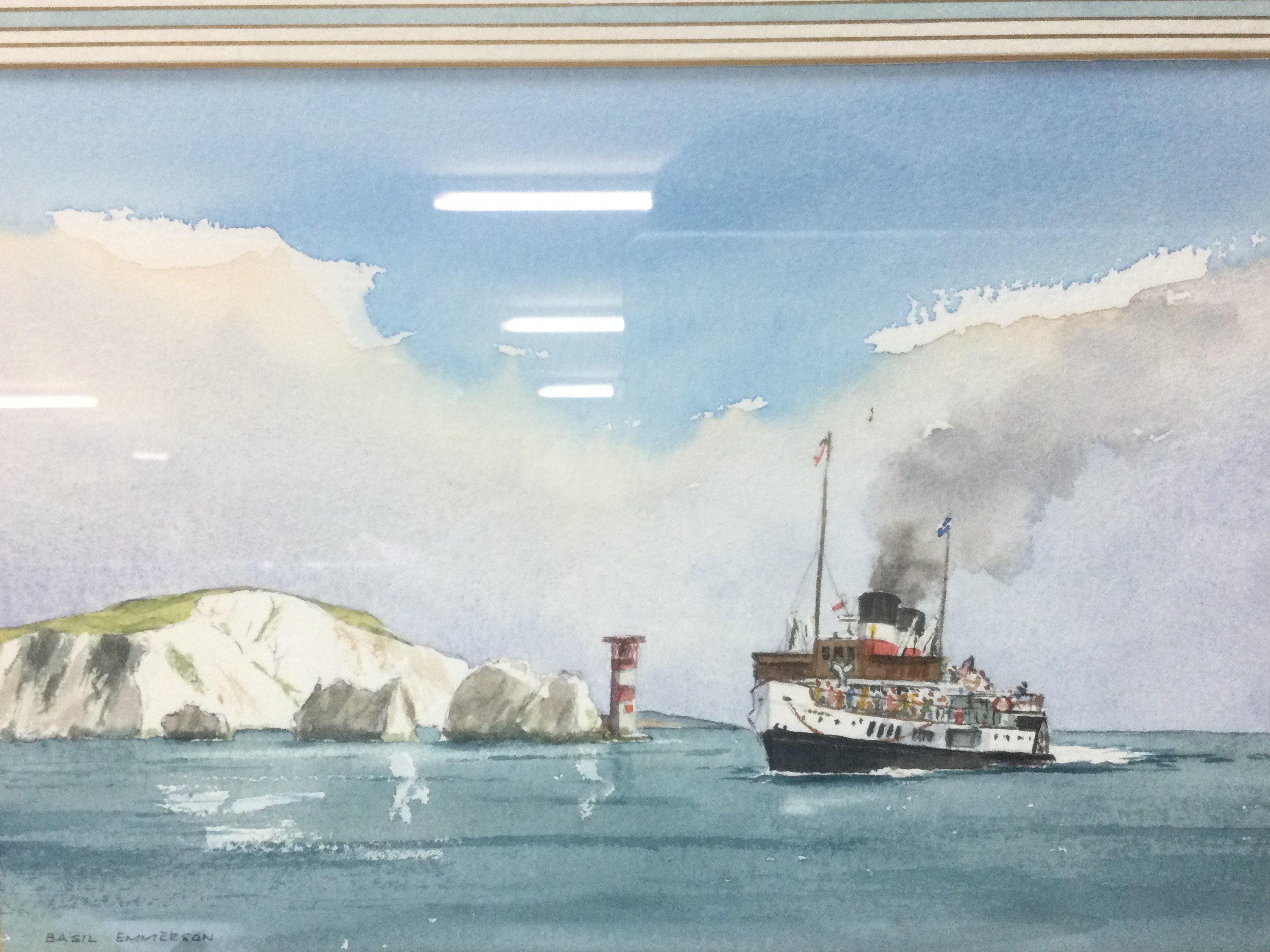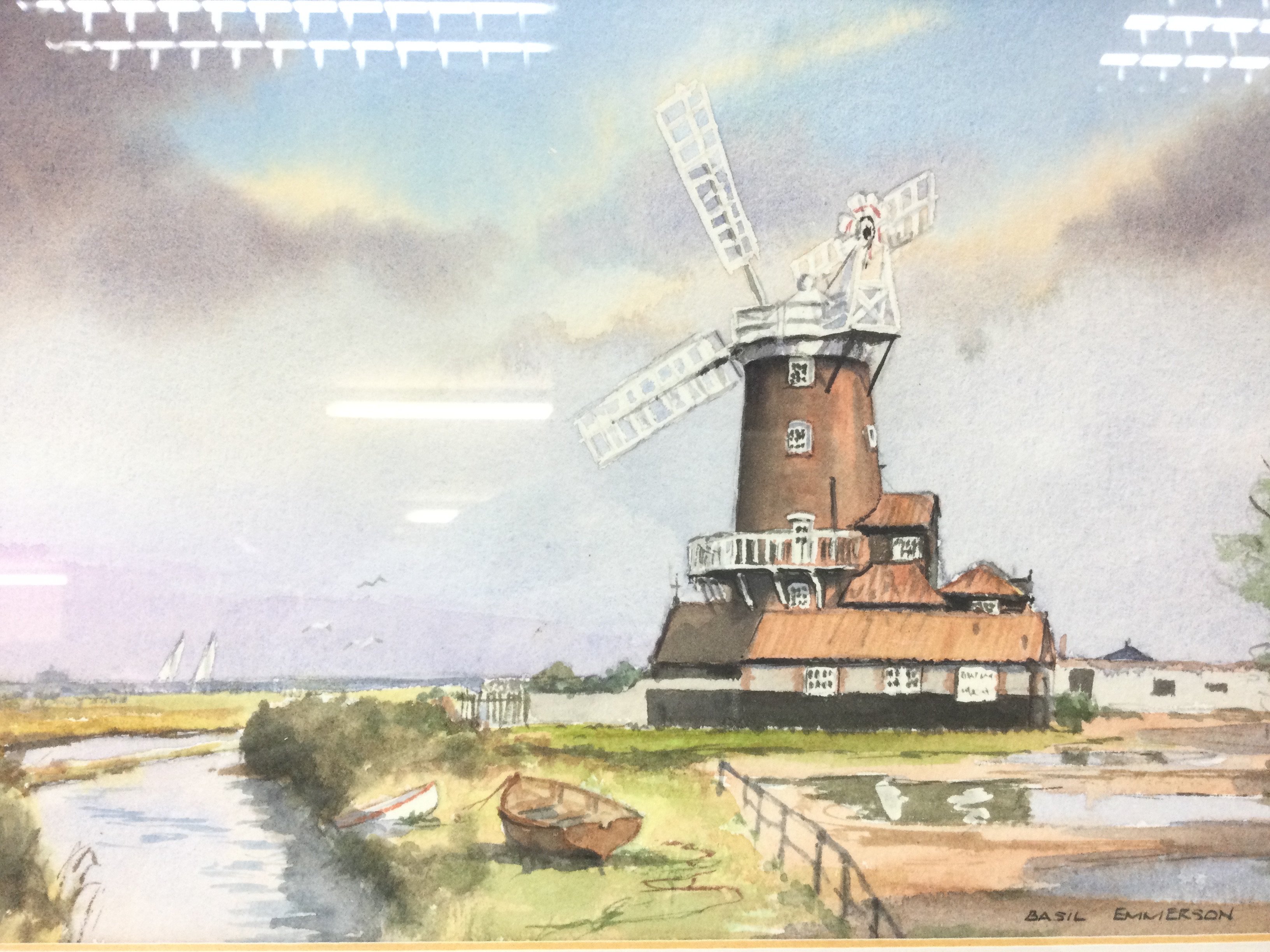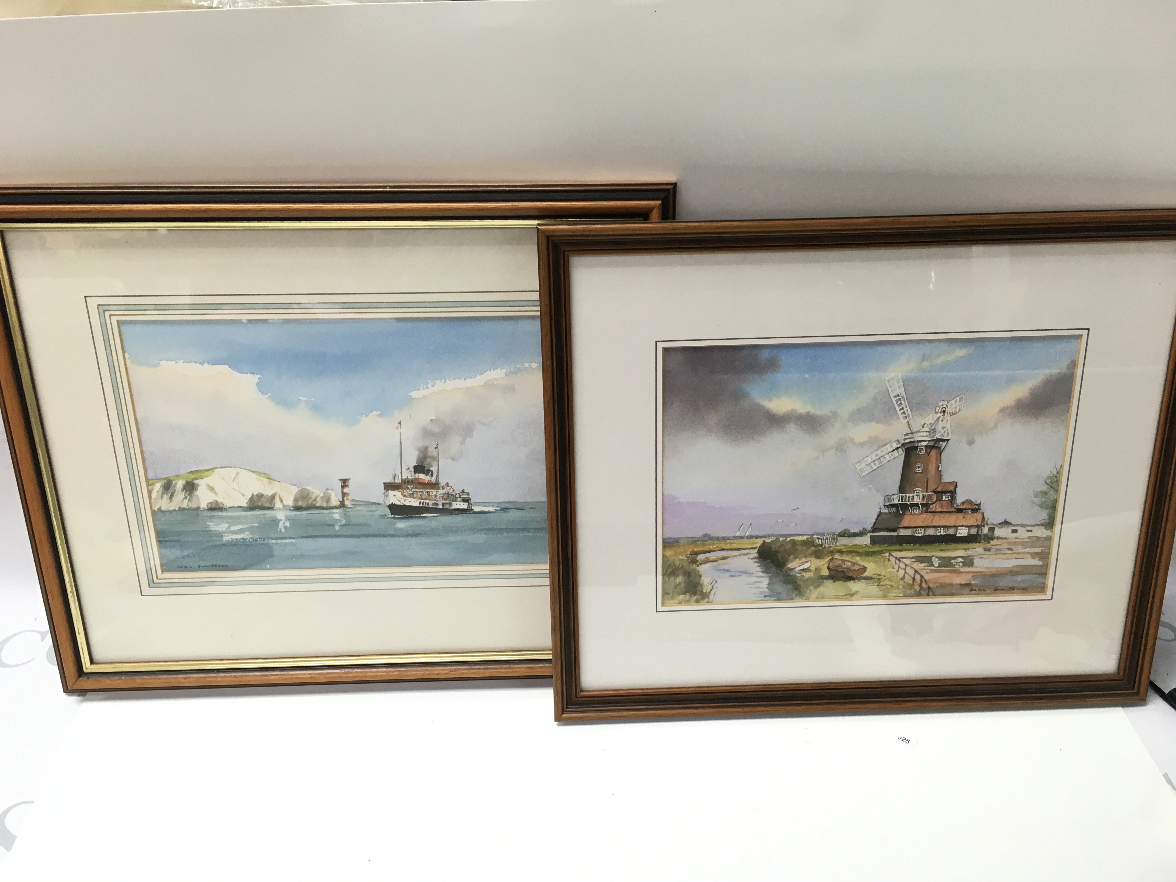 Framed watercolour paintings by Basil Emmerson, one of a windmill and the other of a steam boat at sea. This lot cannot be posted