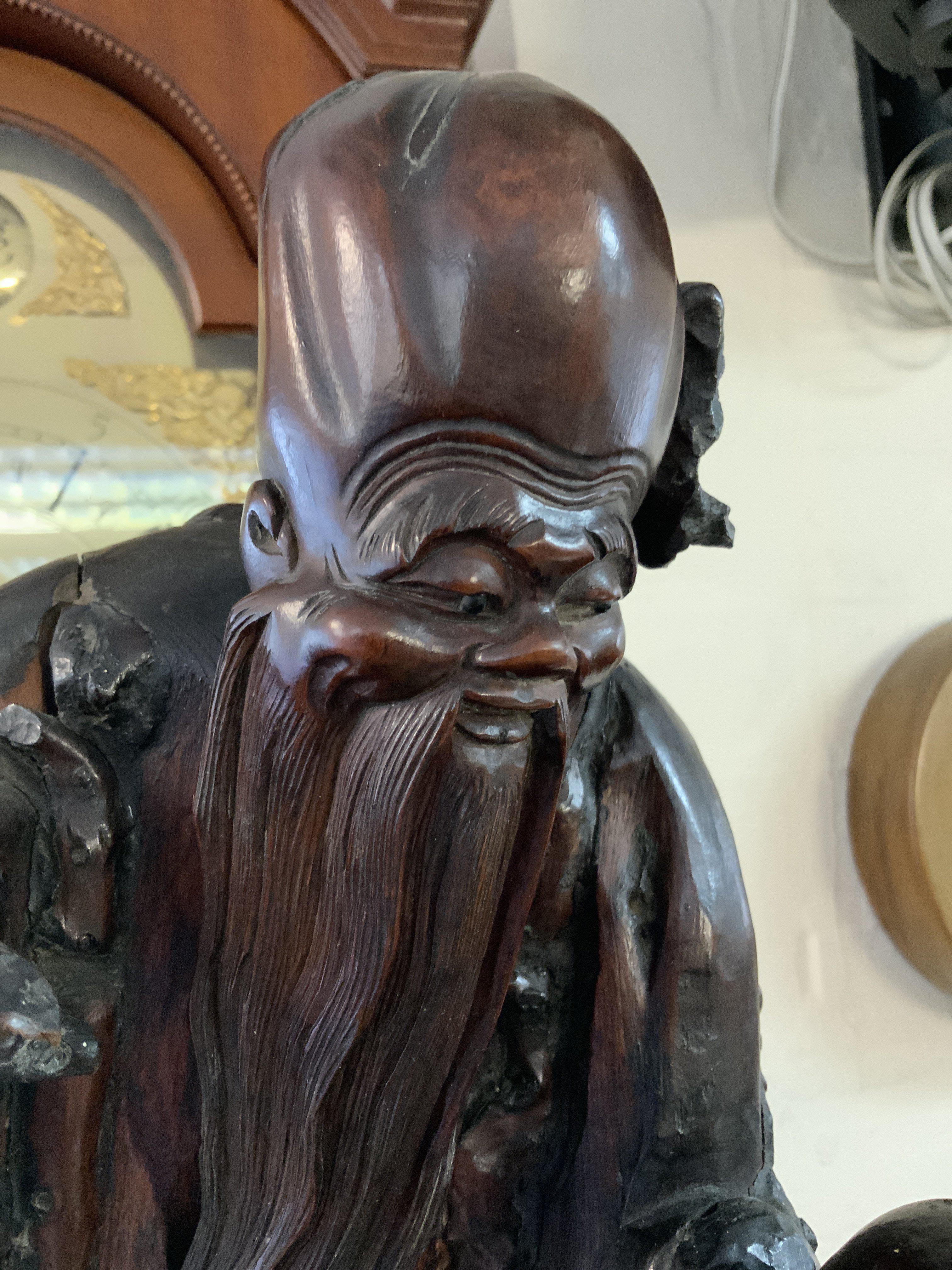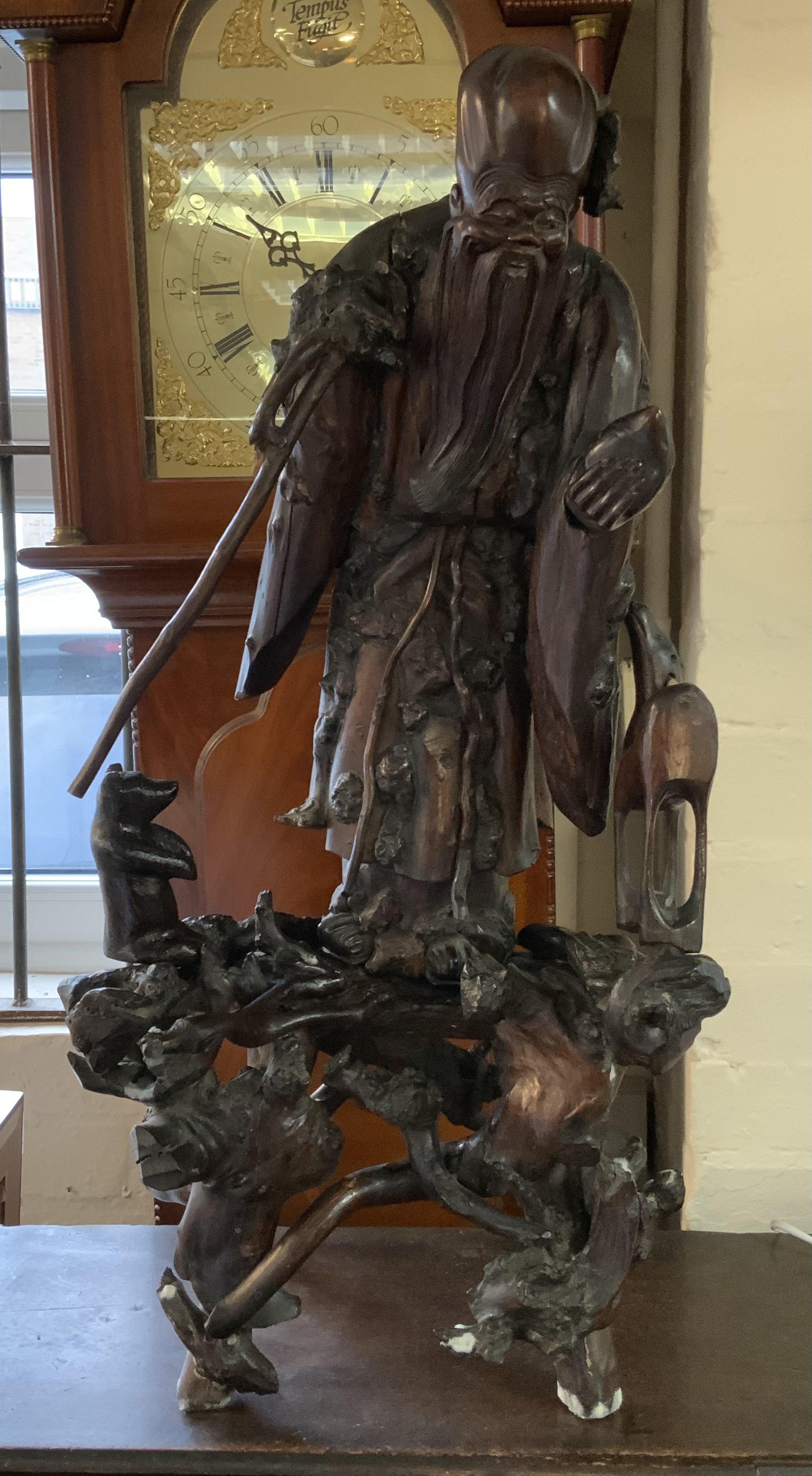 19thc Chinese carving of Shou Lao with a staff and peach on a naturalistically modelled stand. 67.5cm.