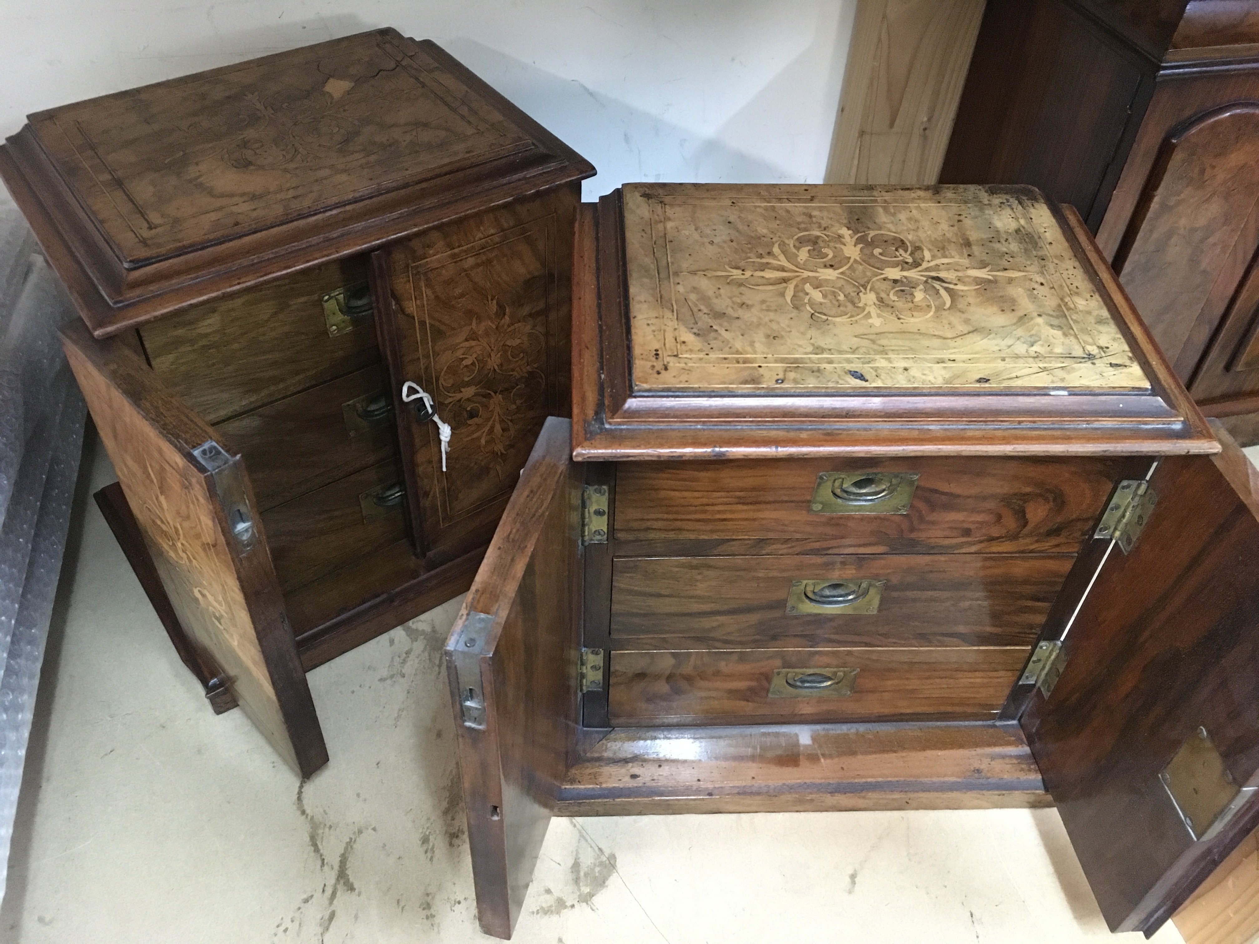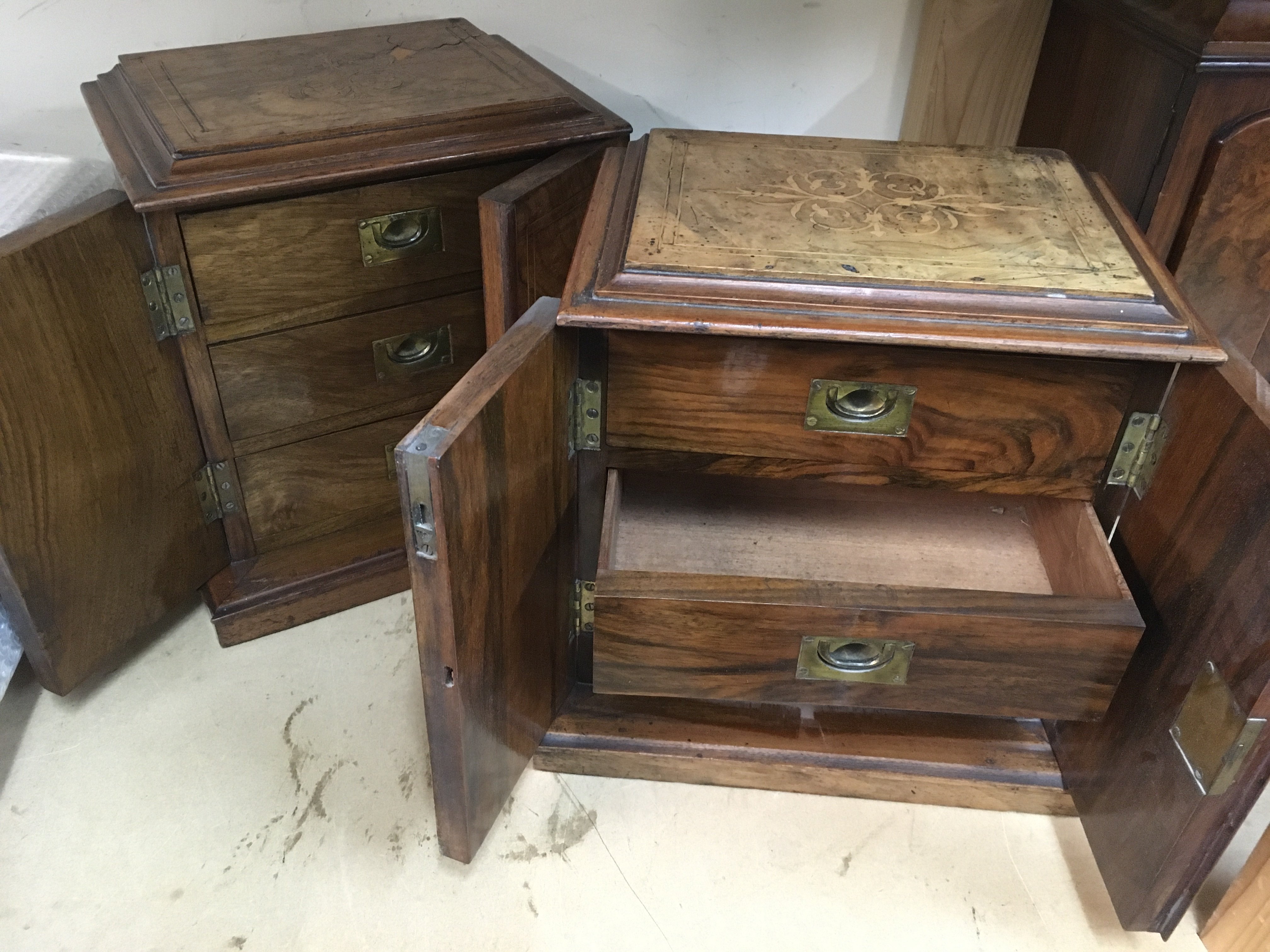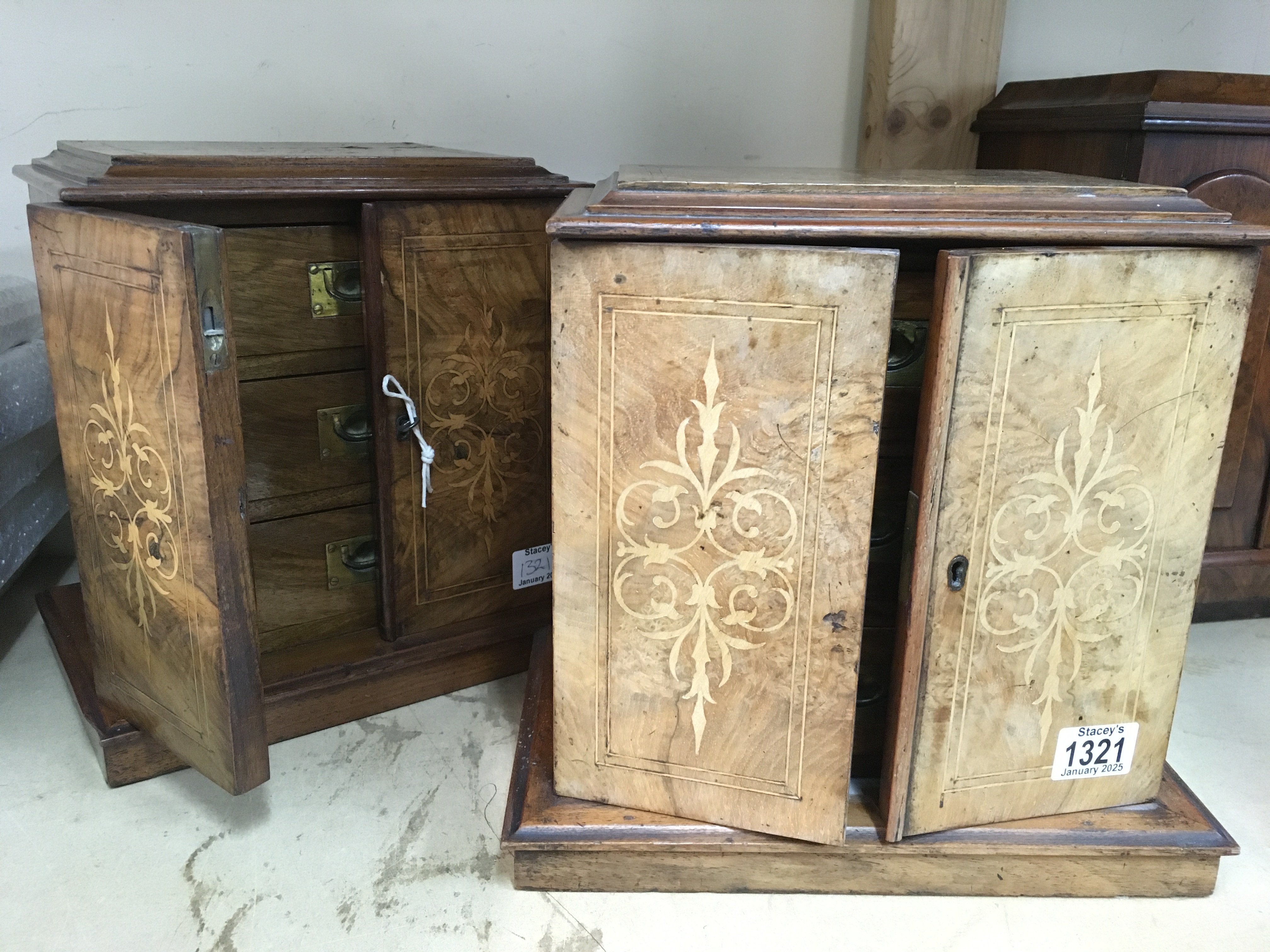A pair of walnut small collectors cabinets with a pair of inlaid doors enclosing three drawers