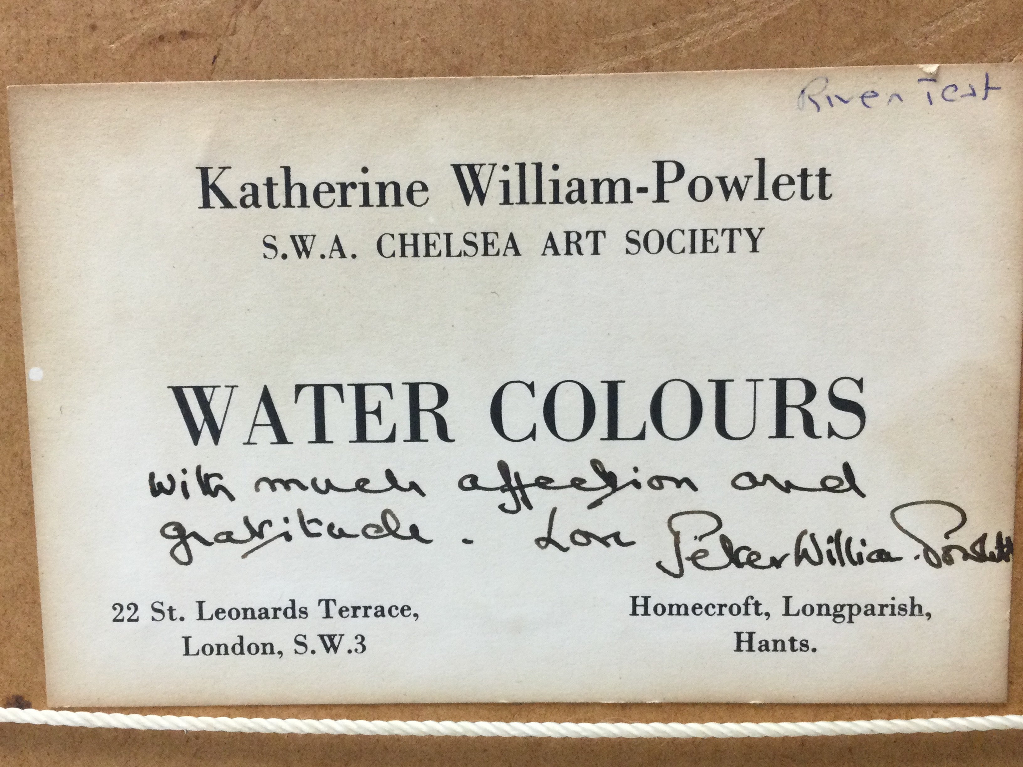A framed watercolour by Katherine William-Powlett (1911-1996) titled River Test depicting a fly fisherman at a river. Dimensions 53x44cm