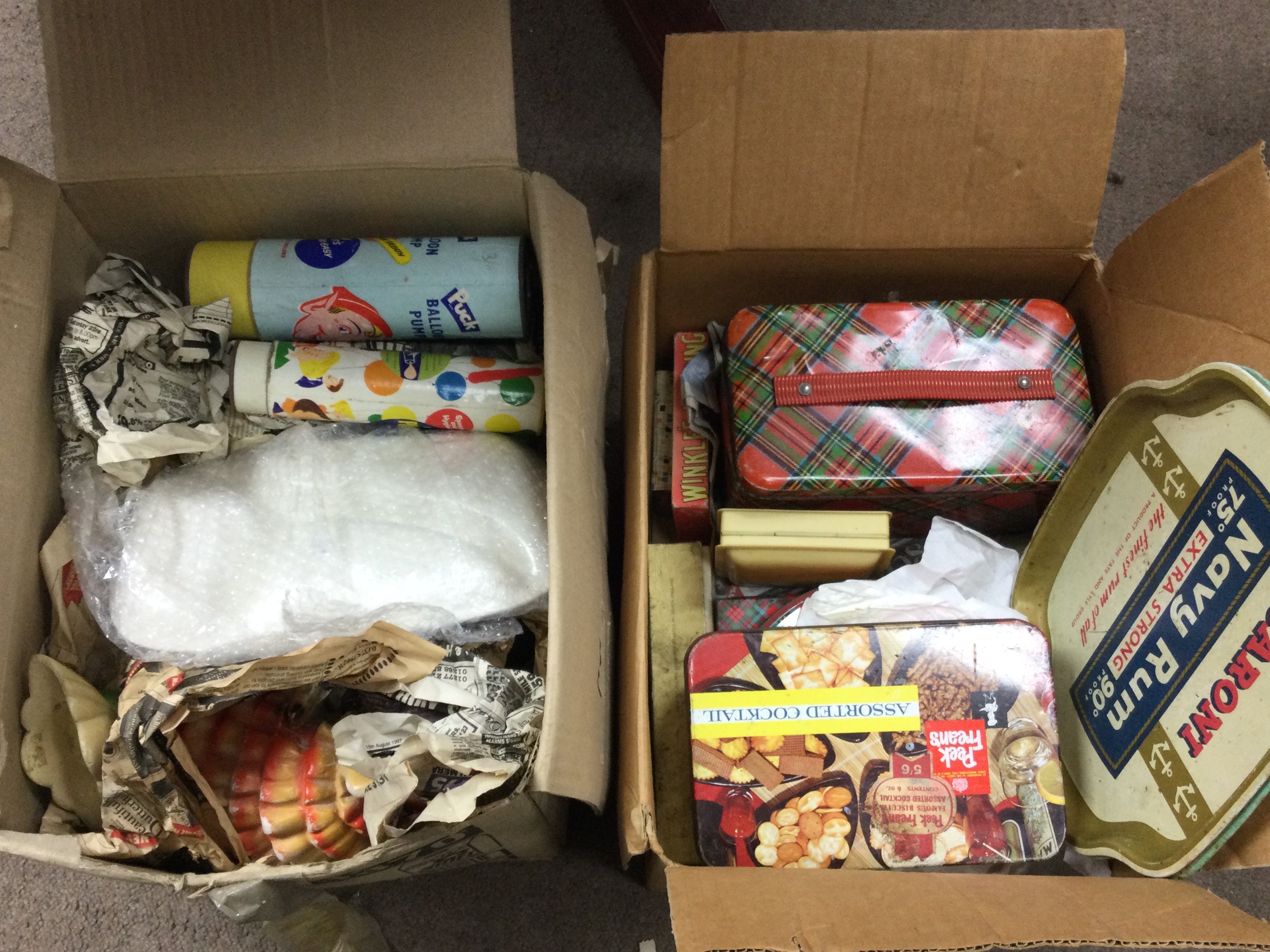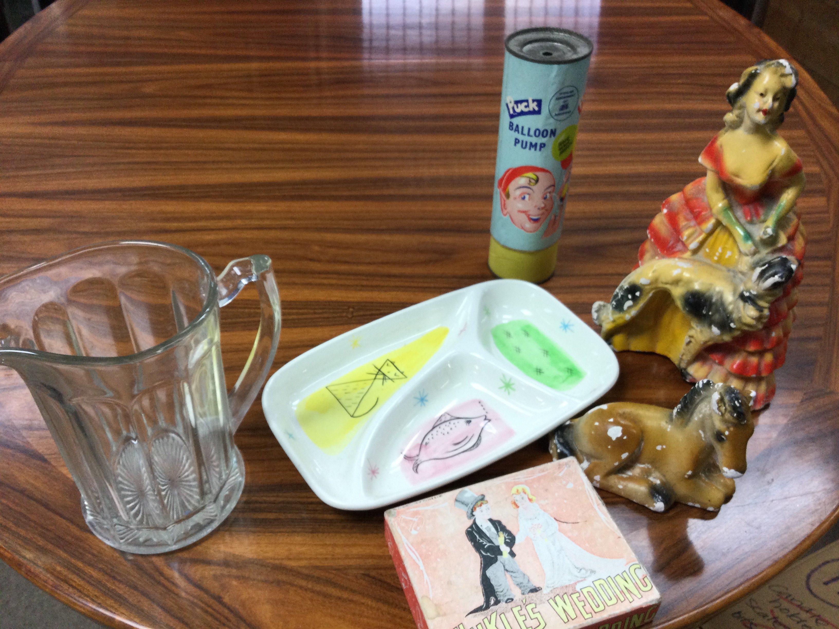 A collection of vintage items including a puck balloon pump, ceramic figures, a glass jug etc
