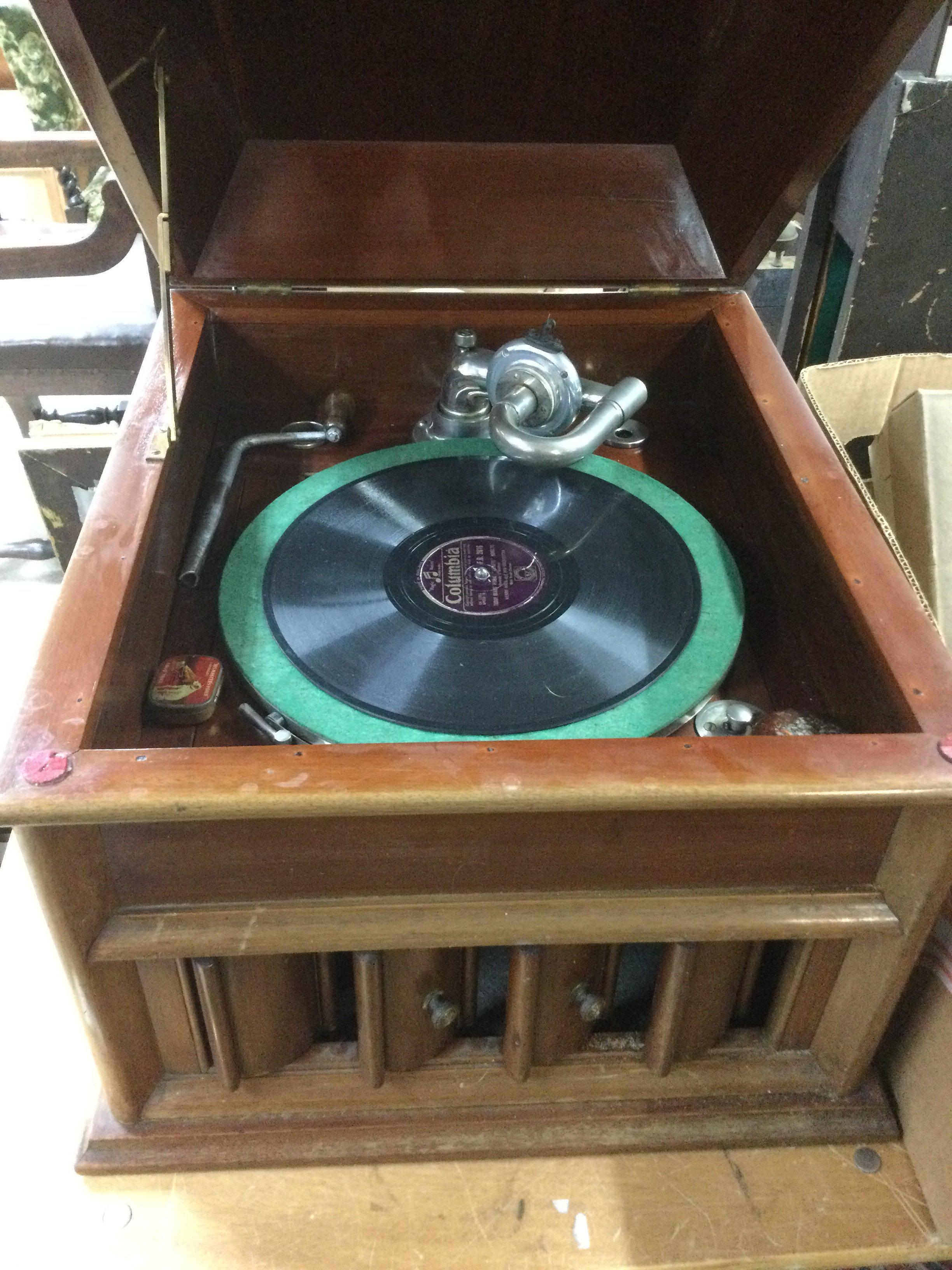 An HMV gramophone and two boxes of 78s. Shipping category D.