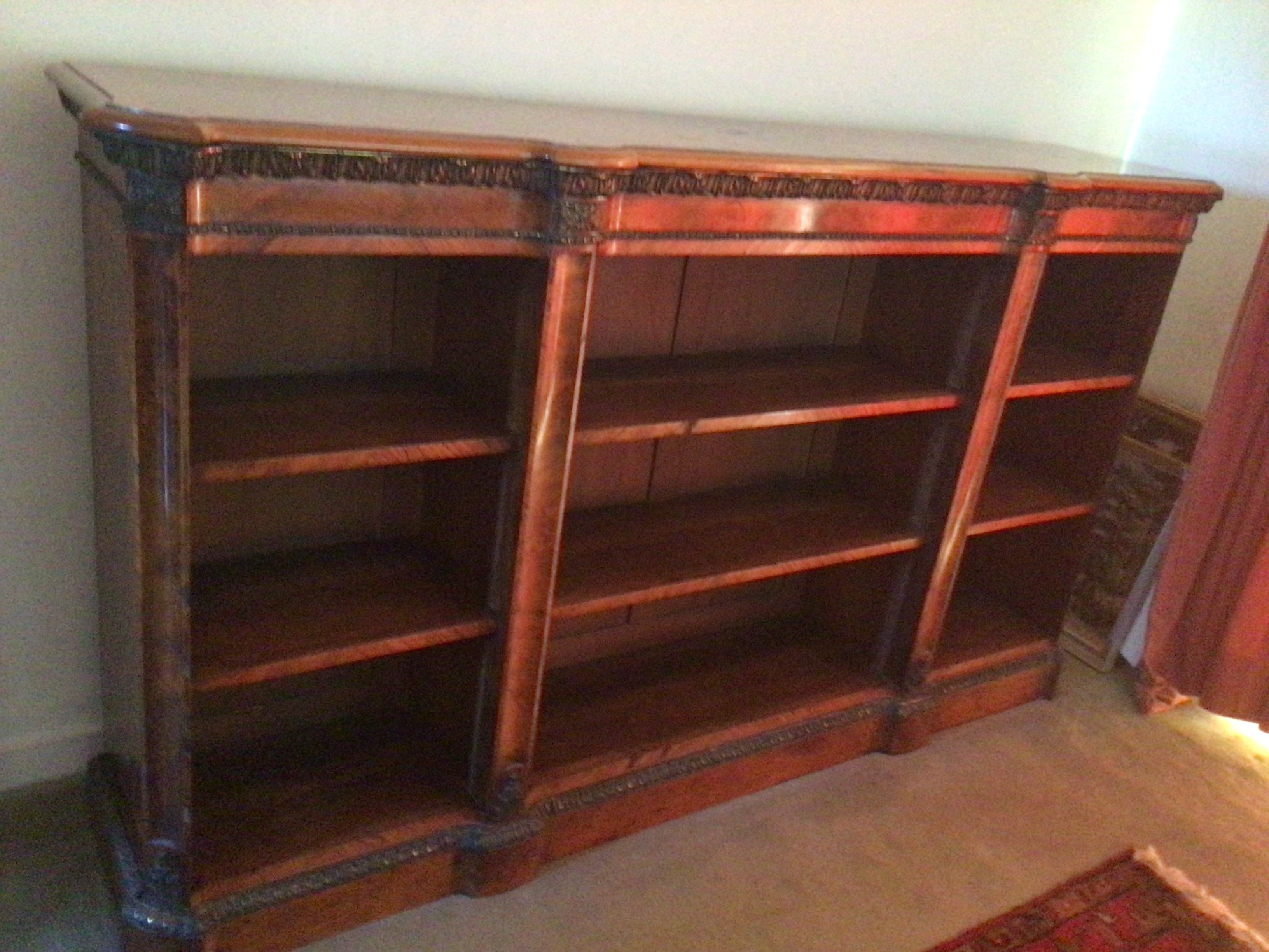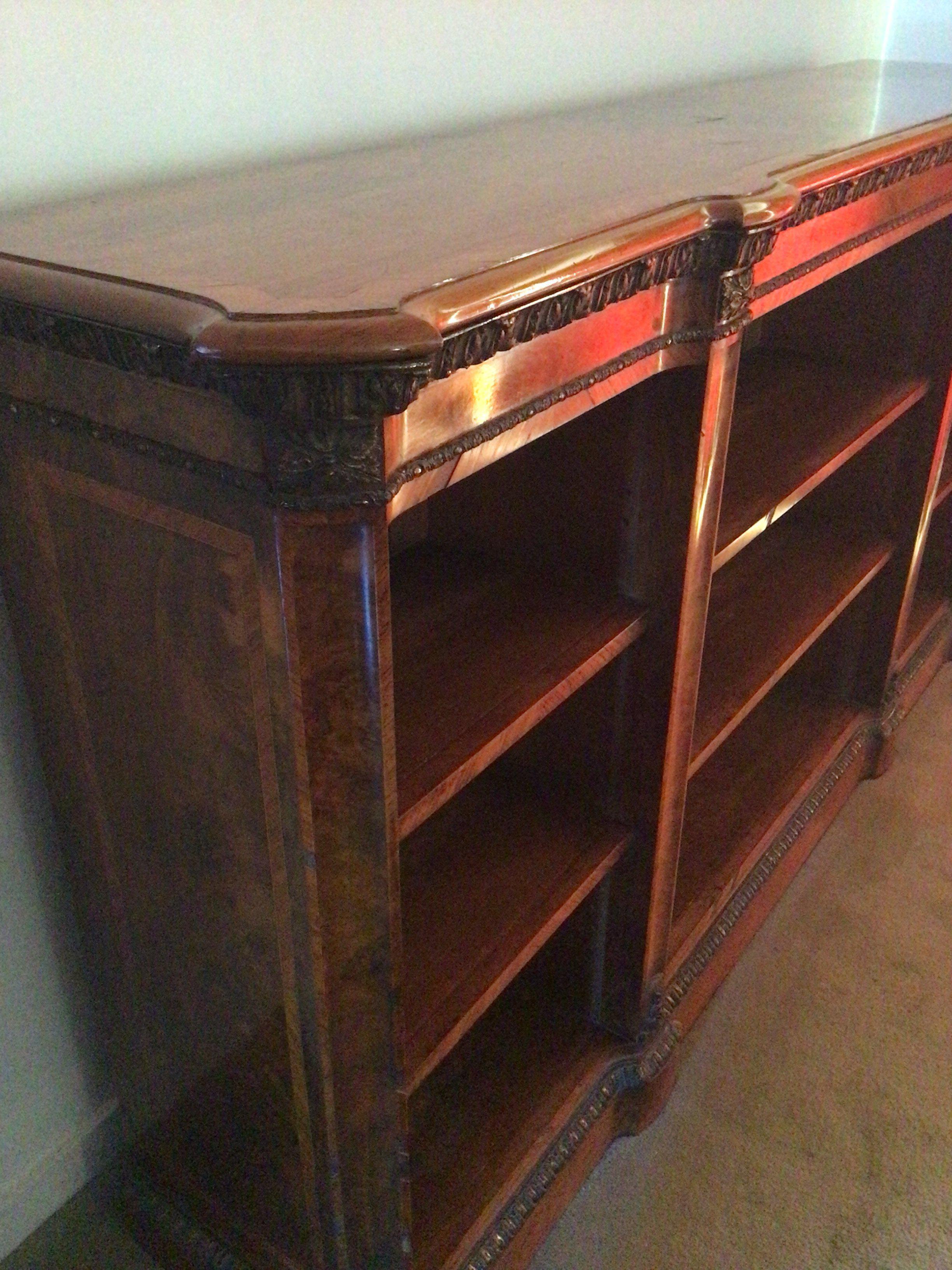 A quality Victorian French influence walnut open bookcase with gilt metal mounts a cross banded edge and three sections of adjustable shelves length 2m x 116 cm heigh approximately. Ice condition in keeping with age.