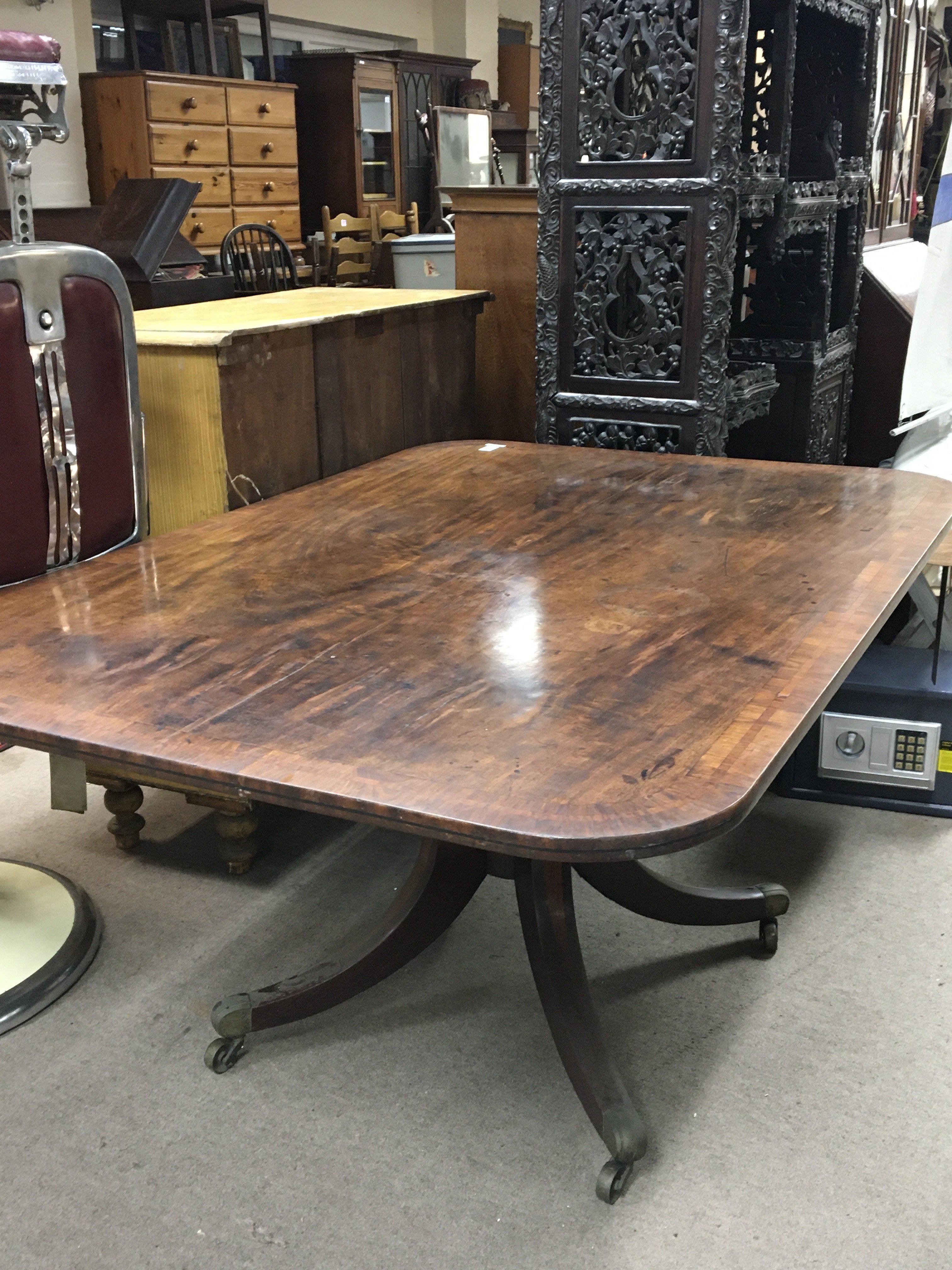 WITHDRAWN- A George III mahogany tip action dining table with a cross-banded edge on splayed inlaid legs terminating in brass cap and caster 148cmx100cm