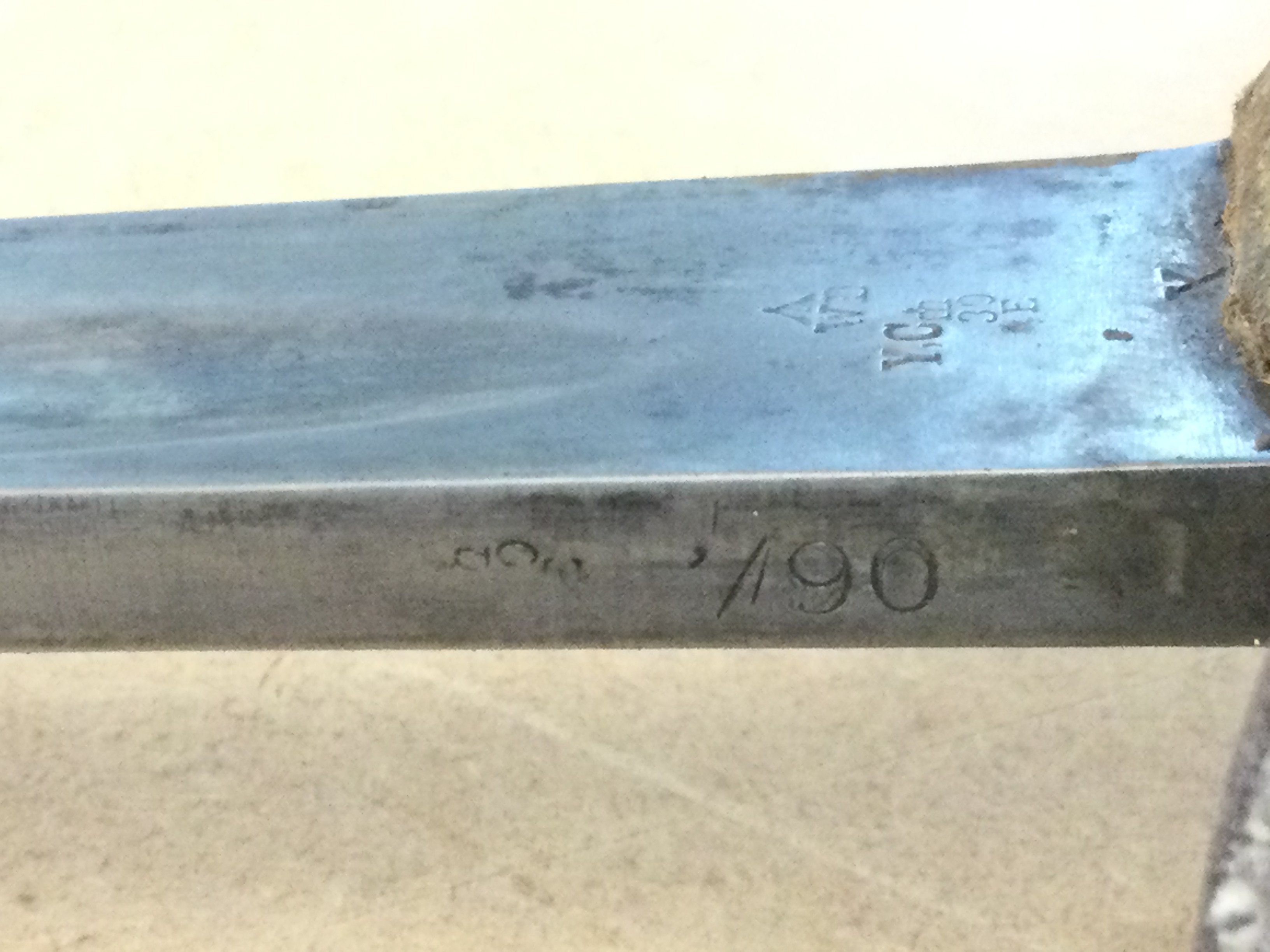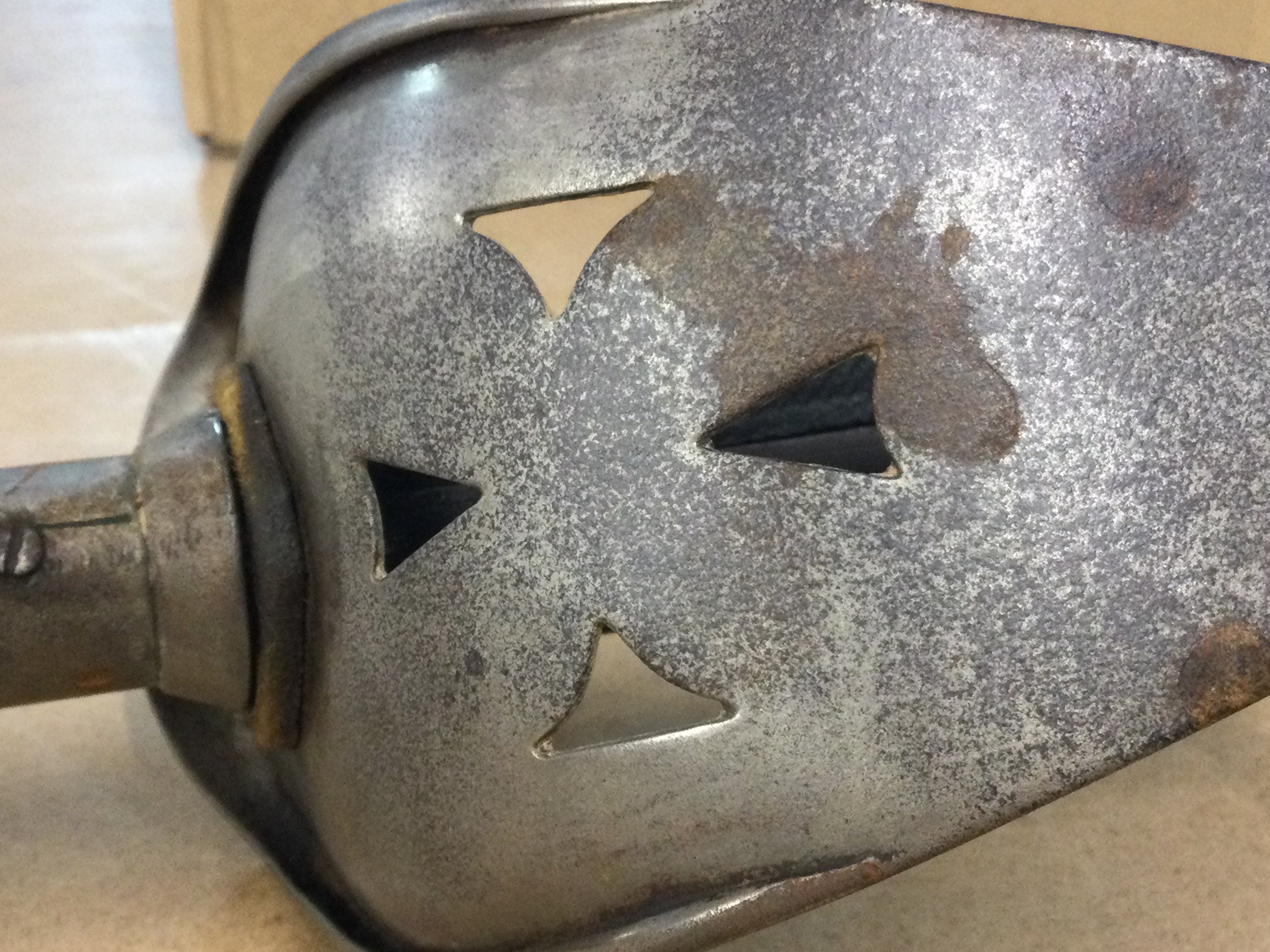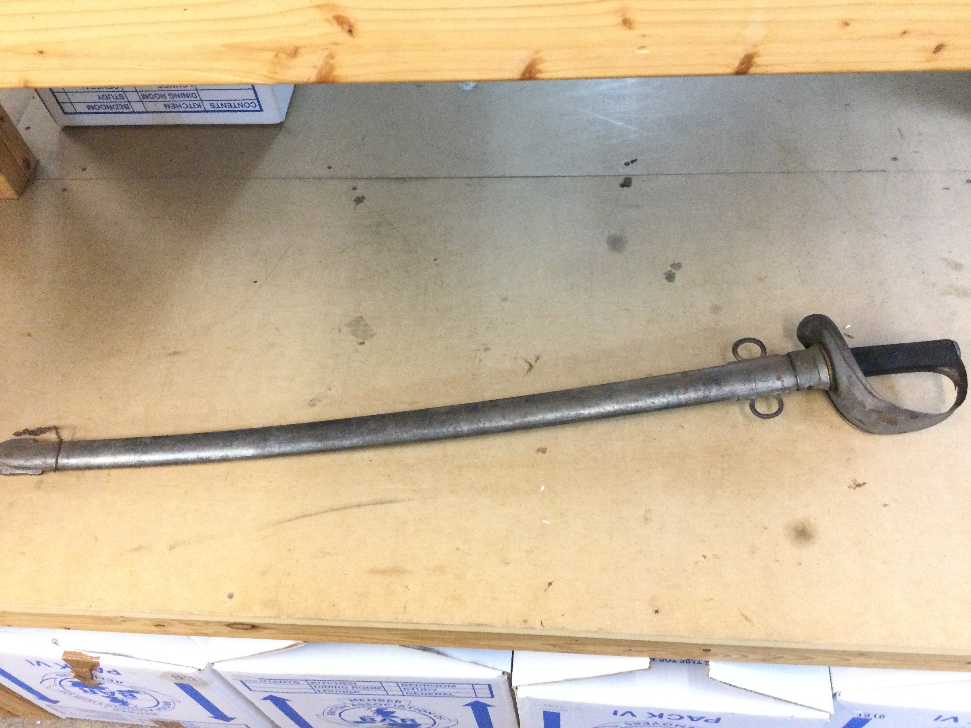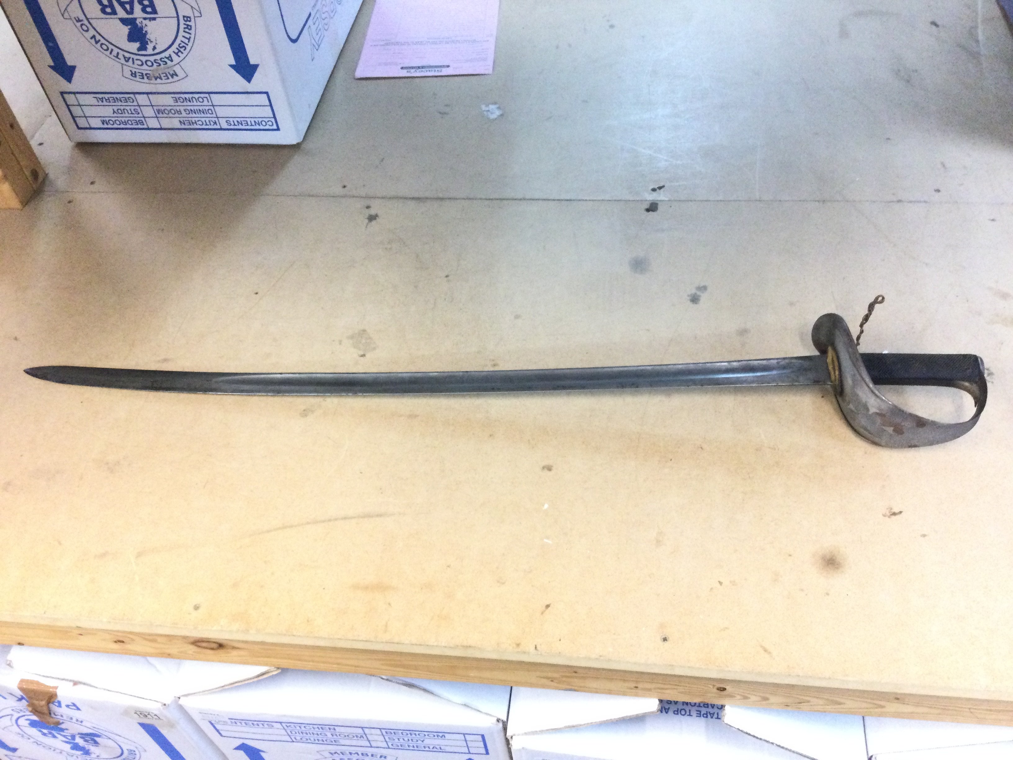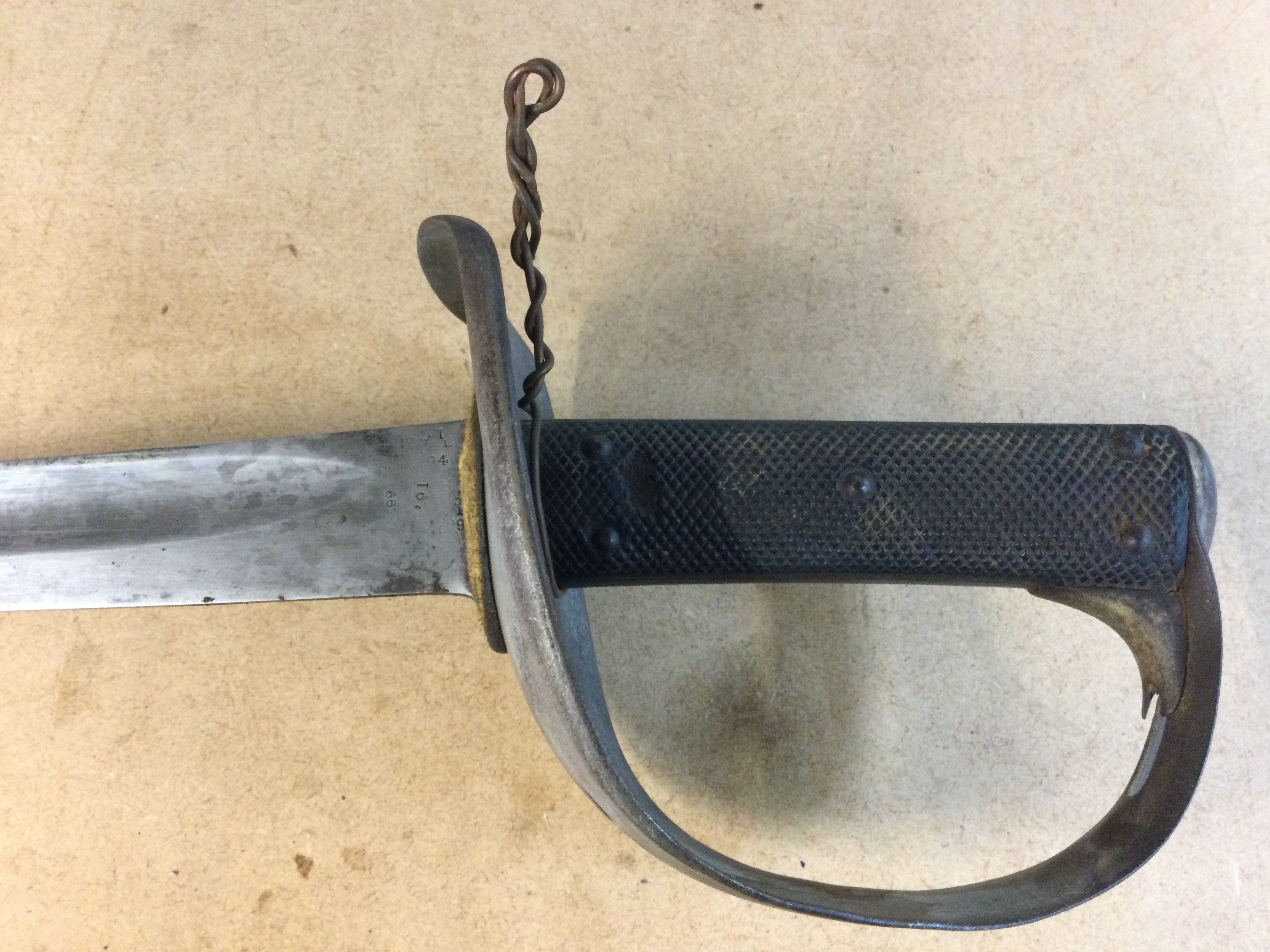 A British Victorian 1885 Pattern cavalry sword with scabbard , the sword has a curved blade and a basket hilt with a pierced Maltese Cross symbol .blade 88cm long total length 102cm. This lot cannot be posted