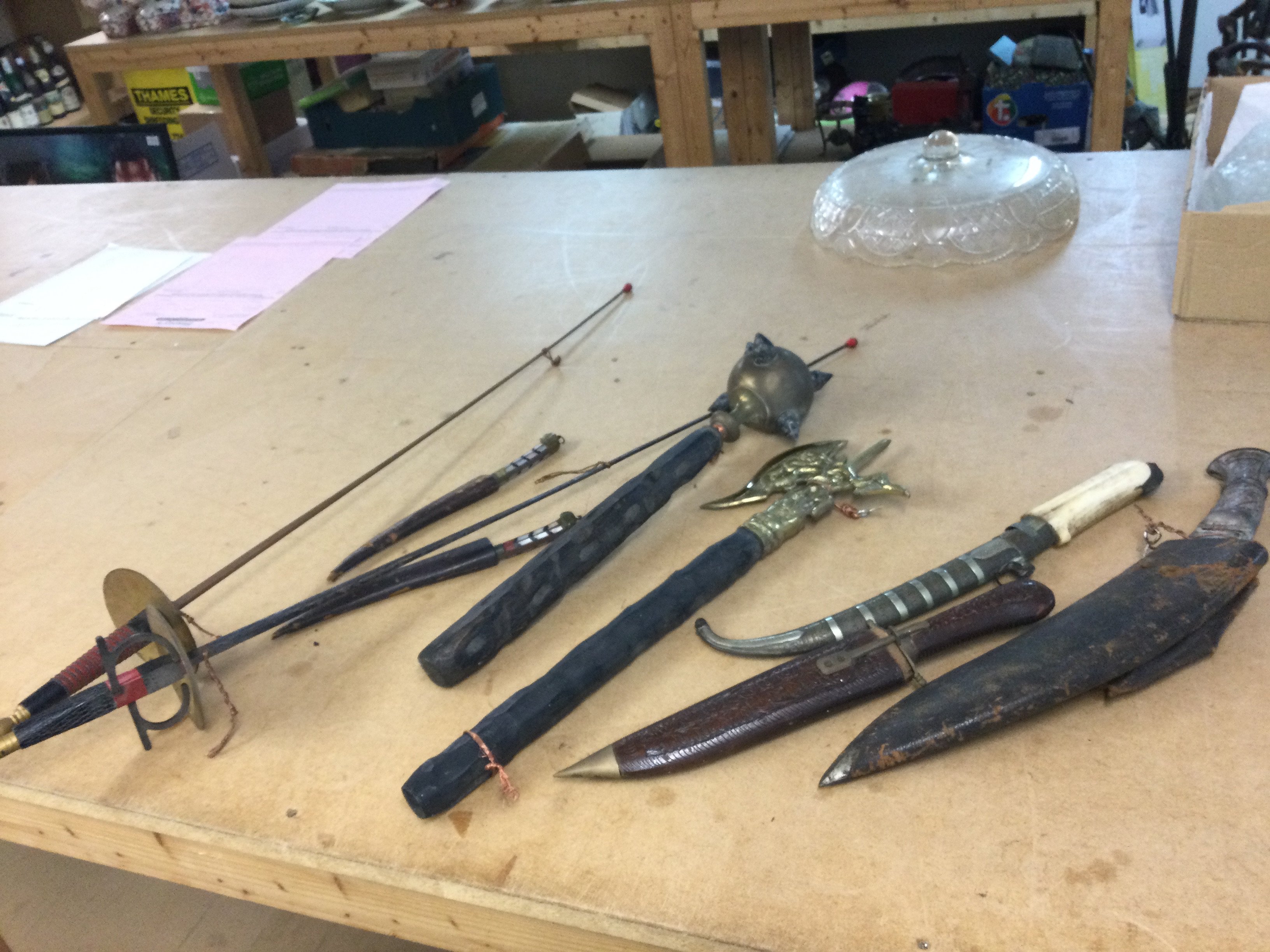 A collection of weaponry including a Mace, Fencing sabres, axe, Kurki, bone handled dagger. This lot cannot be posted