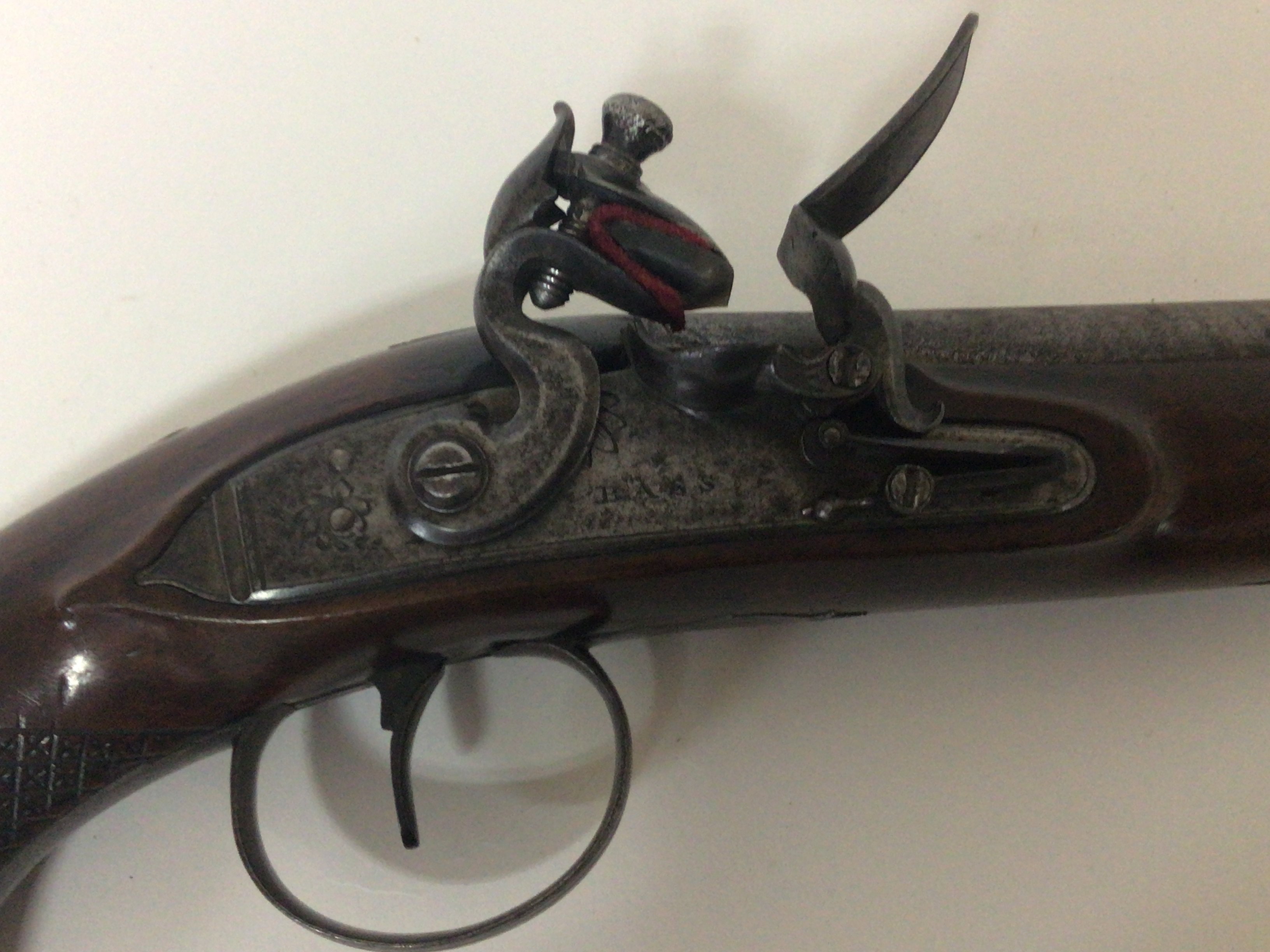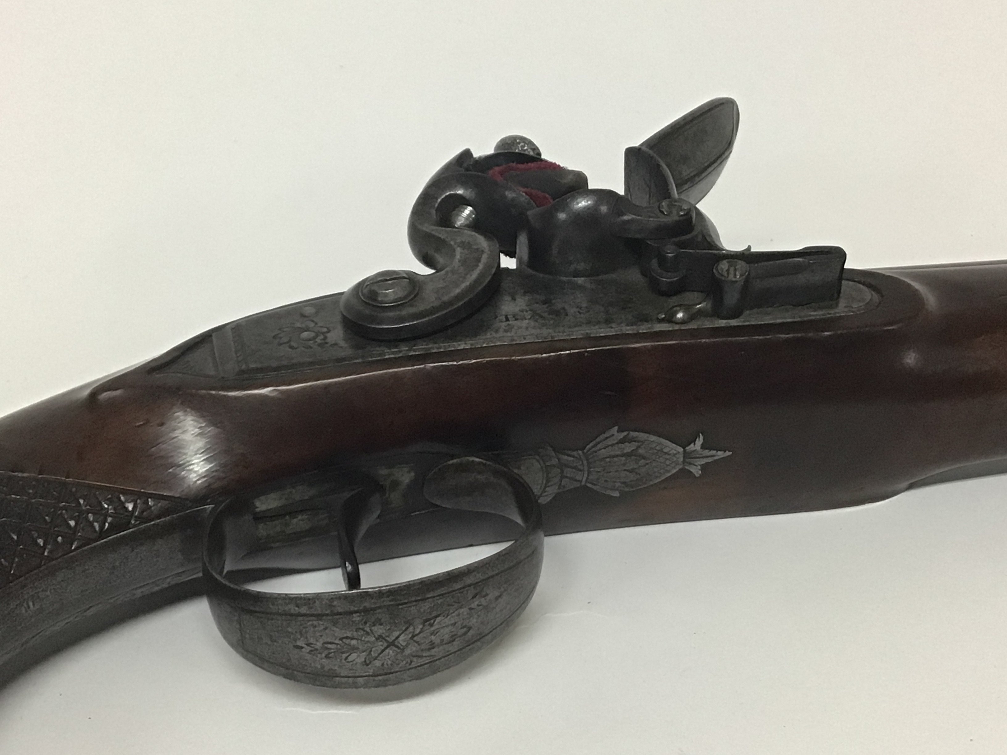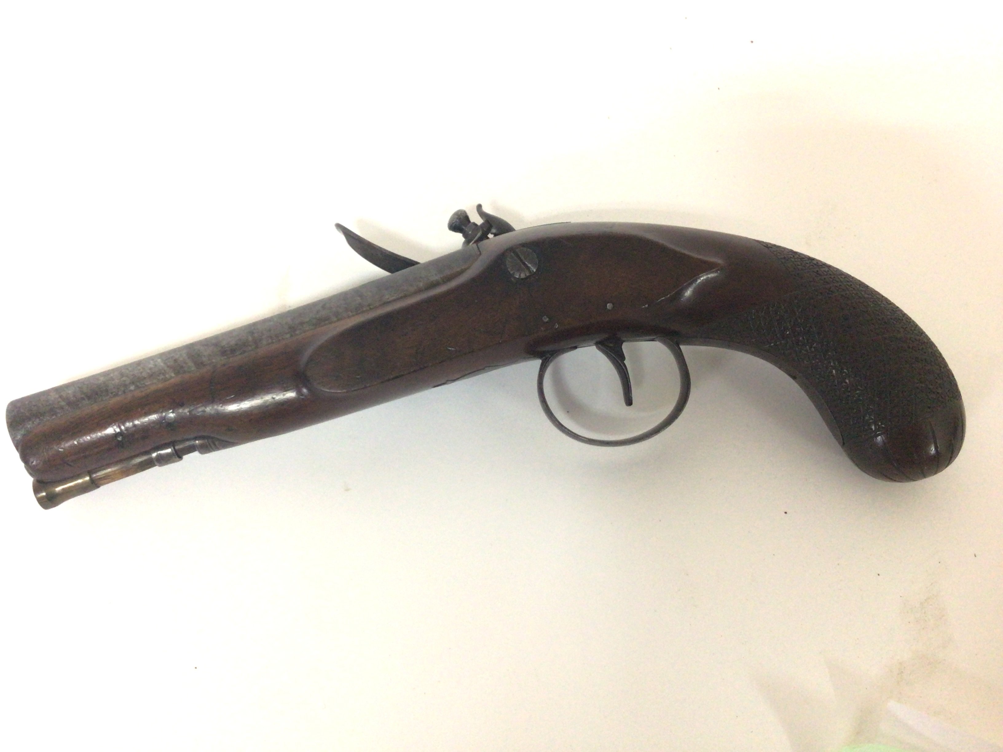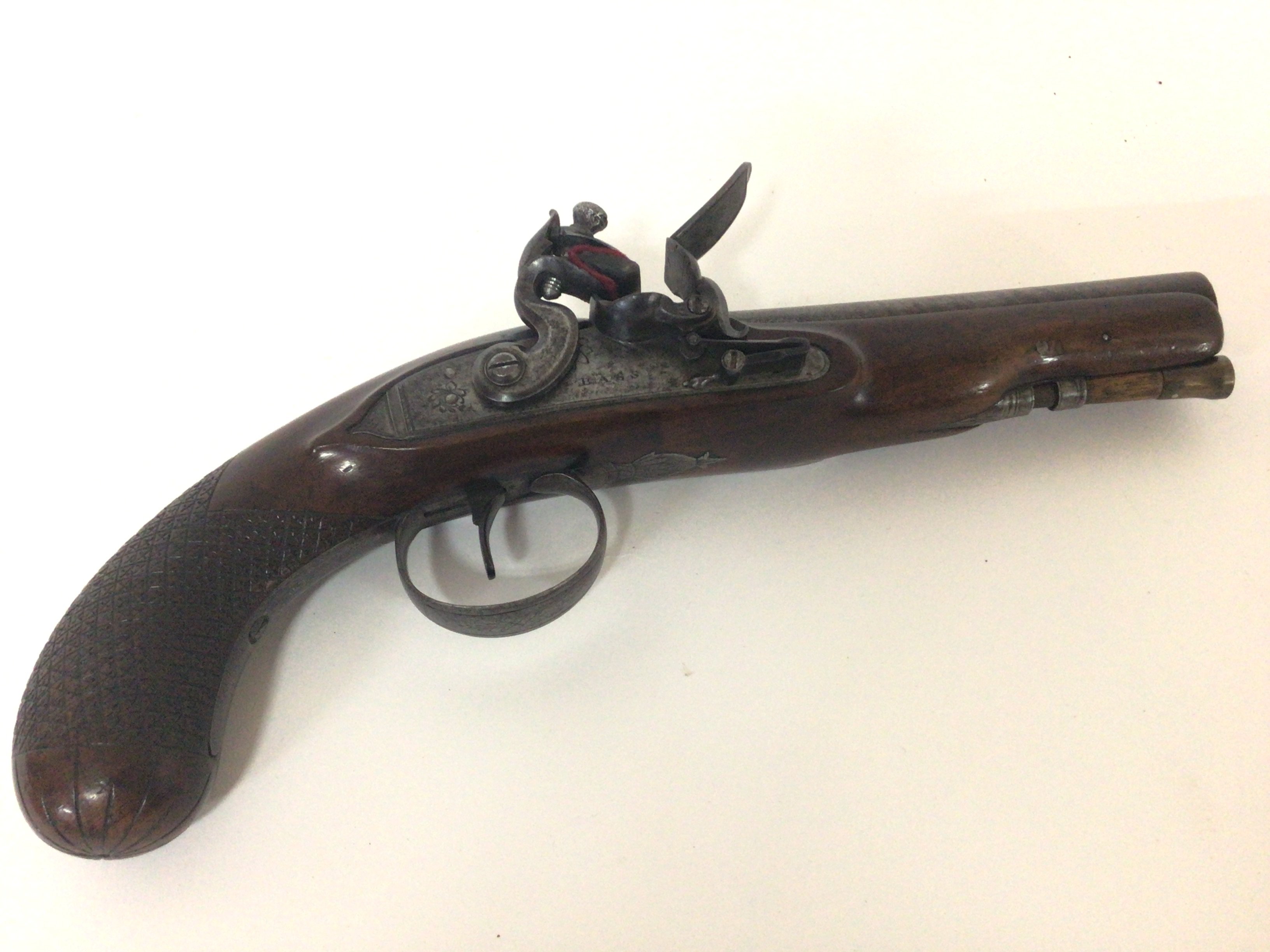 A Quality late 18th century flintlock pistol maker John Bass of Grantham Lincolnshire. The Pistol with carved walnut full length stock elaborate trigger guard action engraved with makers name Bass in very good condition action functional. John Bass was a nephew of world renowned London Gun Smith John Twigg there was a family partnership Twigg & Bass 1788-90 length 30cm
