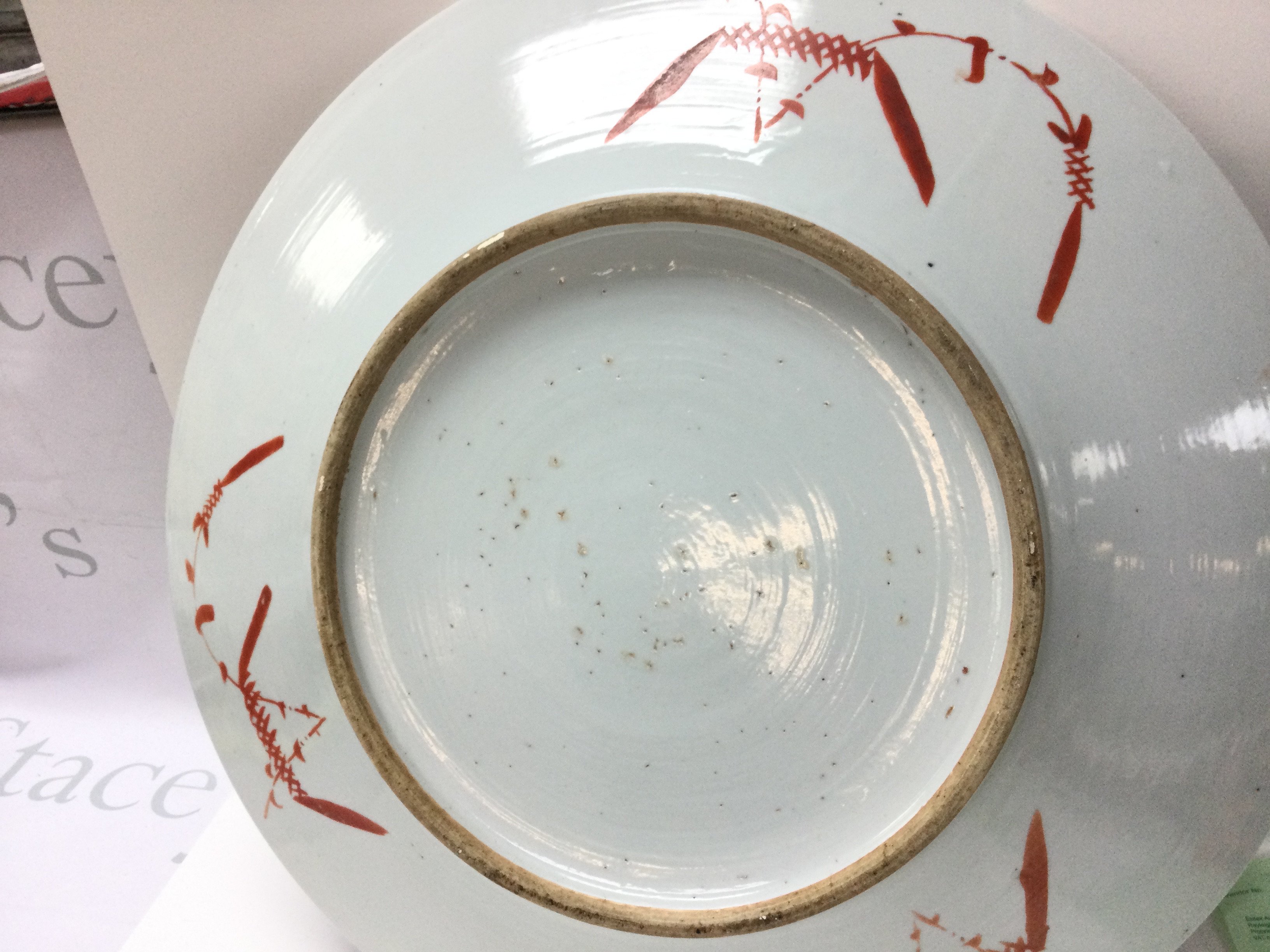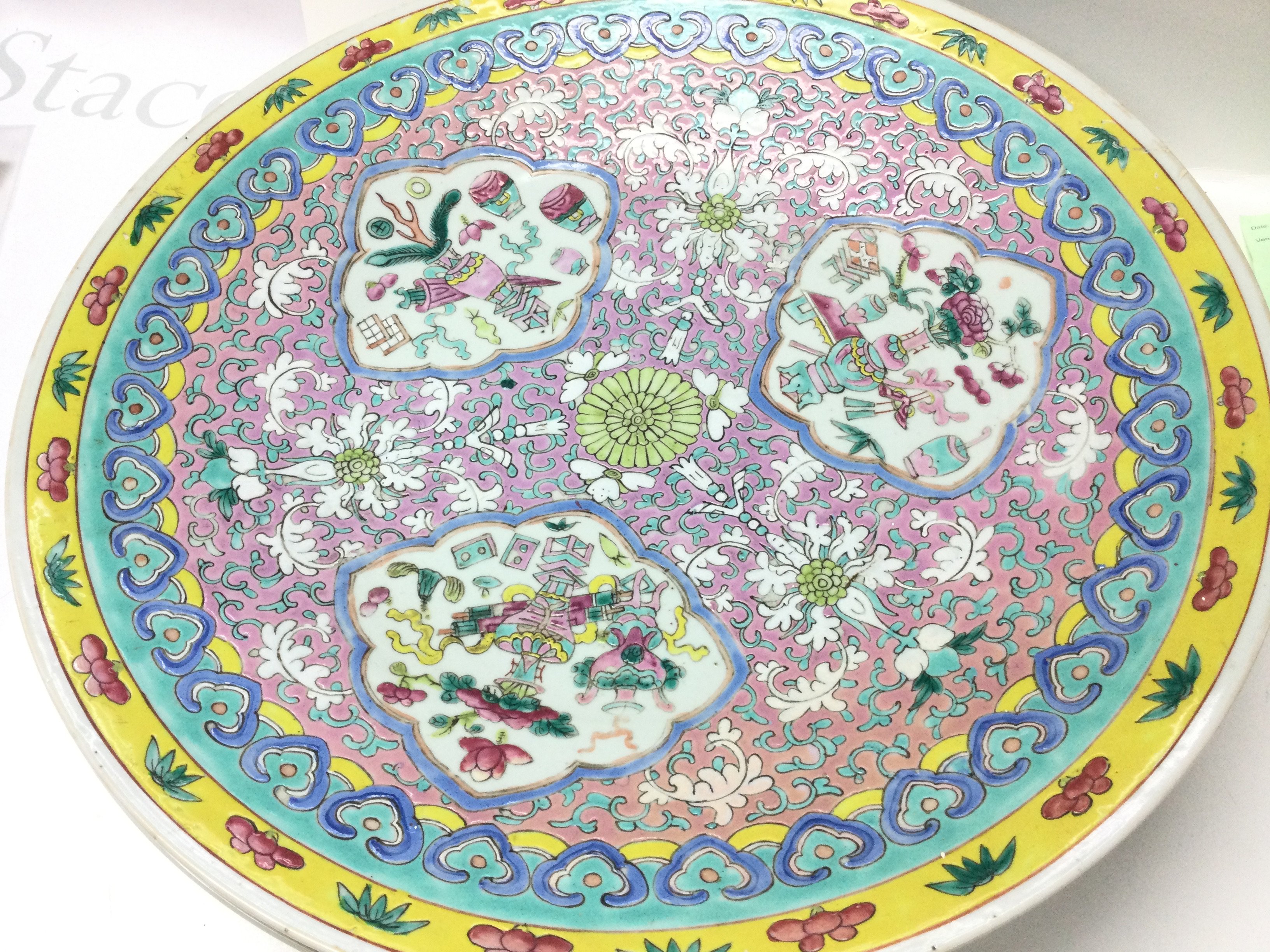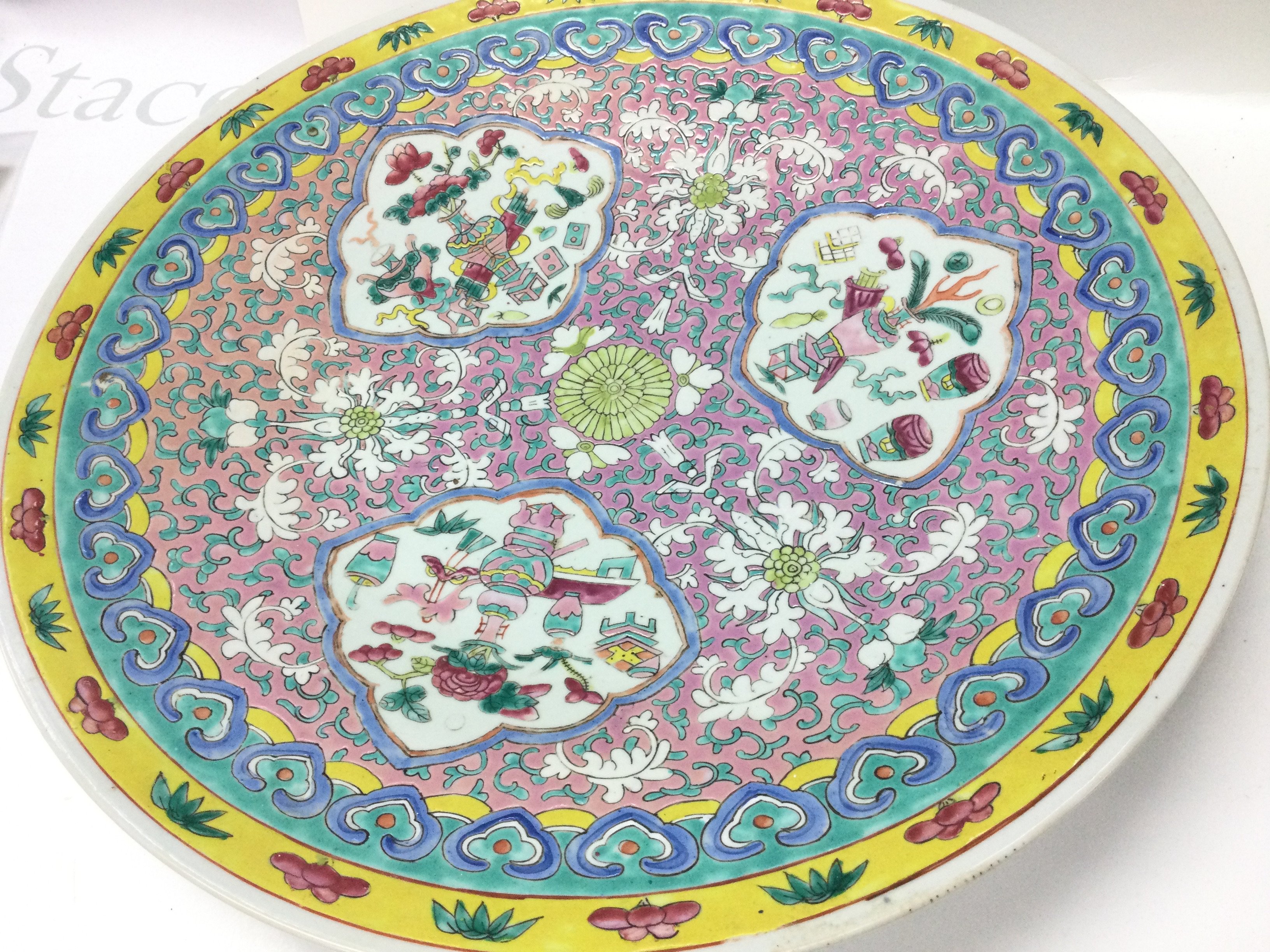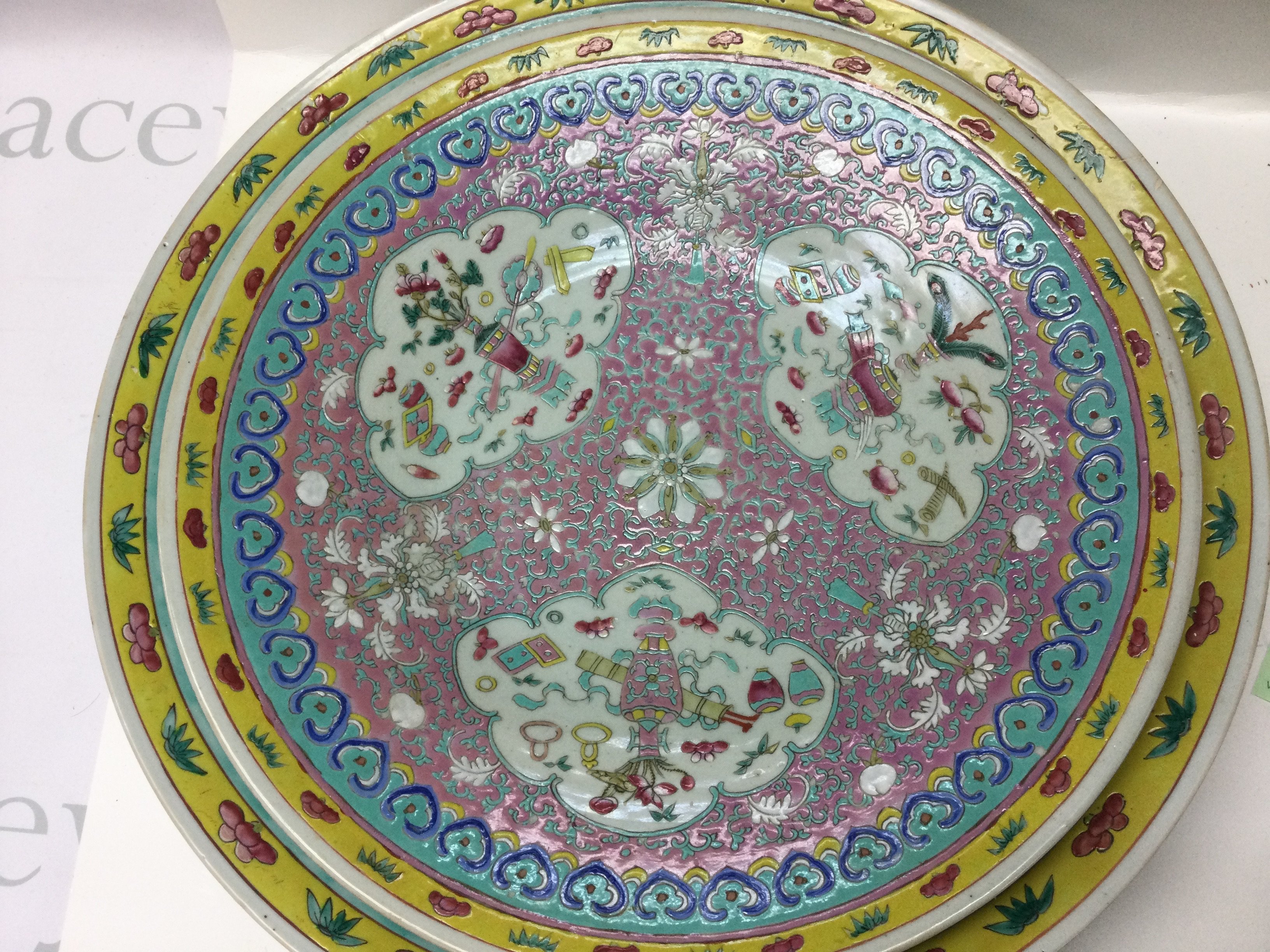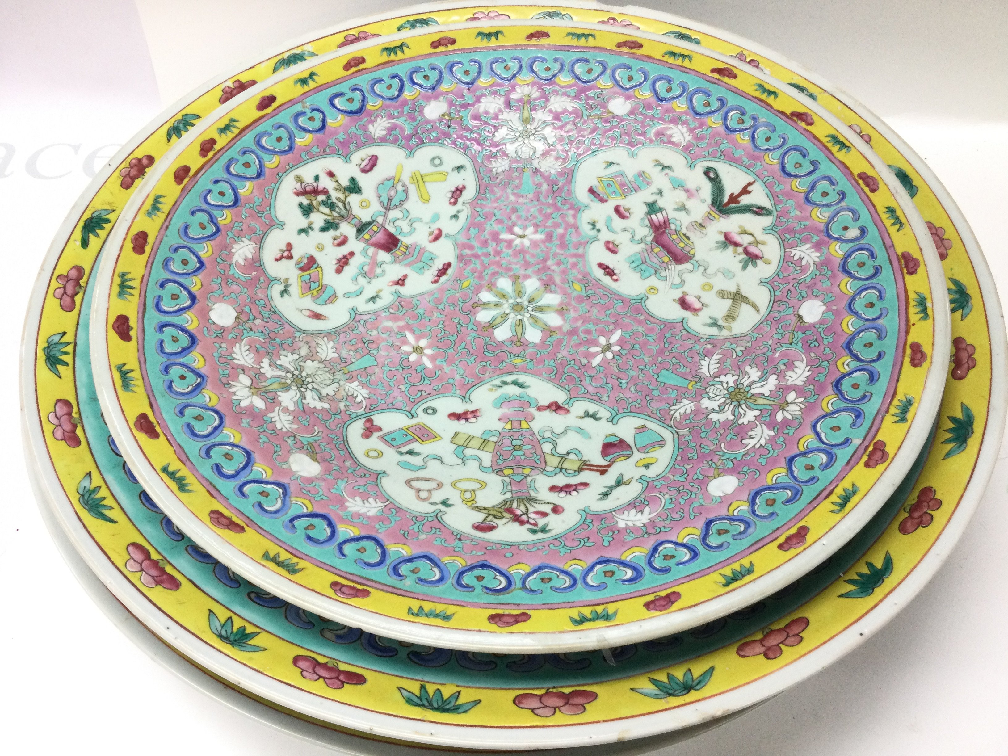Three Chinese Republic period porcelain large yellow, pink and blue dishes. With stands. Ranging from 40cm and 47cm wide. Chips seen on plates, This lot cannot be posted