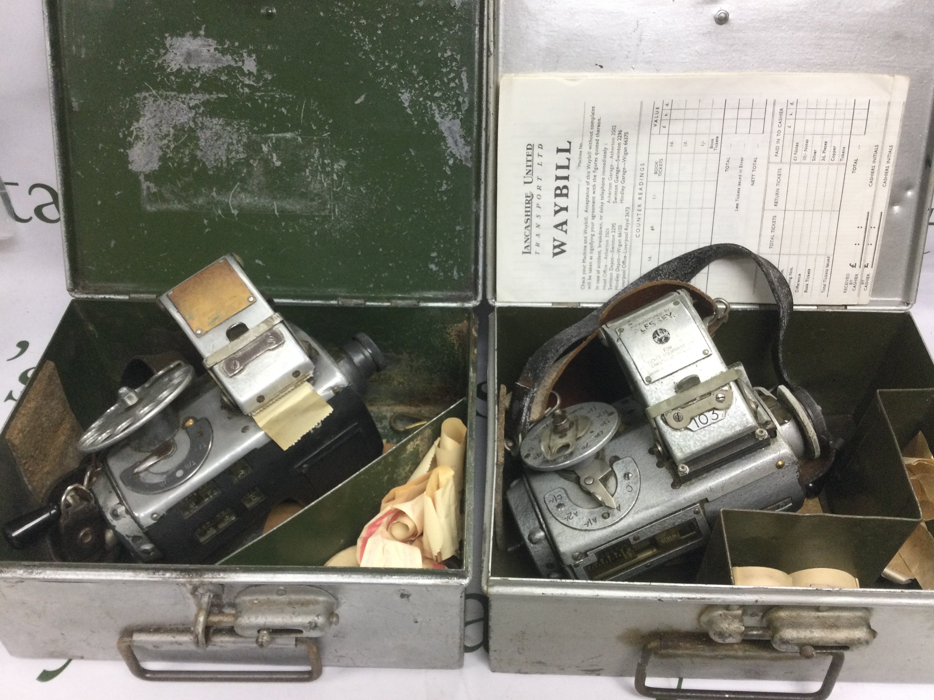 Two vintage bus conductor's ticket machines, one manufactured by TIM of Cirencester plus one other. Both housed in original carry cases. Shipping category D.