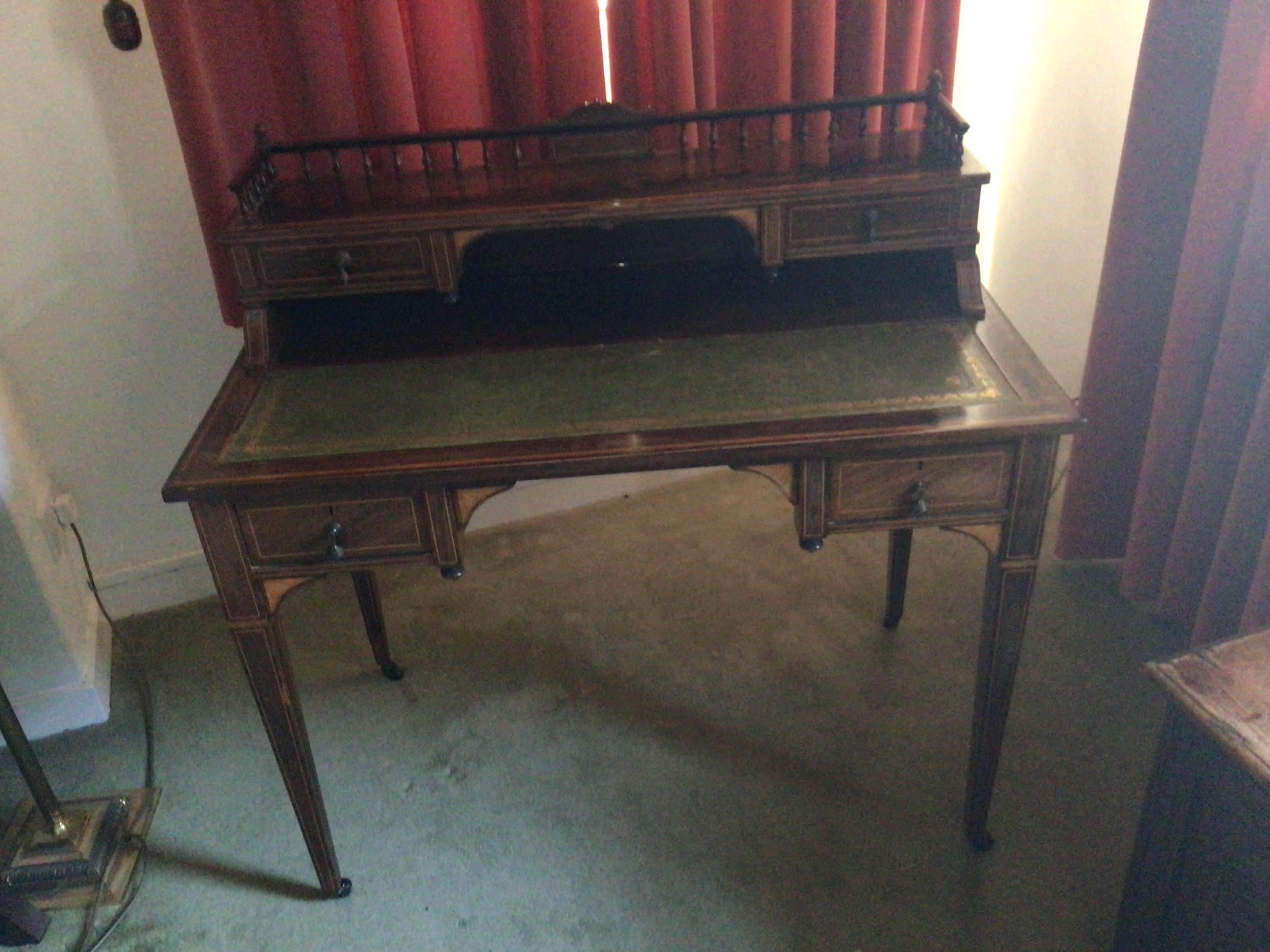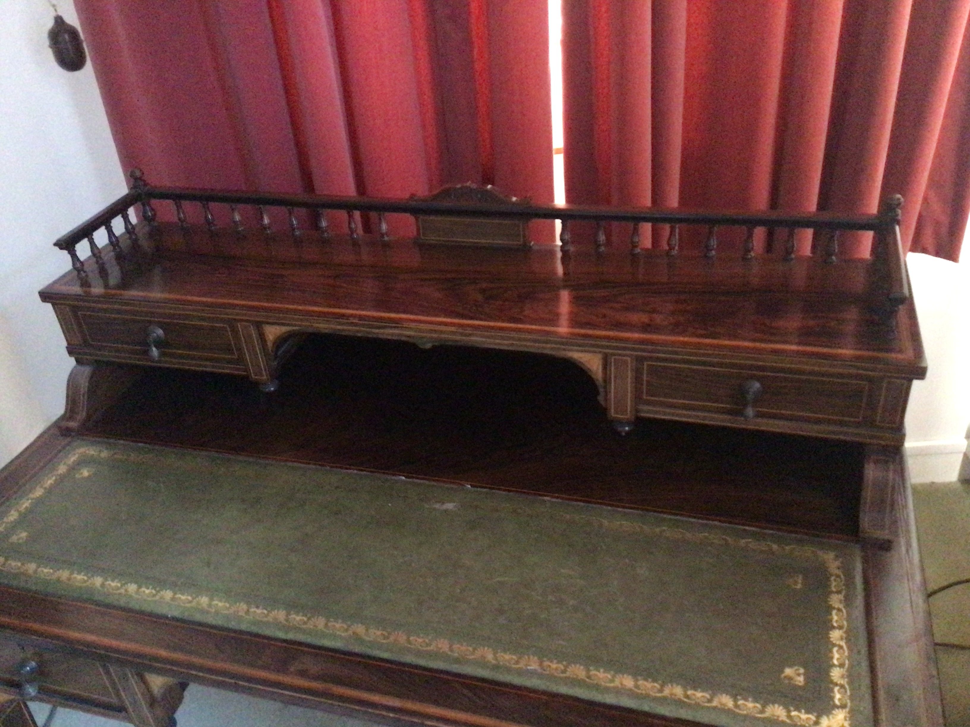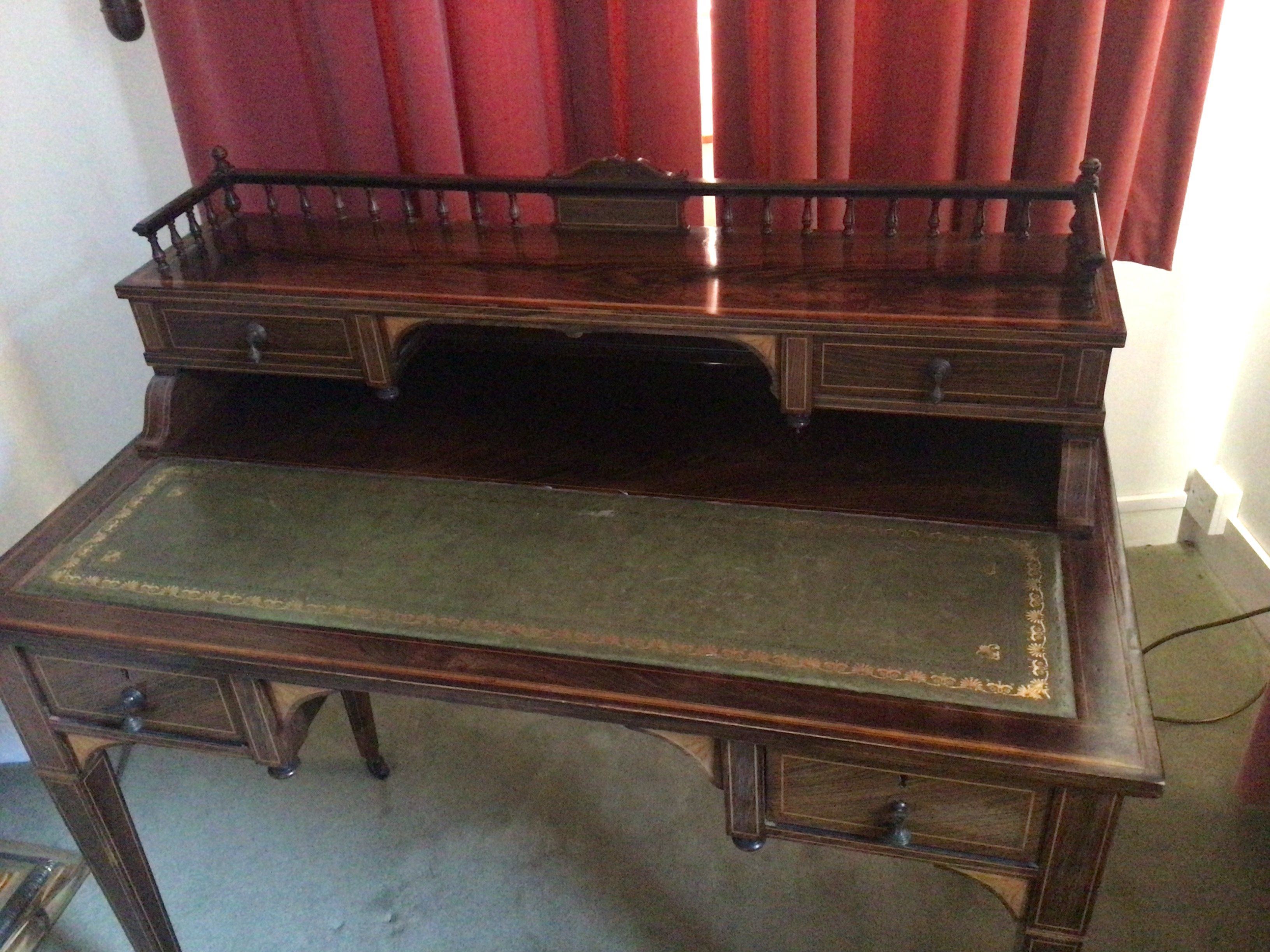A quality Edwardian inlaid rosewood desk with a raised gallery and green leather inset top.