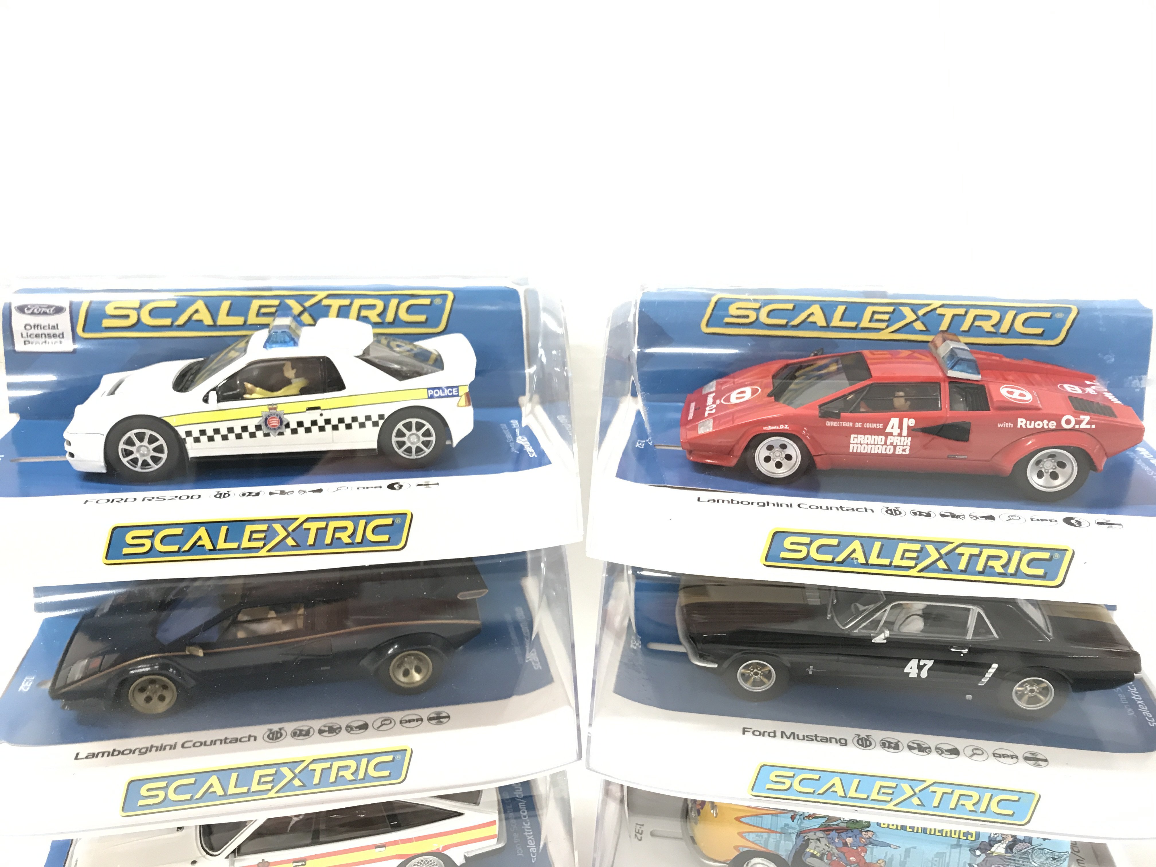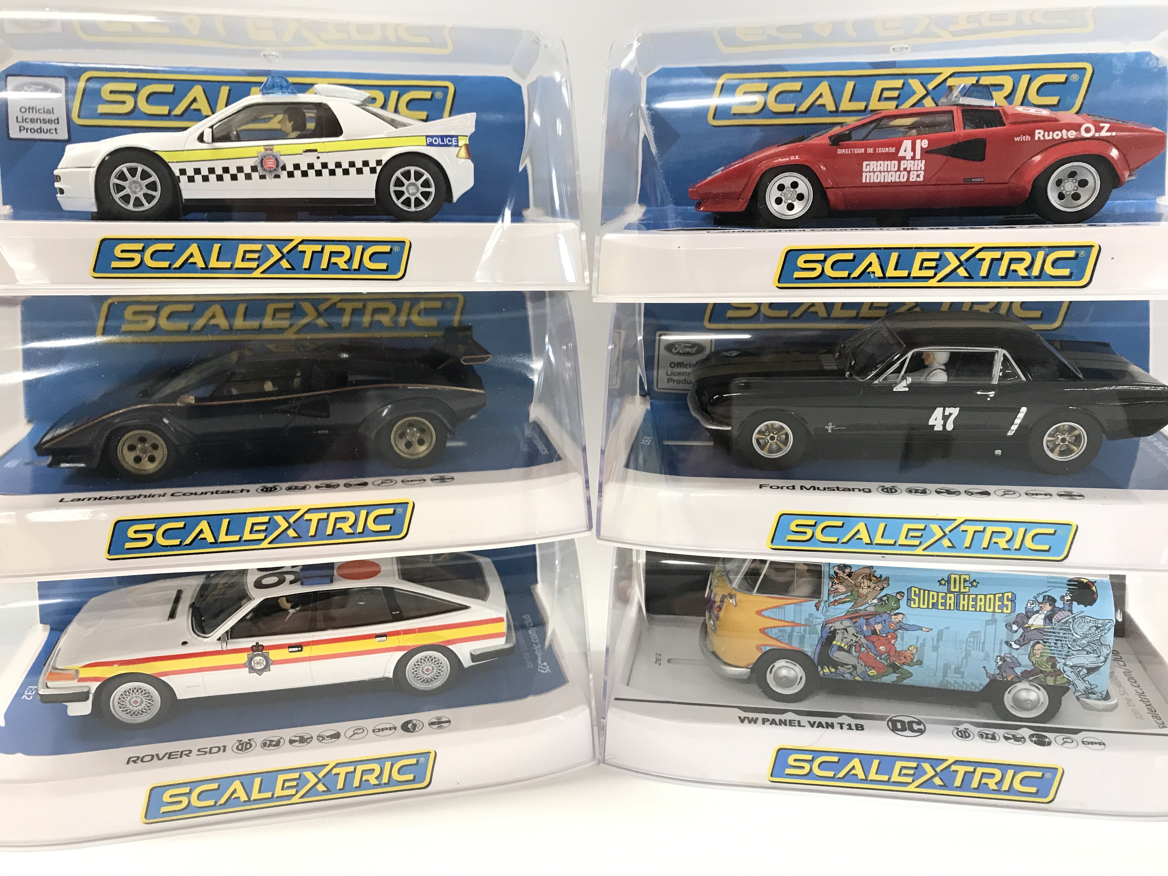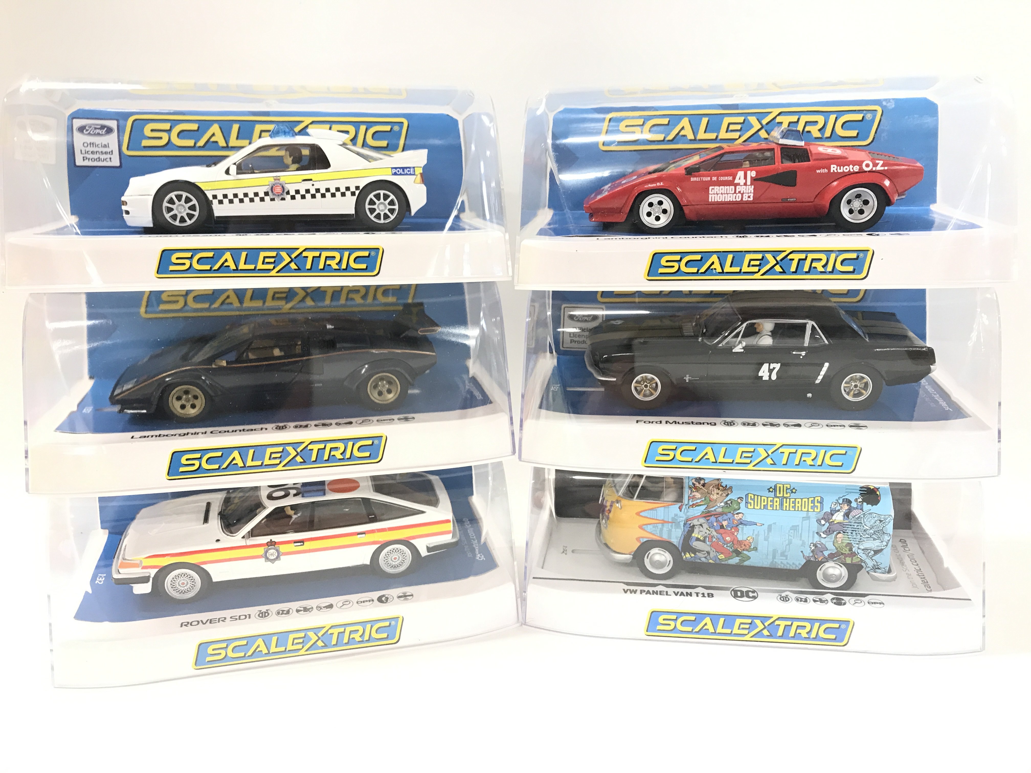 6 Boxed Scalextric Cars. A Ford RS200. 2 X Lamborghini Countachs. A Ford Mustang. A Rover SD1 And A VW Panel Van T1B.