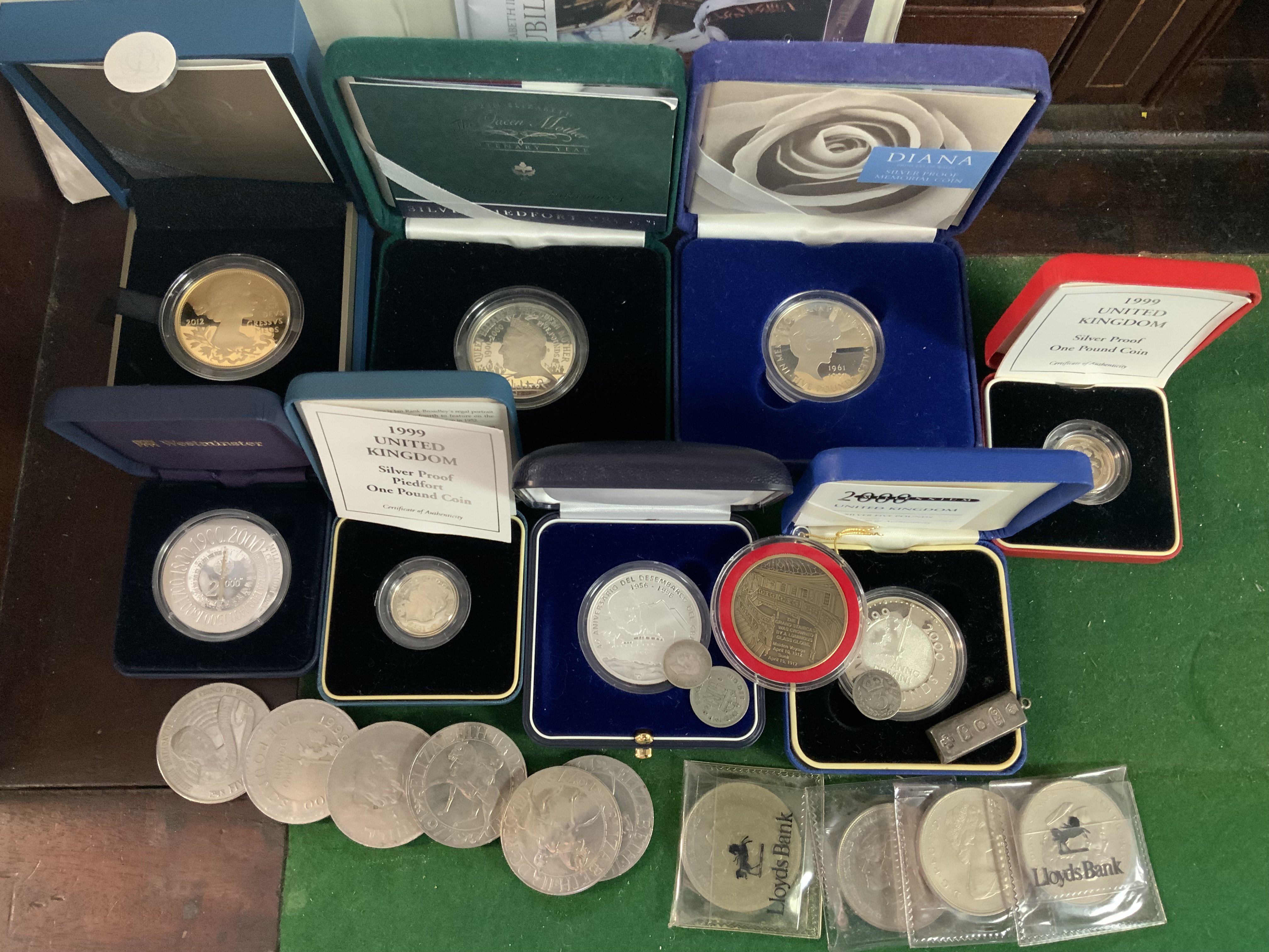 A collection of silver proof and piedfort proof coins and nickel silver crowns.