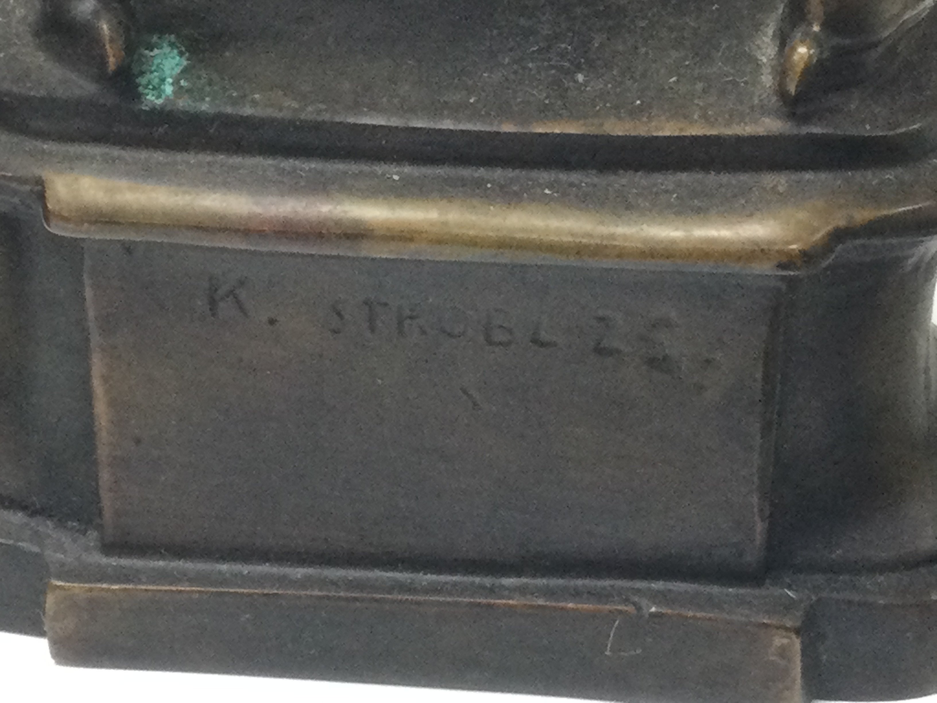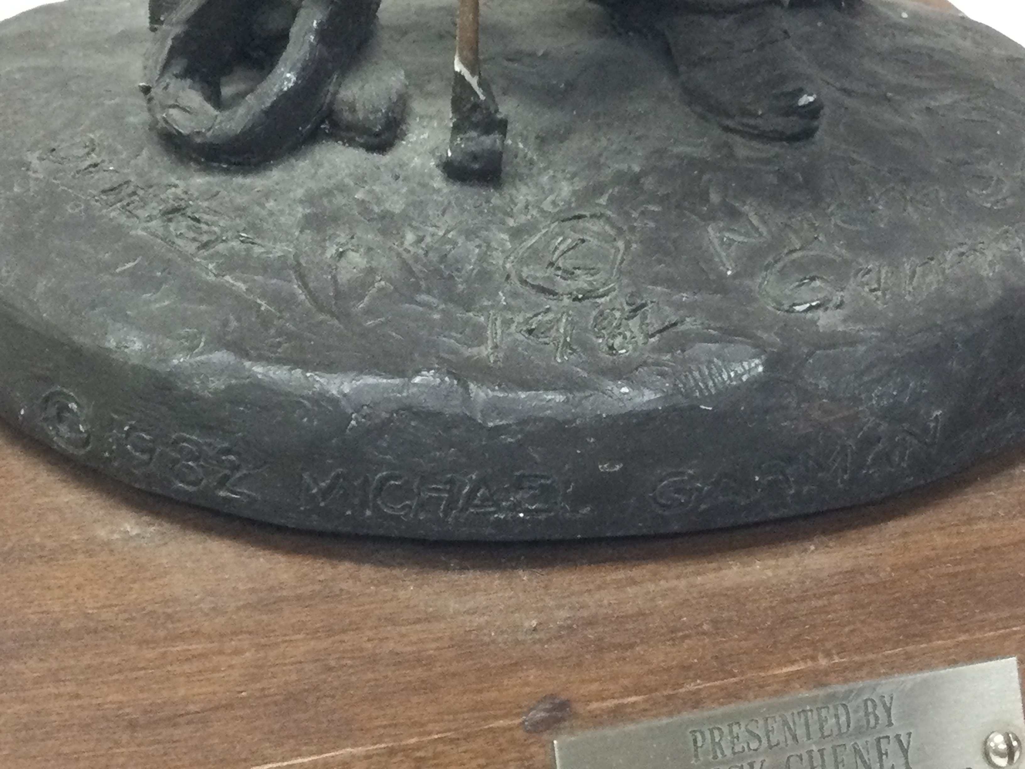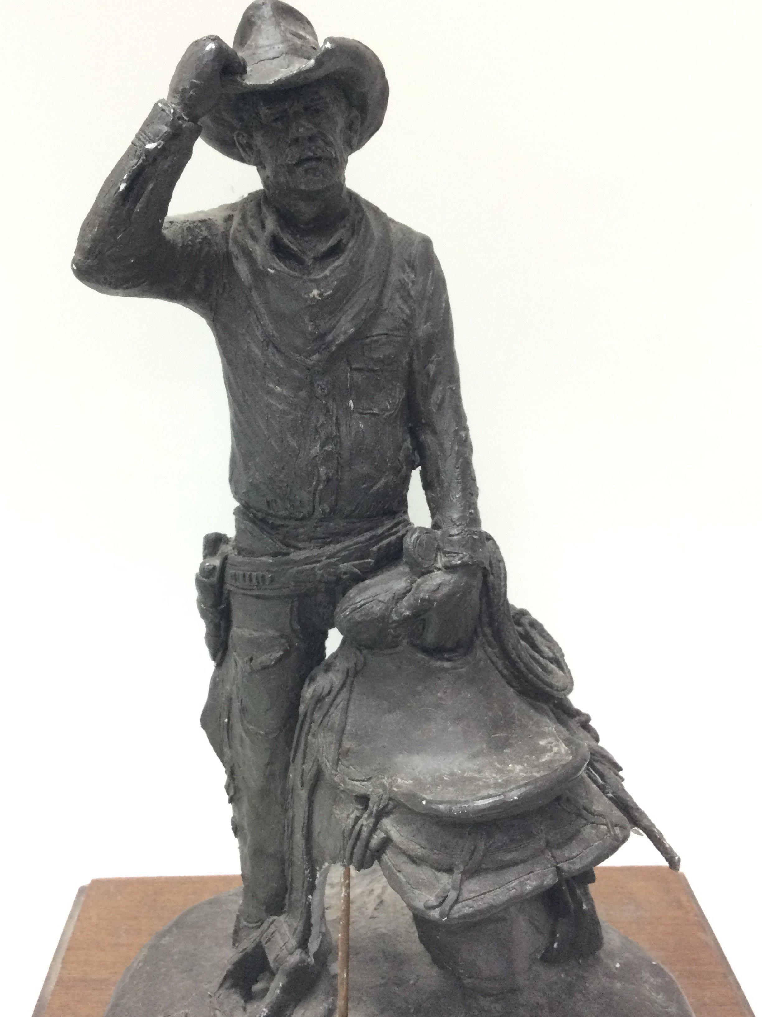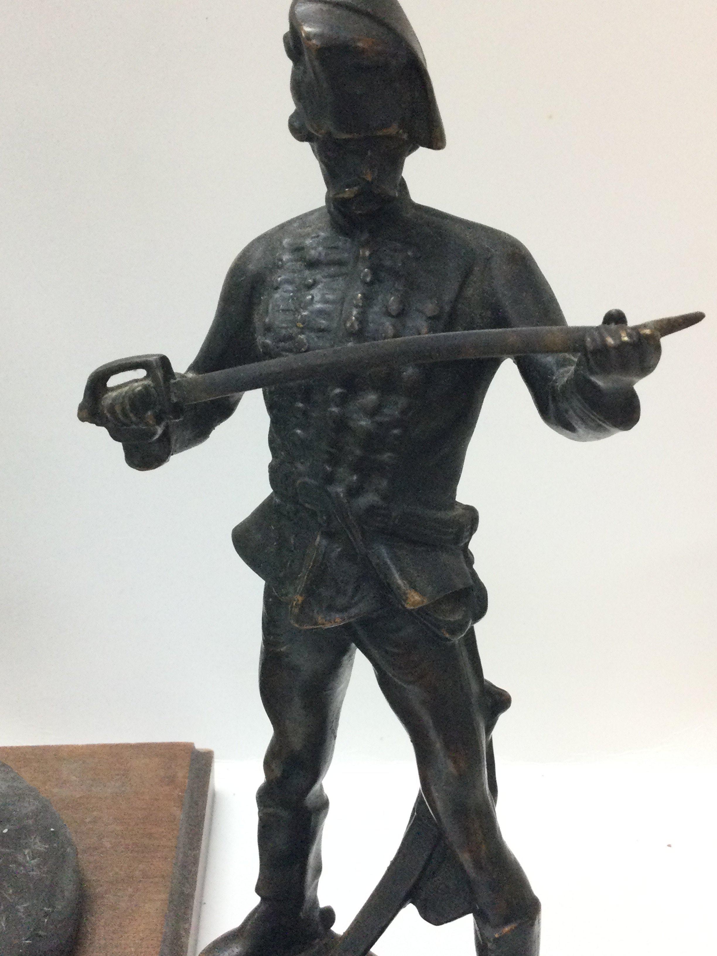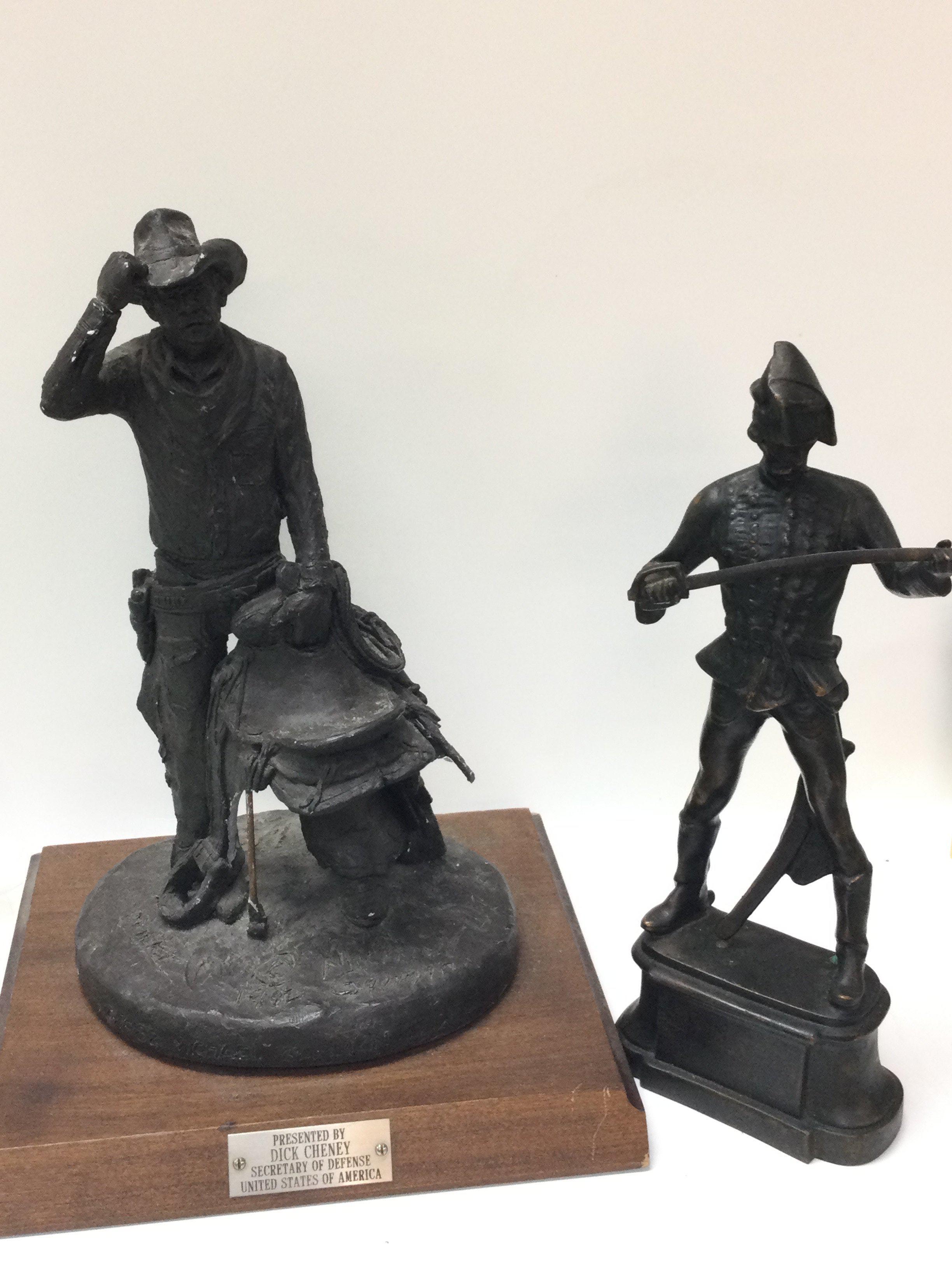 A continental bronze figure of Hadik Hussar marked Kisfaludi Strobl and a Cowboy figure marked 1982 Micheal Garman. Presented by Dick Cheney secretary of defence, United States of America. 26 & 31cm tall. Postage category B