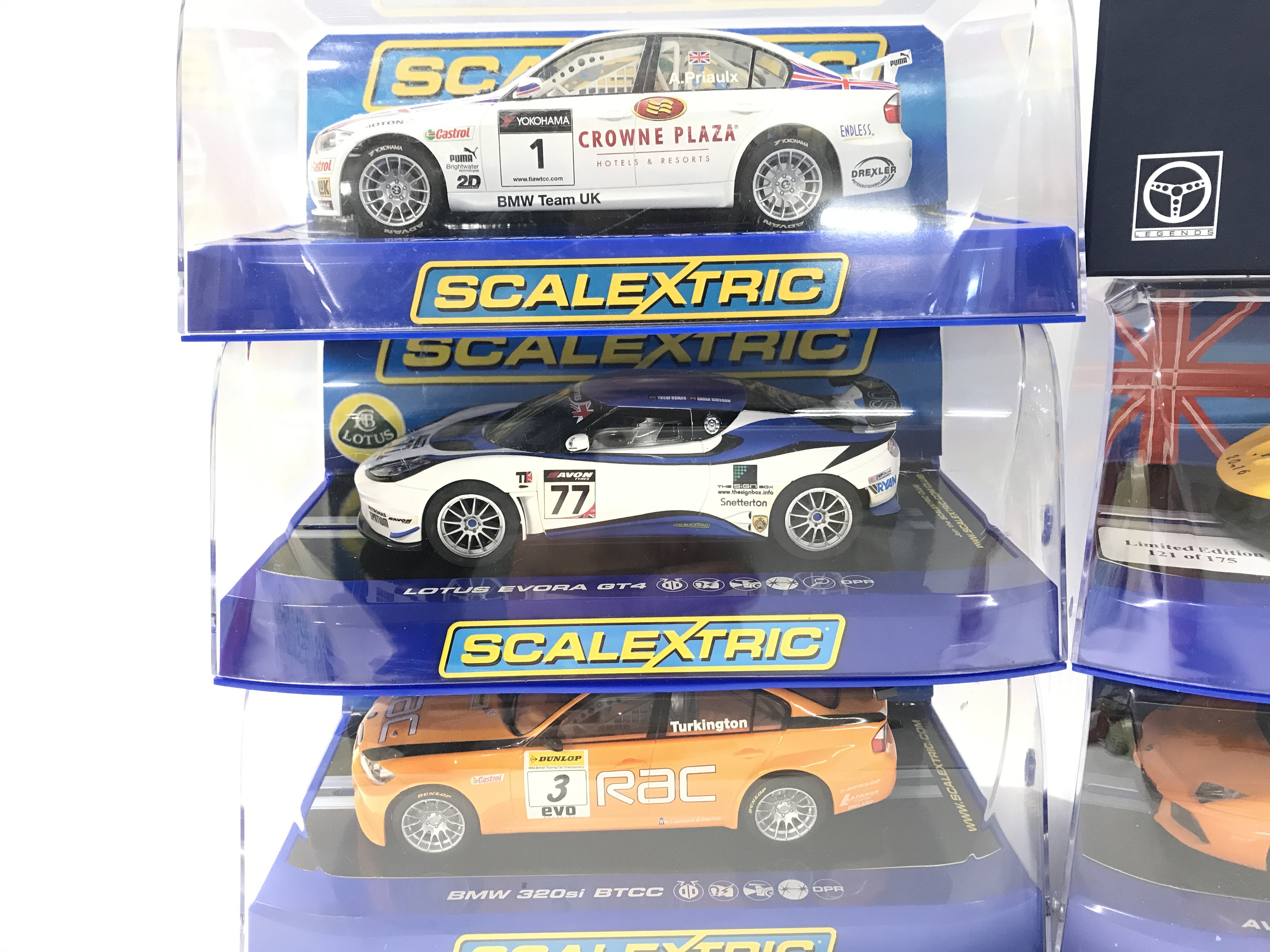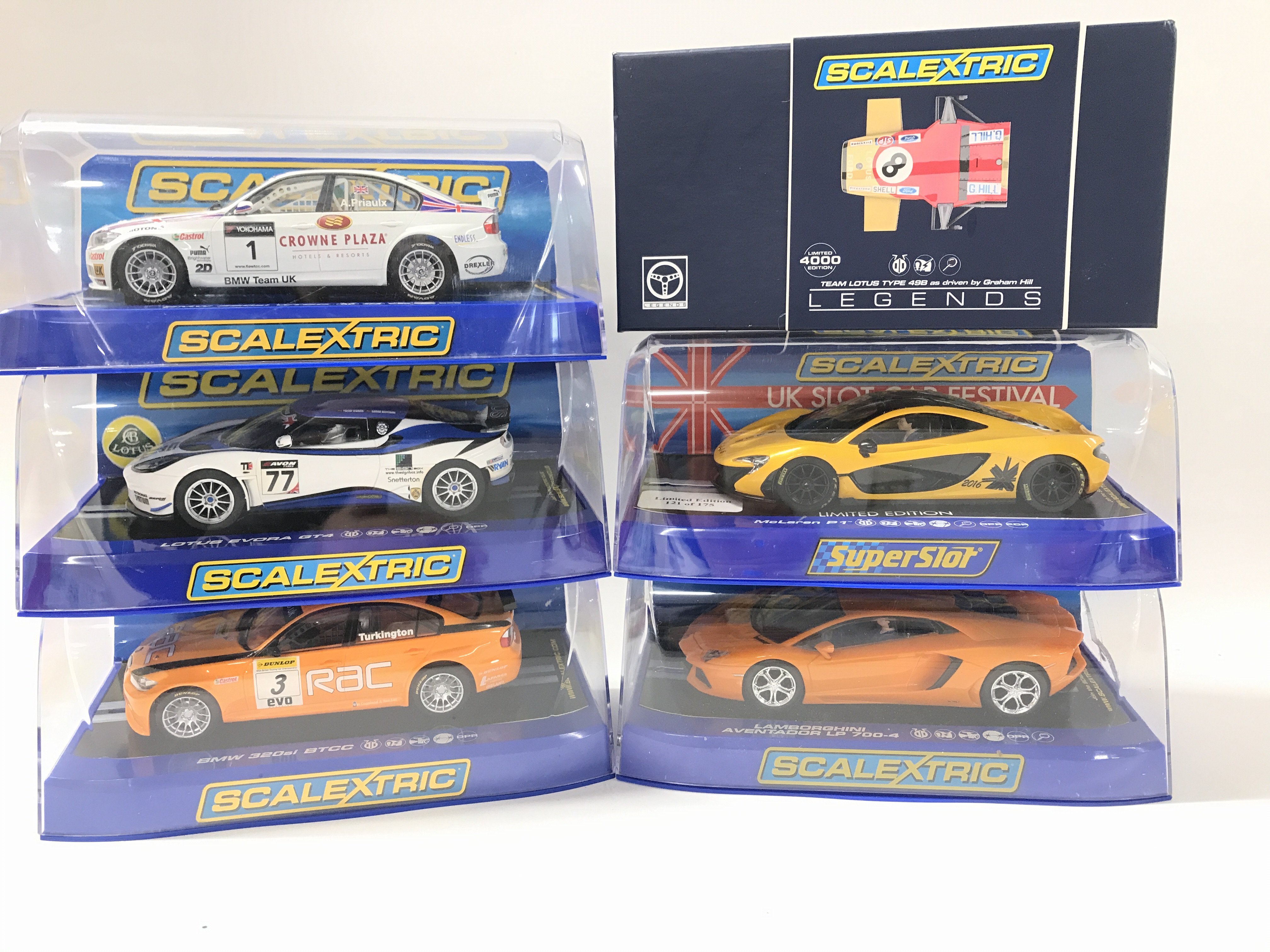 6 Boxed Scalextric Cars including BMW 320SI WTCC. A Lotus Evora GT4. A BMW 320SI BTCC. A McLaren P1(Limited Edition). A Lamborghini Aventador LP 700-4 And A Legends Team Lotus Type 49B.