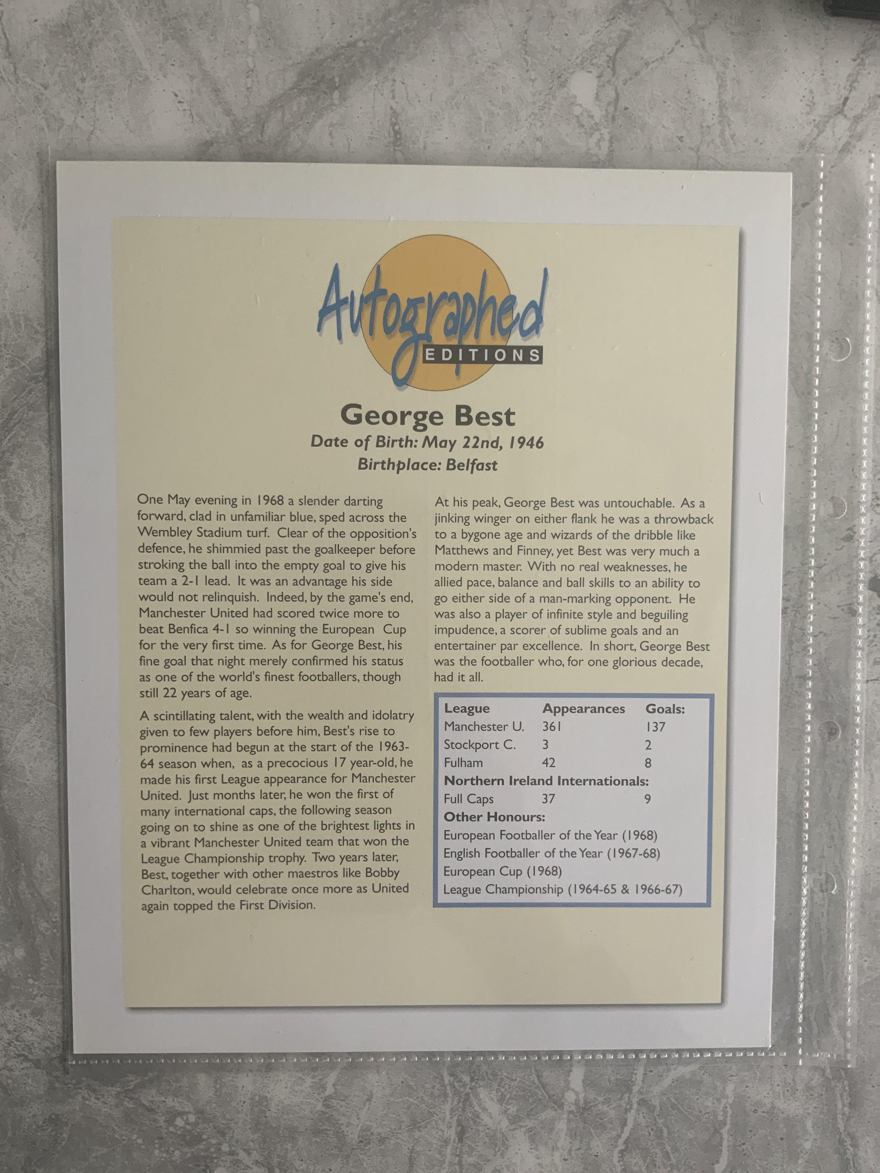 George Best Manchester United Autographed Editions Signed Photo: Stunning large card from reputable company Autographed Editions. Depicts Best in Manchester United kit with a lovely clear undedicated autograph to lower border. Rear has his career details.