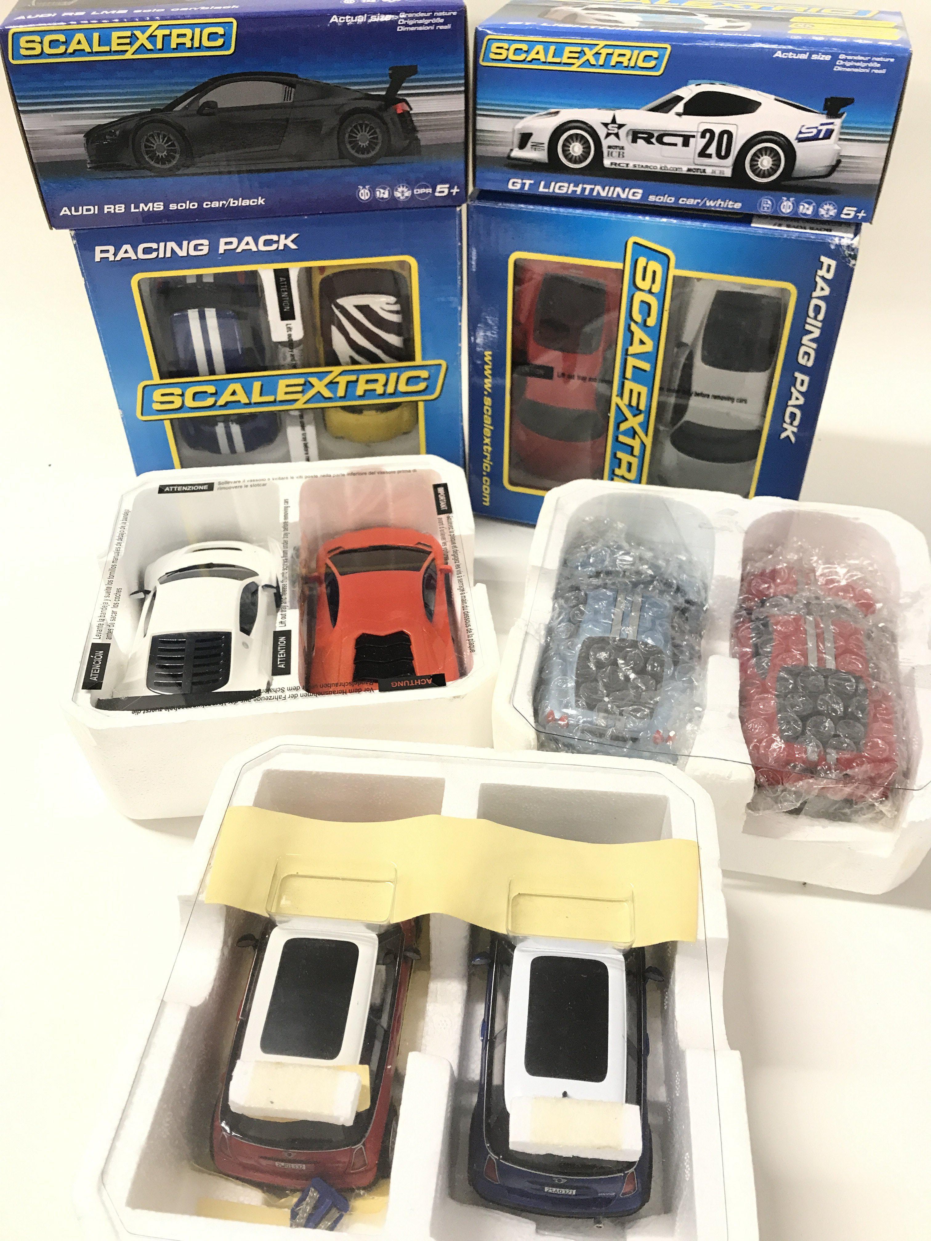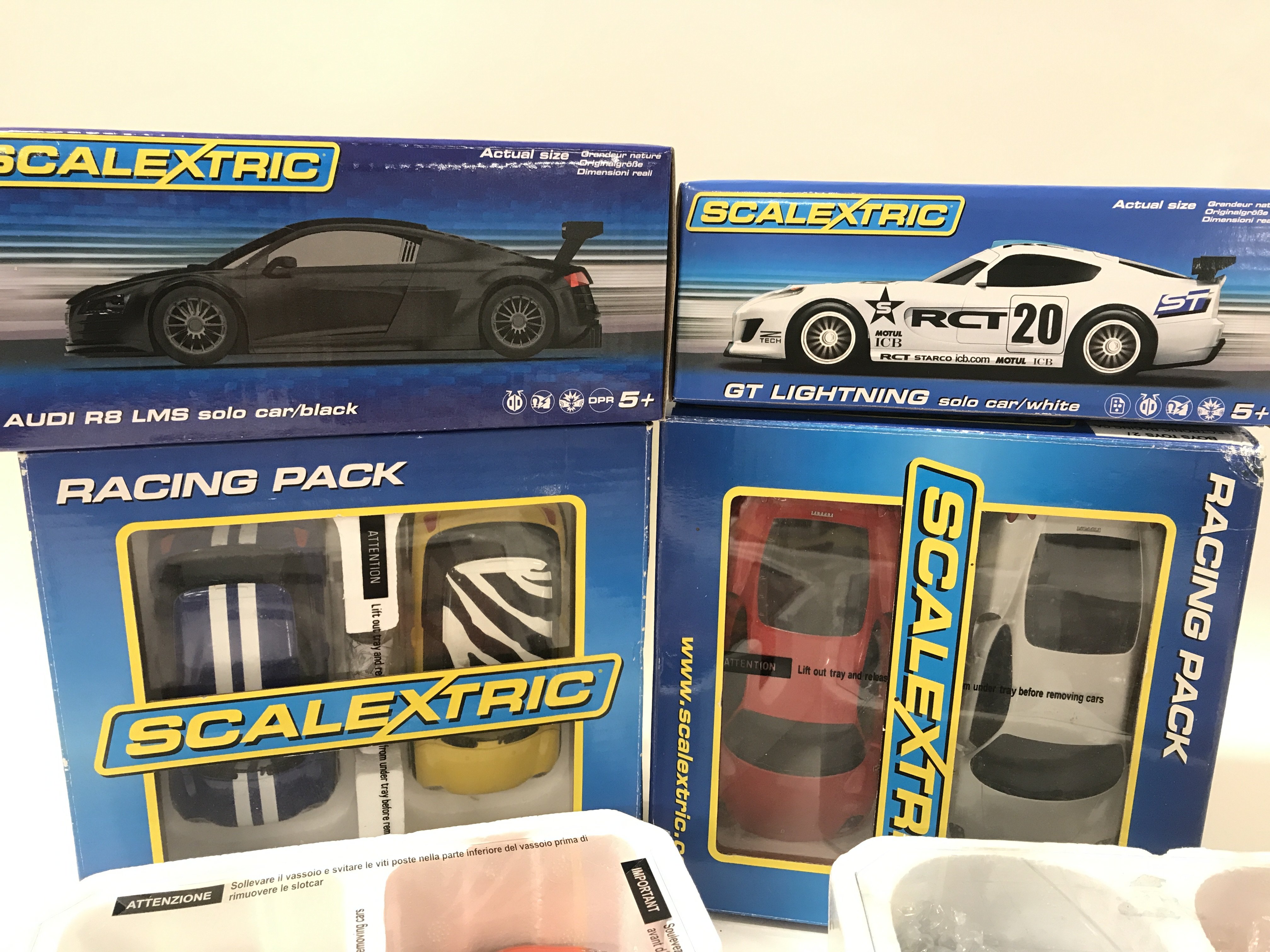 2 X Scalextric Racing Packs. A Boxed Audi R8 LMS. A GT Lightning and other Cars.