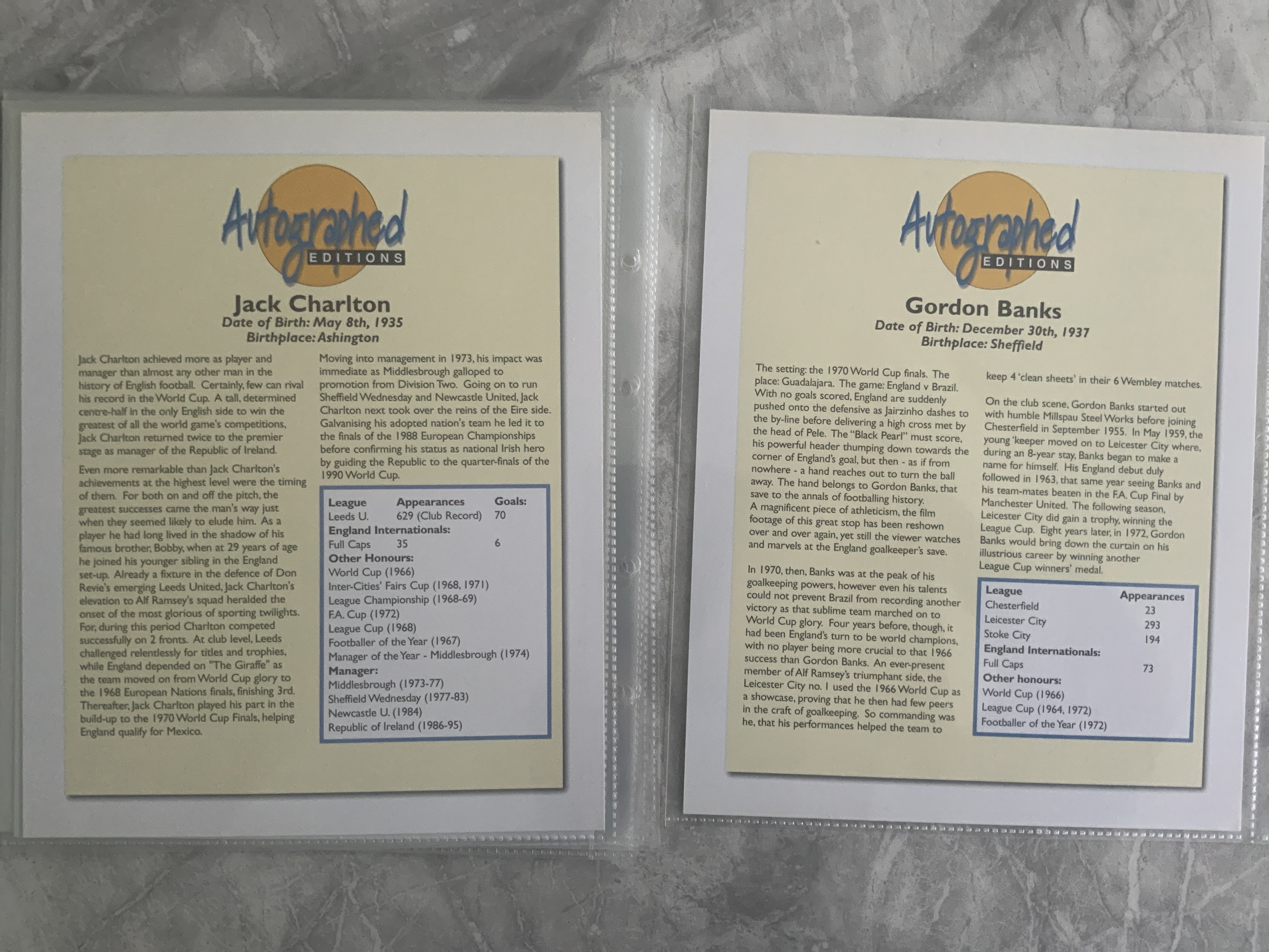 England 1966 World Cup Team Autographed Editions Collection: All 10 players that reputable company Autographed Editions made which each large card having an undedicated autograph to lower border. Bobby Moore sadly was not alive when these were produced so this is all the 10 that were produced from the famous winning final team. (10)