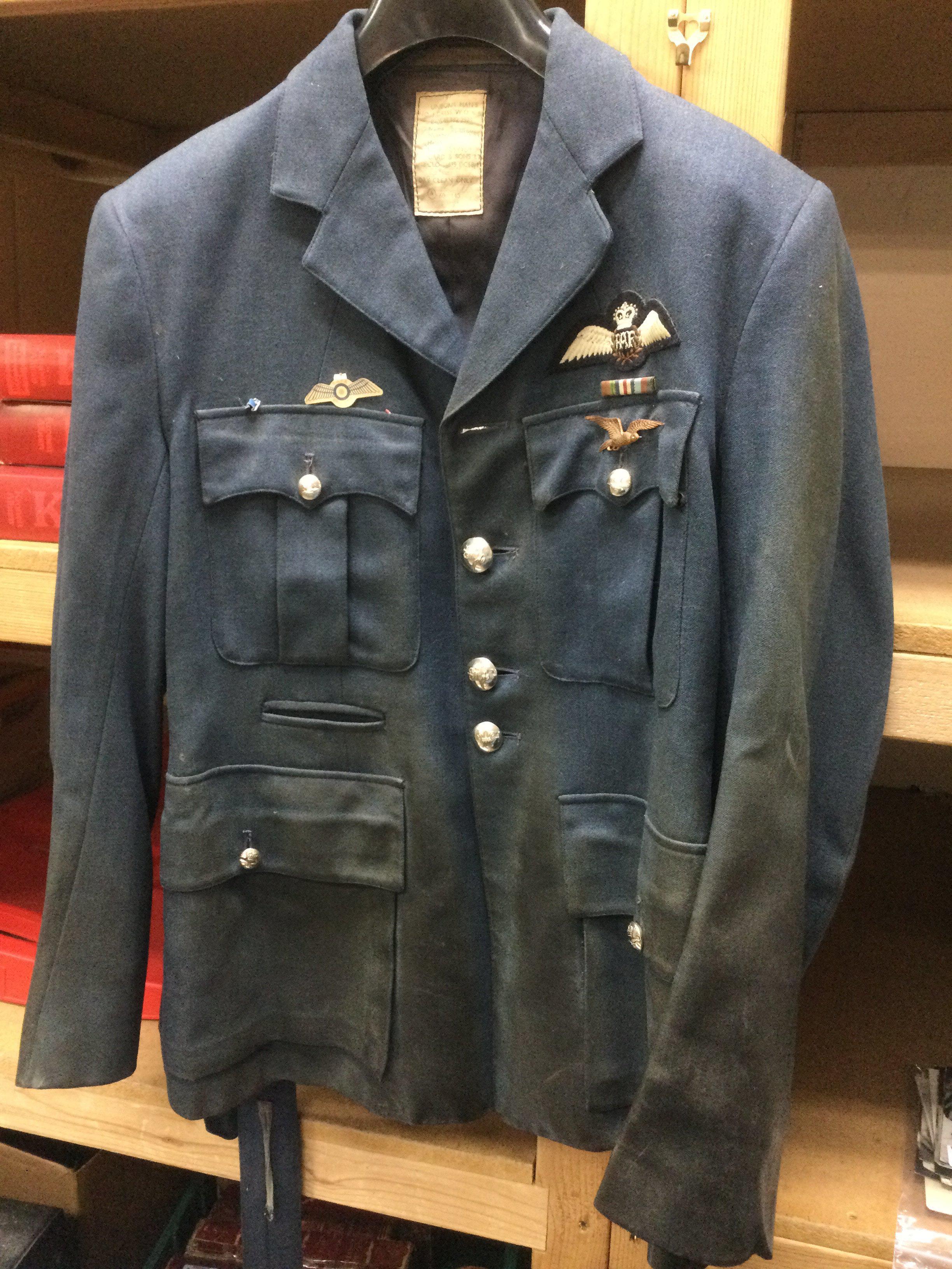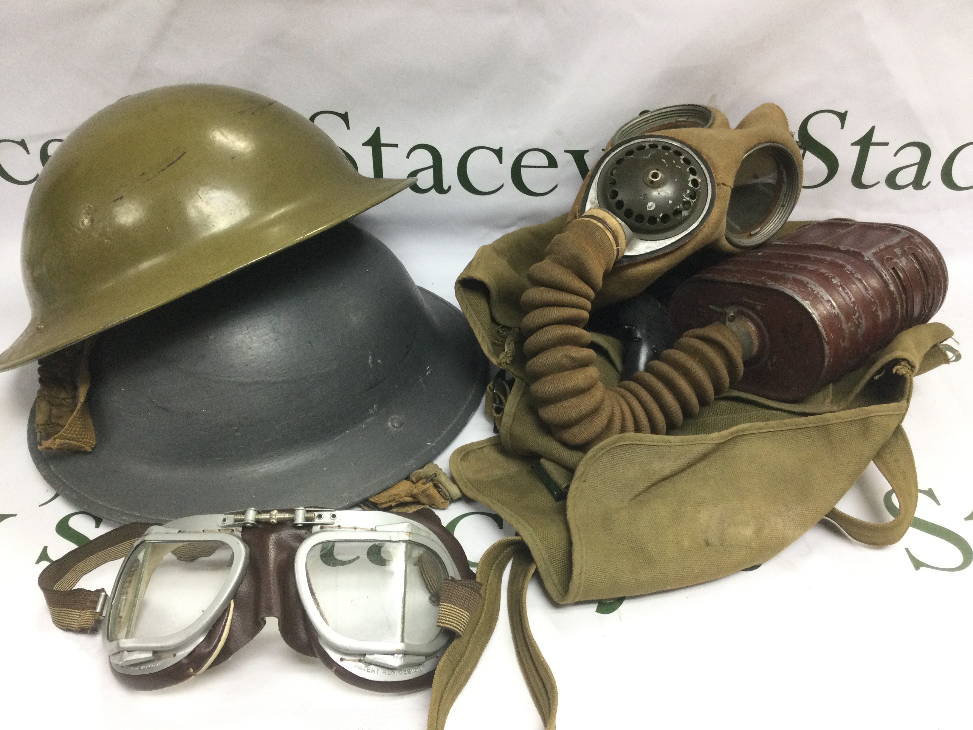 An RAF jacket, two helmets, flying goggles, binoculars and a gas mask. Shipping category D.