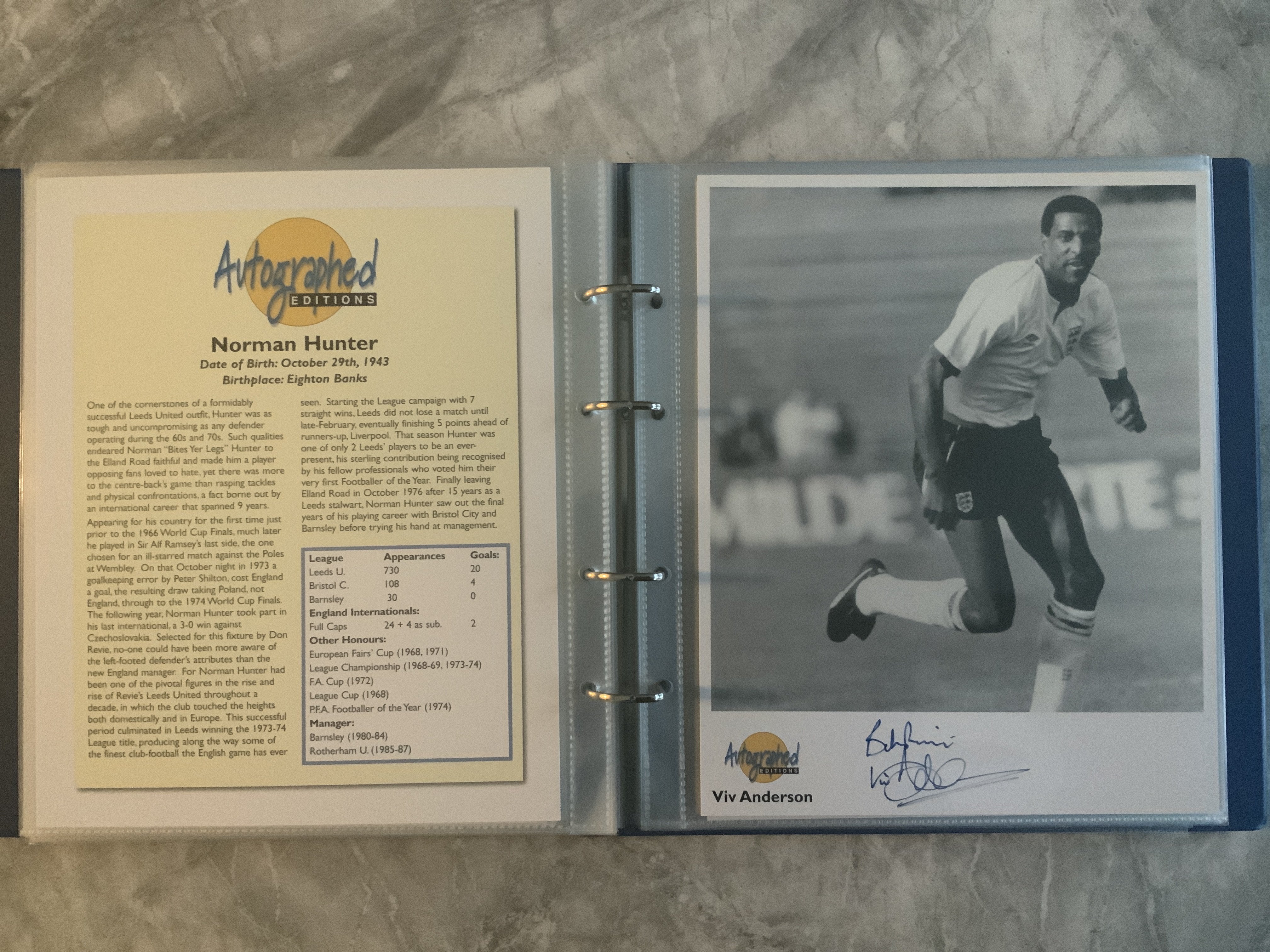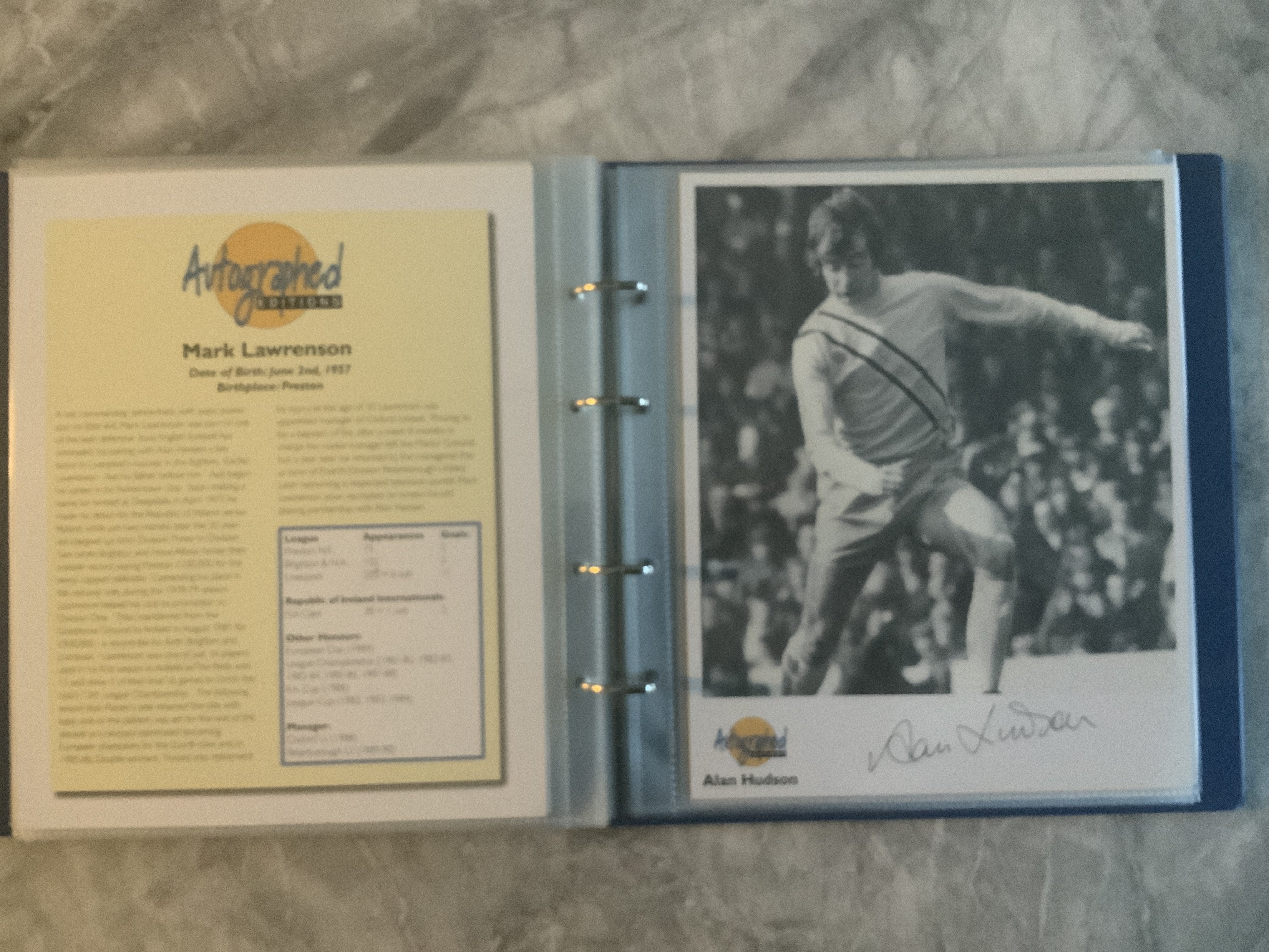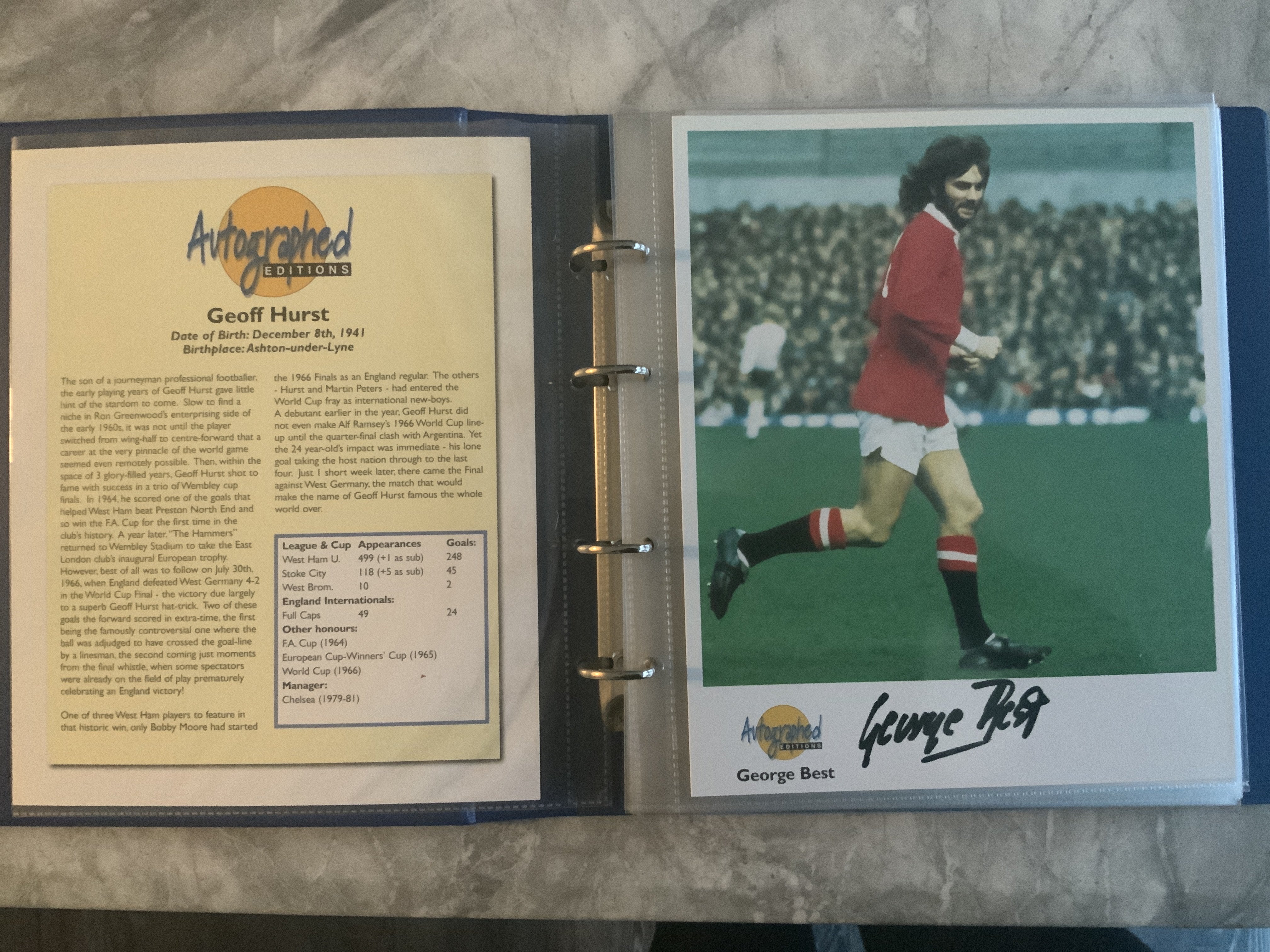 Autographed Editions Signed Football Photo Collection: Contained in 2 original official Autographed Editions folders. Includes George Best Bobby Charlton Geoff Hurst Kenny Sansom Phil Beal Joe Royle Larry Lloyd Archie Gemmill Frank McLintock Tommy Smith Nat Lofthouse Mike Channon Martin Chivers Derek Dougan John Greig Norman Hunter and many more. (81)