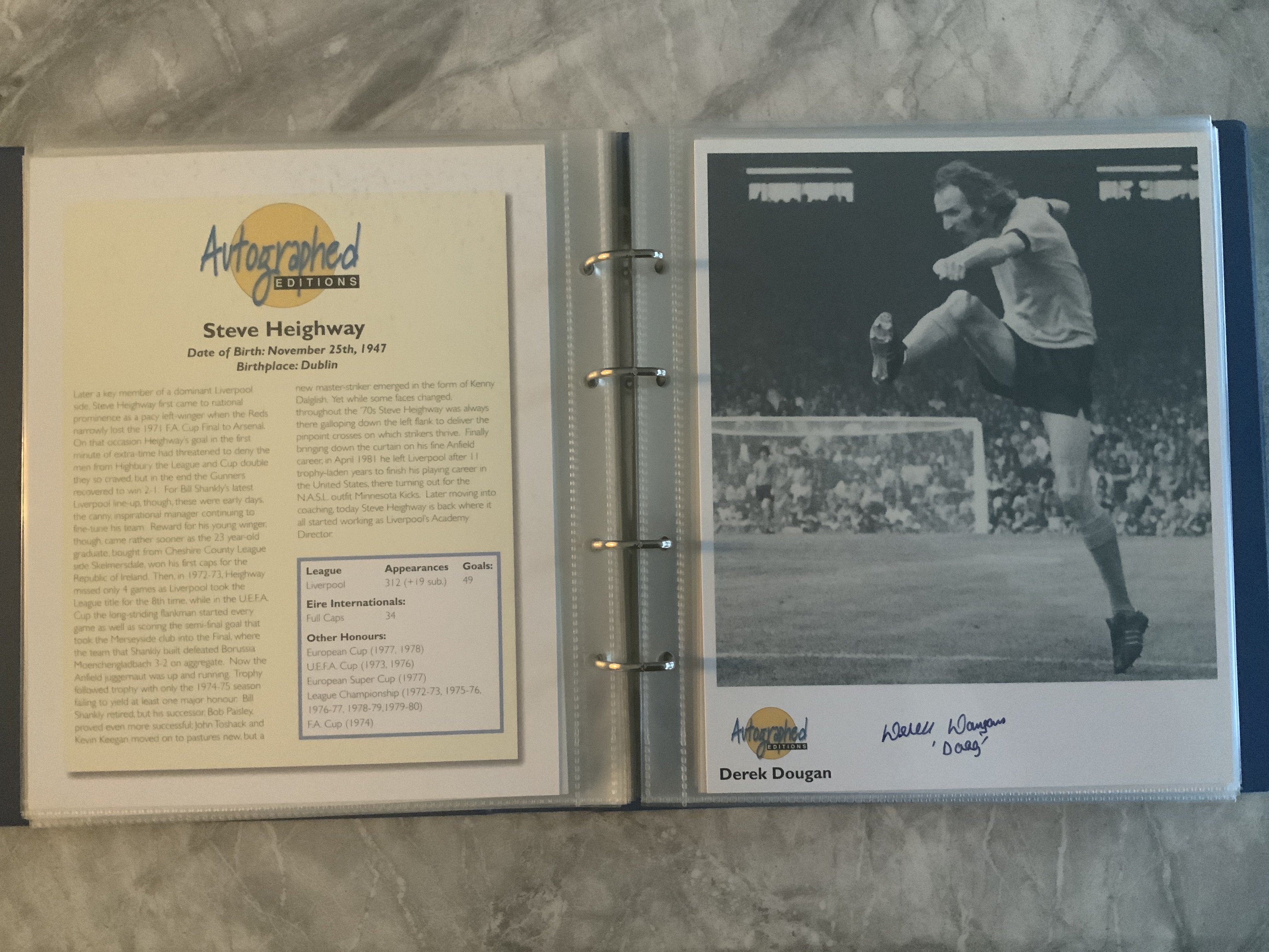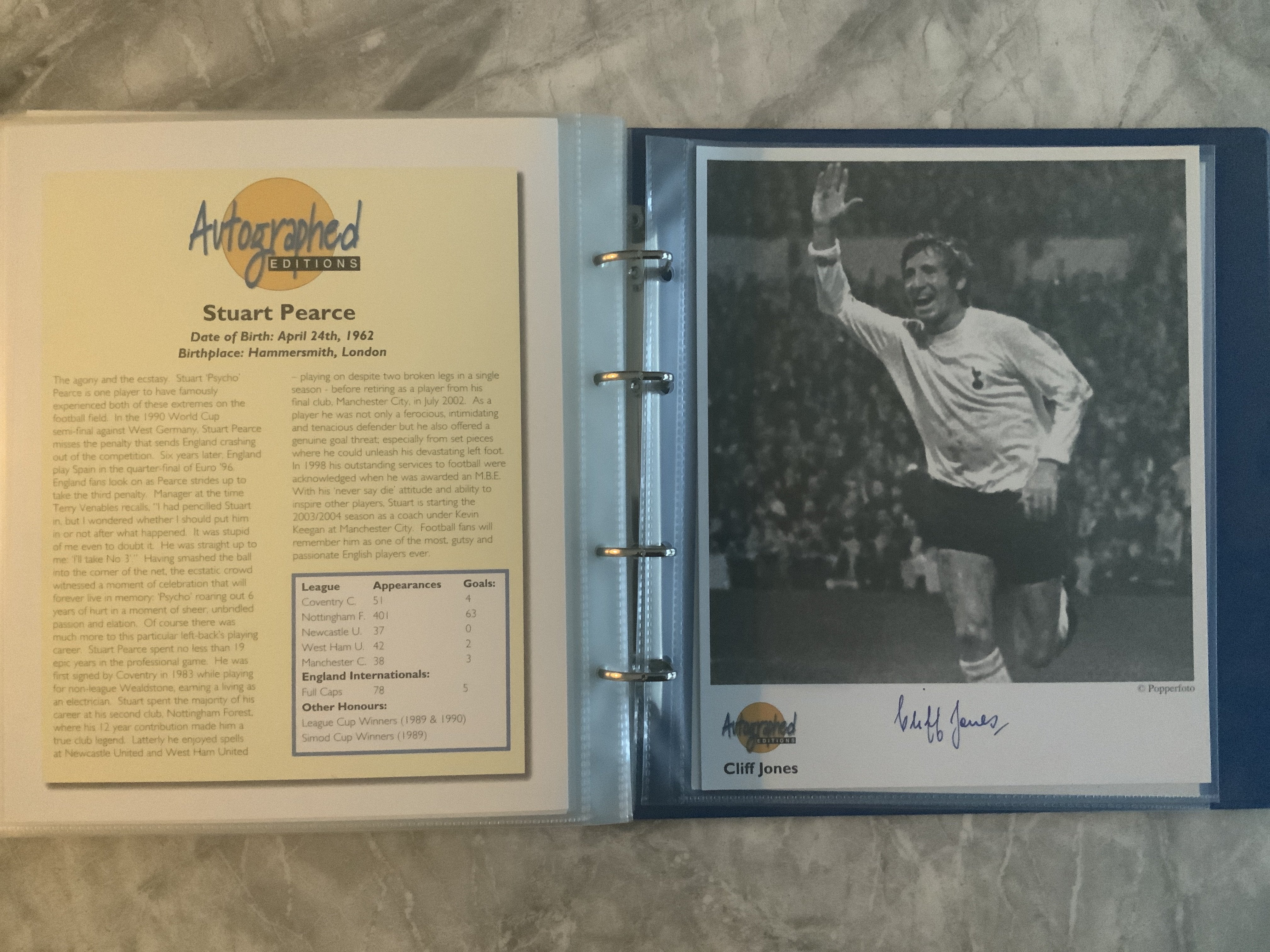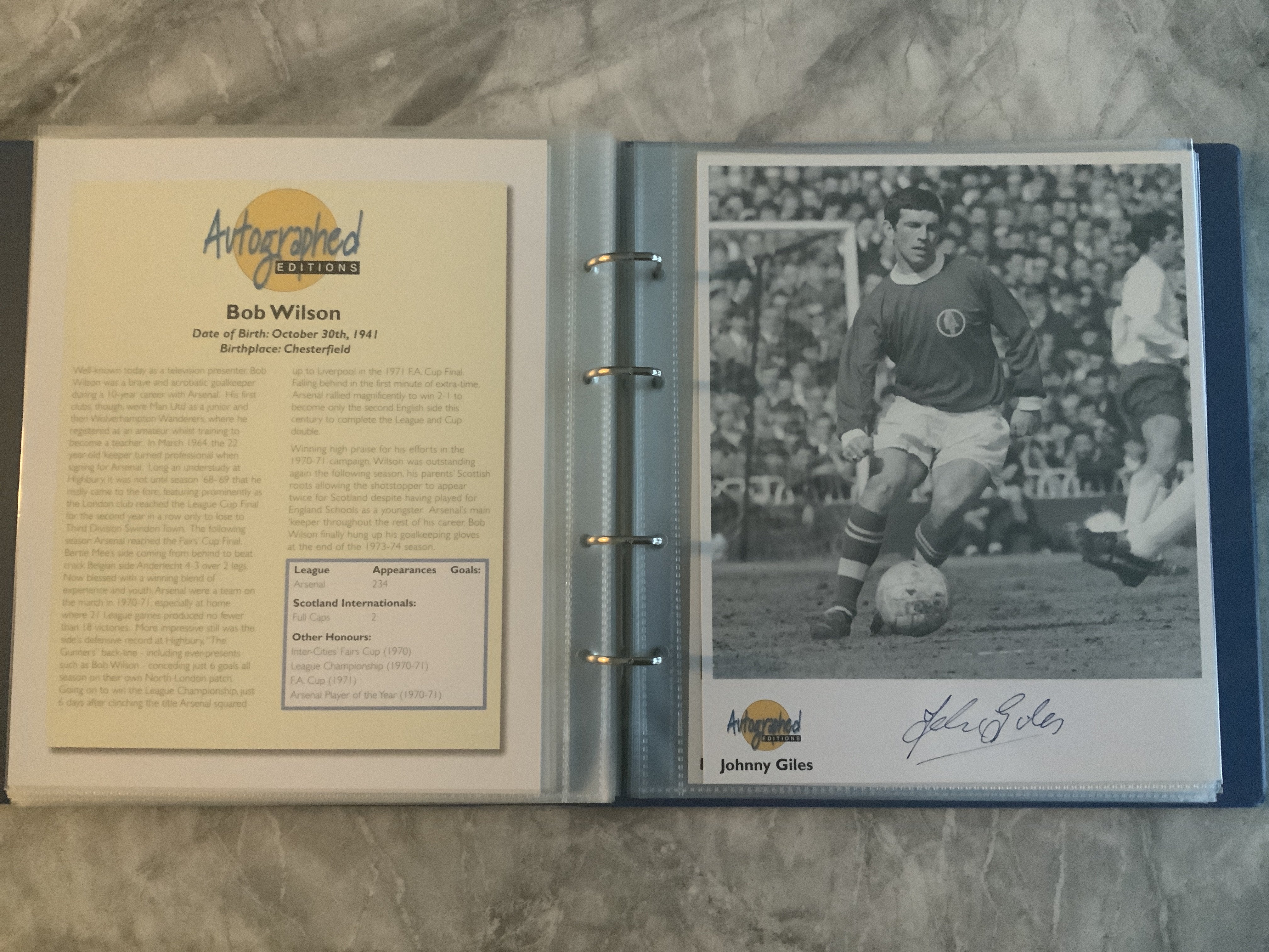 Autographed Editions Signed Football Photo Collection: Contained in 2 original official Autographed Editions folders. Includes George Best Bobby Charlton Geoff Hurst Kenny Sansom Phil Beal Joe Royle Larry Lloyd Archie Gemmill Frank McLintock Tommy Smith Nat Lofthouse Mike Channon Martin Chivers Derek Dougan John Greig Norman Hunter and many more. (81)