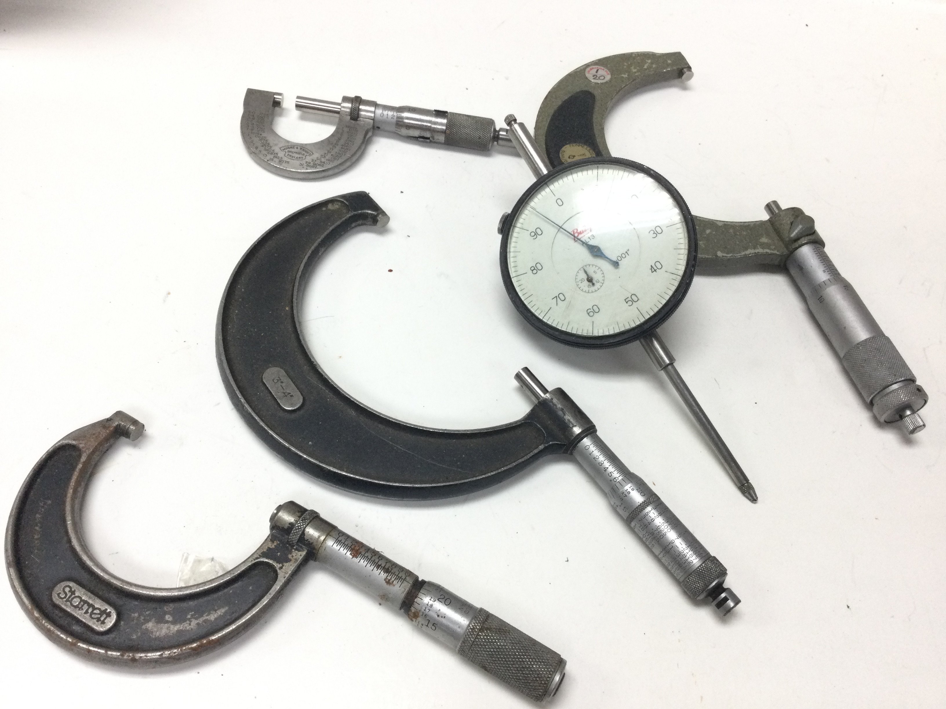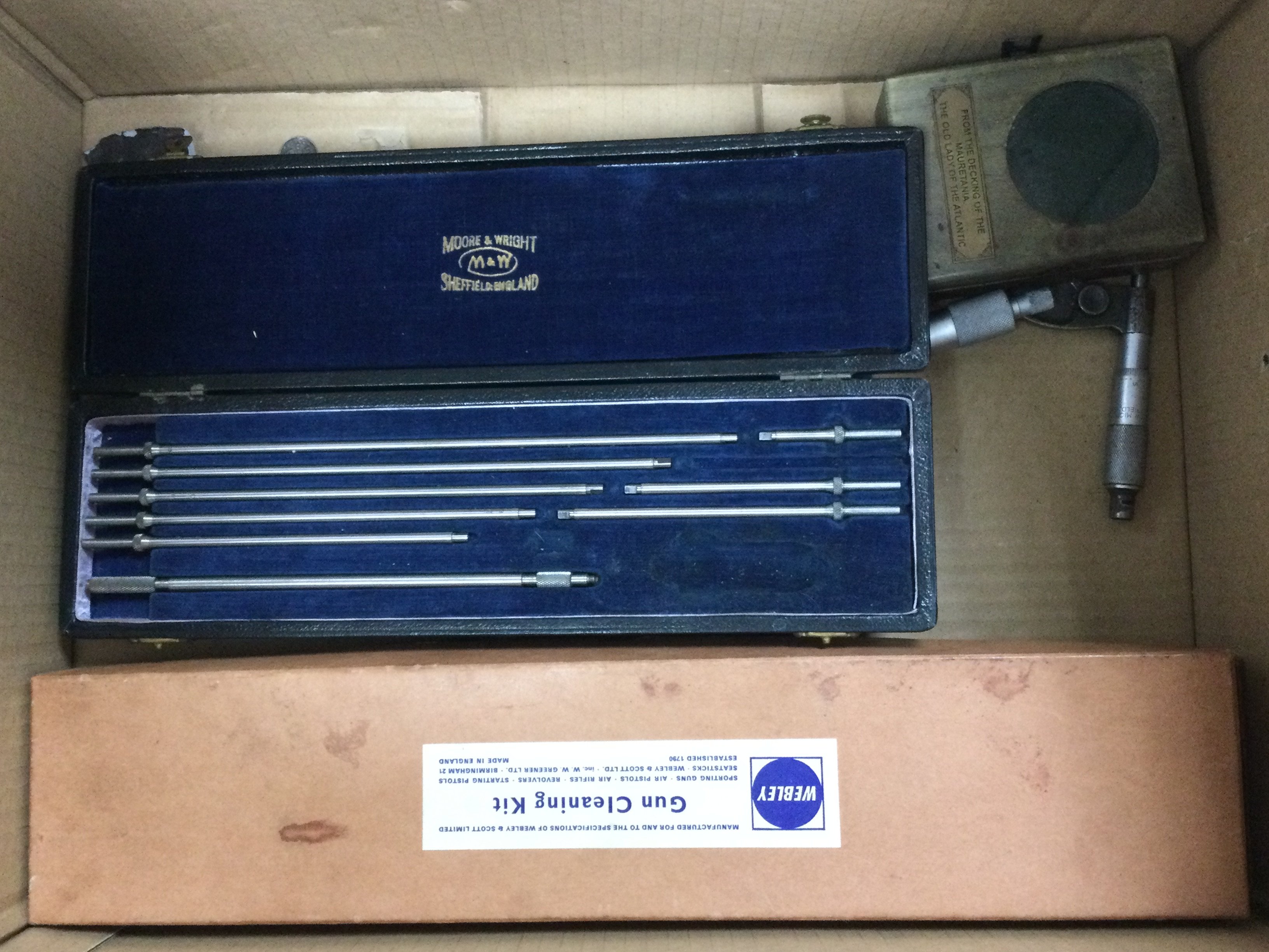 A collection of micrometers including Starrett, Moore & Wright etc. also including some other items including an AA badge, gun cleaning kit etc