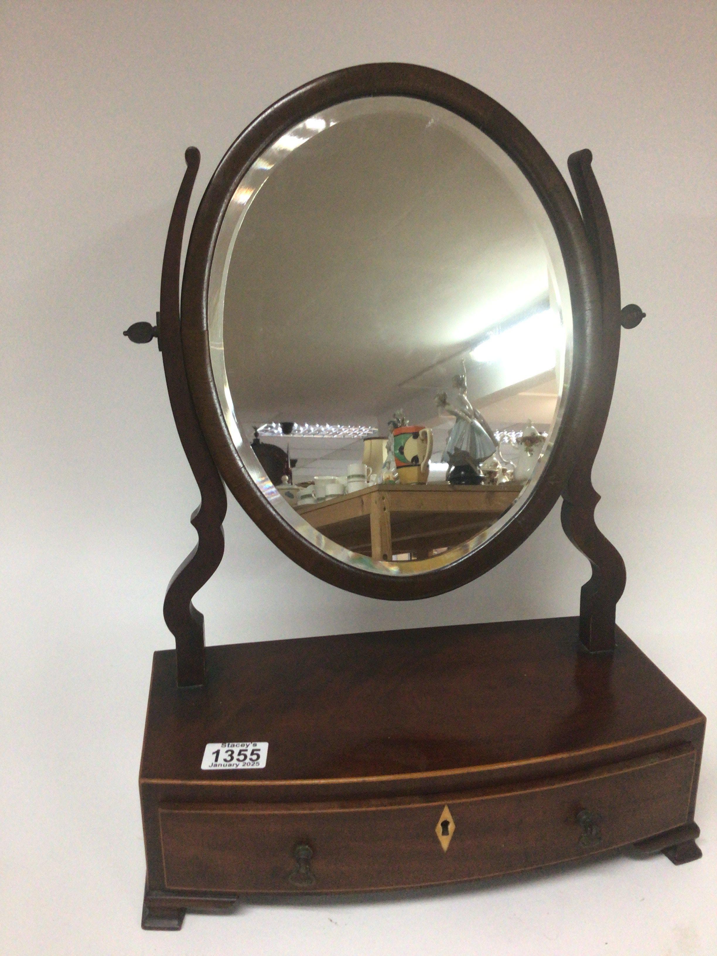 A late George III mahogany dressing mirror with an oval mirror above a single drawer on ogee bracket feet.