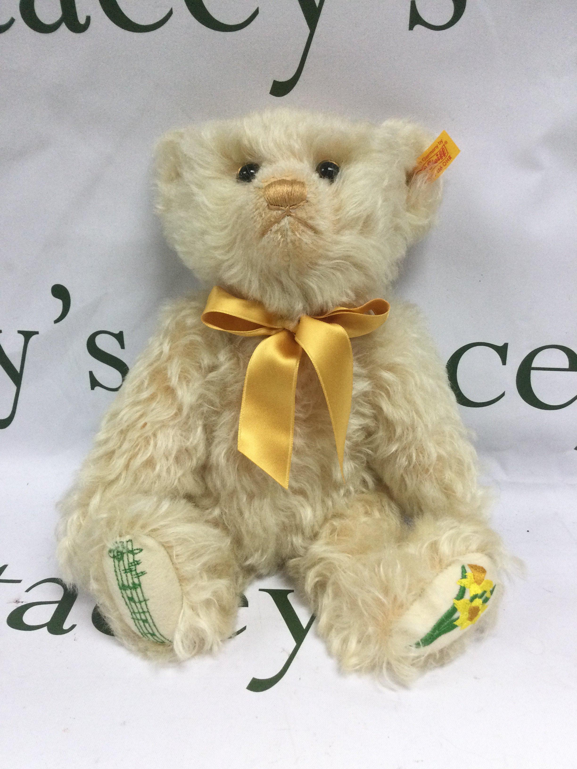 A boxed Steiff bear, daffodil and music and notation detail on feet, approx 30cm. Shipping category B.