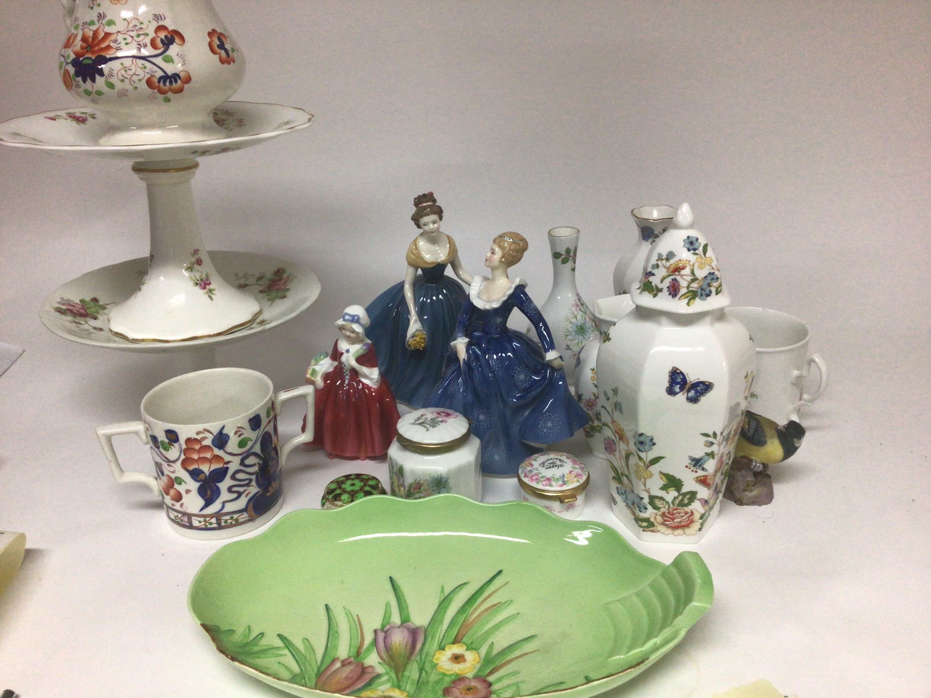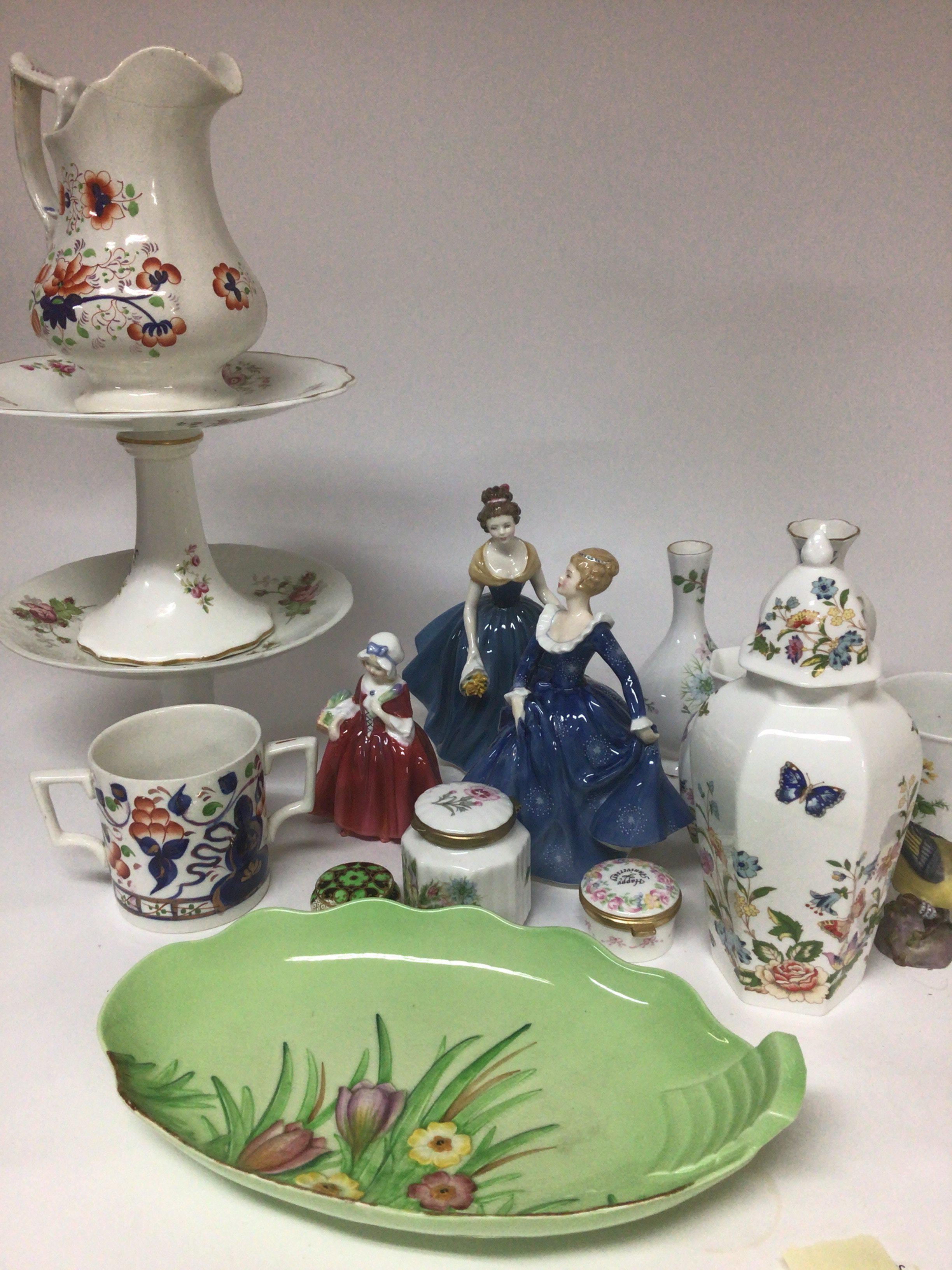Three Royal Doulton figures a collection of Aynsley porcelain and other ceramics.